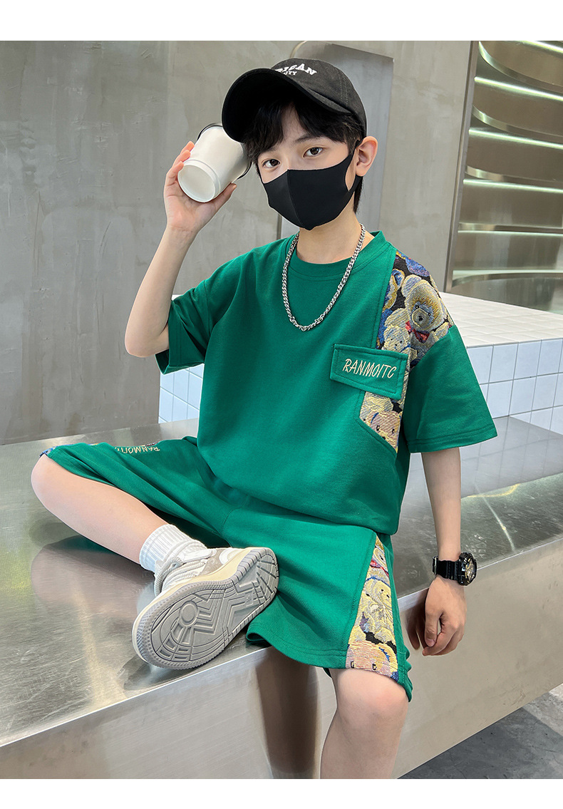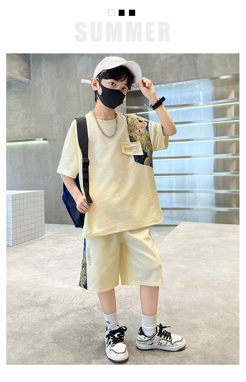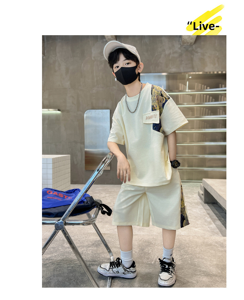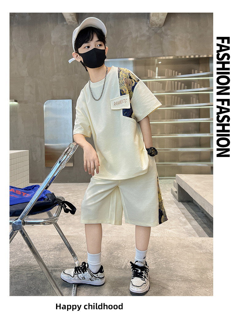 男童拼接套装夏季新款2024中大童潮酷帅气夏天薄款T恤短裤两件套t