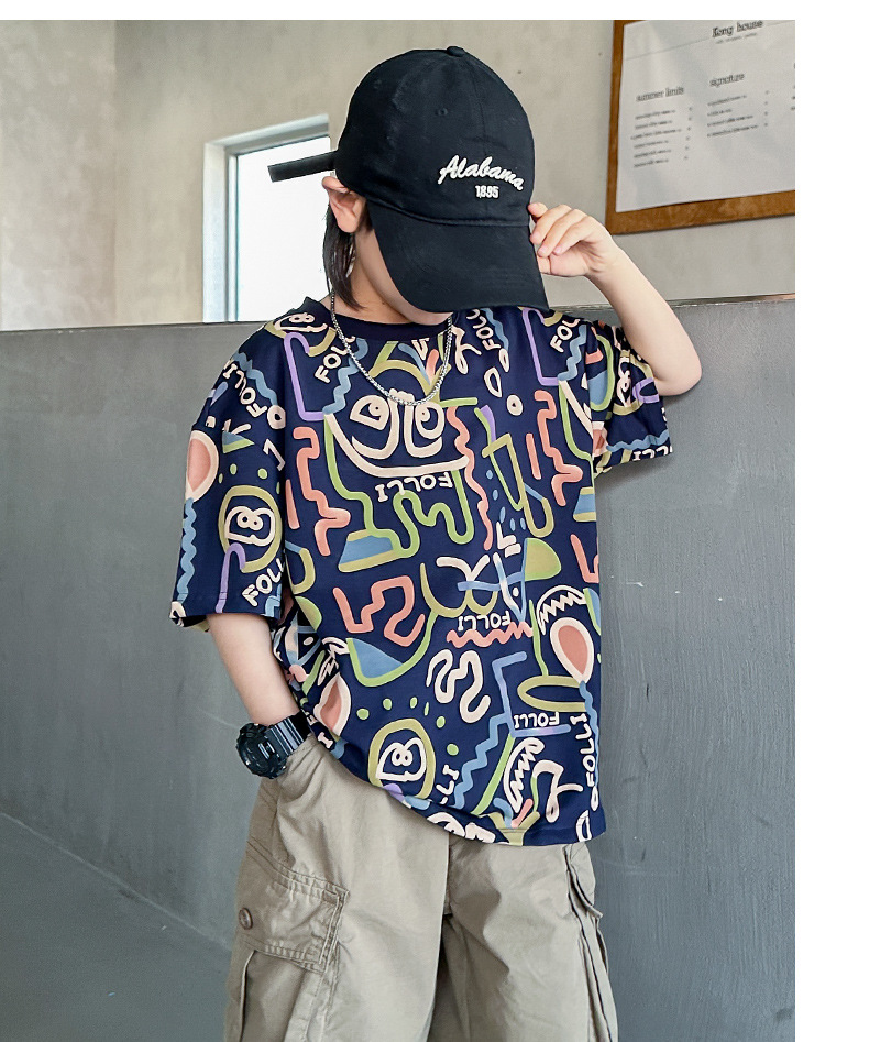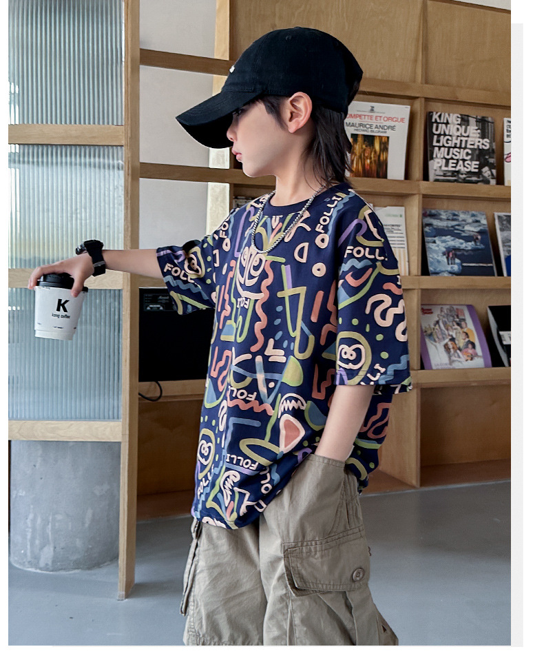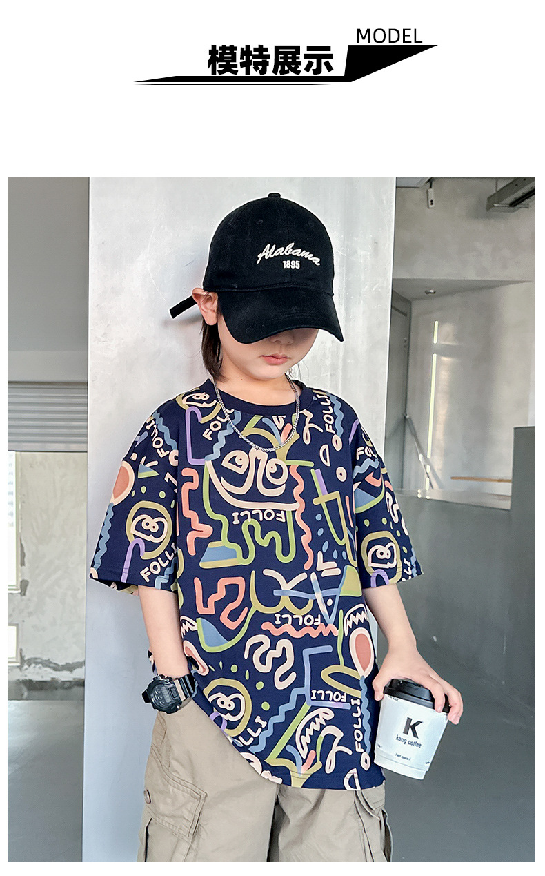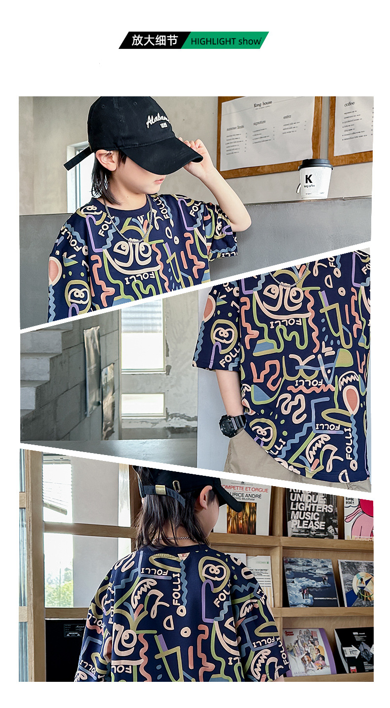 男童满印涂鸦短袖T恤夏款2024新款中大童儿童体恤洋气男孩上衣潮t
