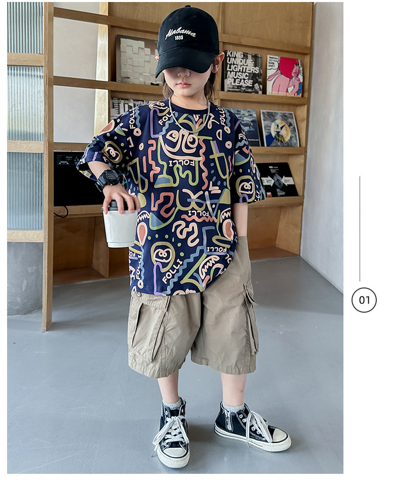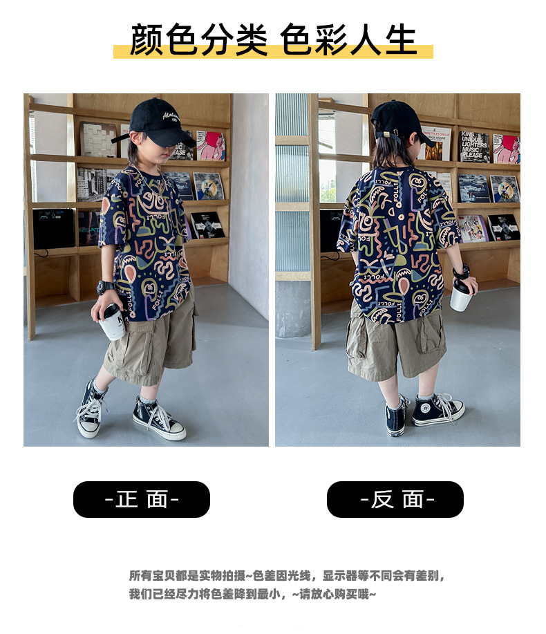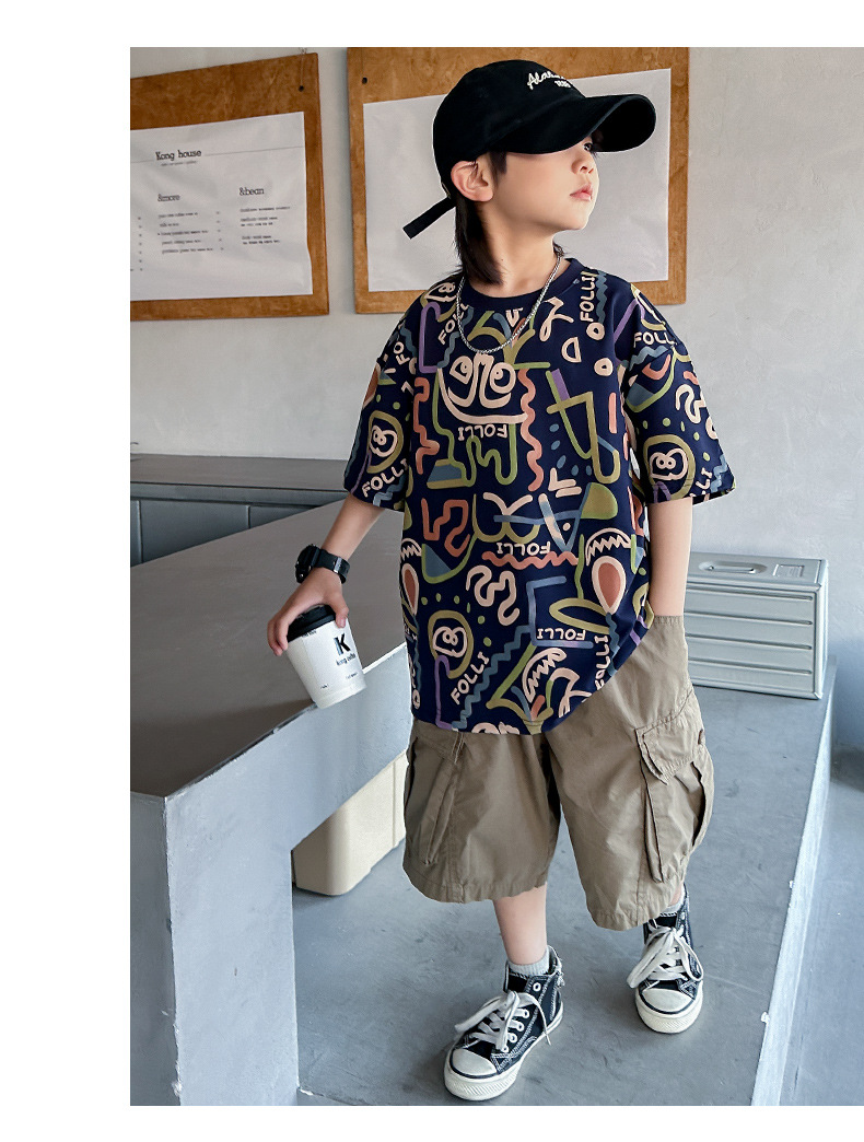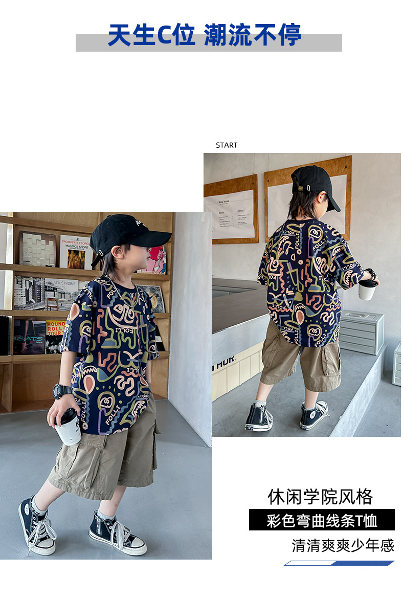 男童满印涂鸦短袖T恤夏款2024新款中大童儿童体恤洋气男孩上衣潮t