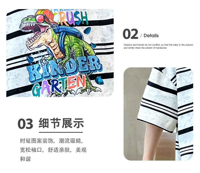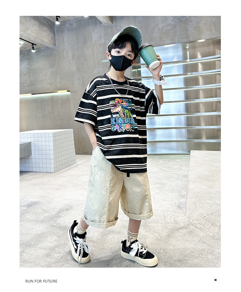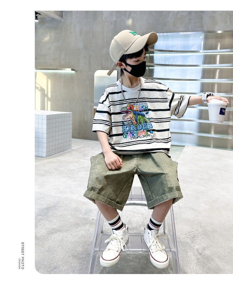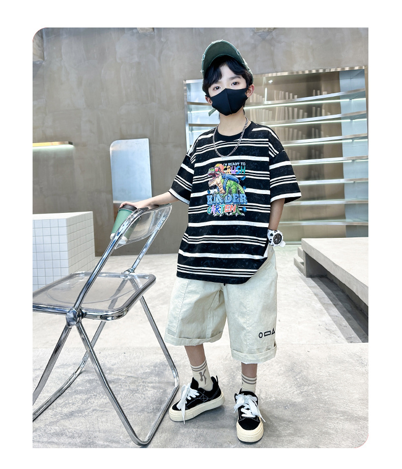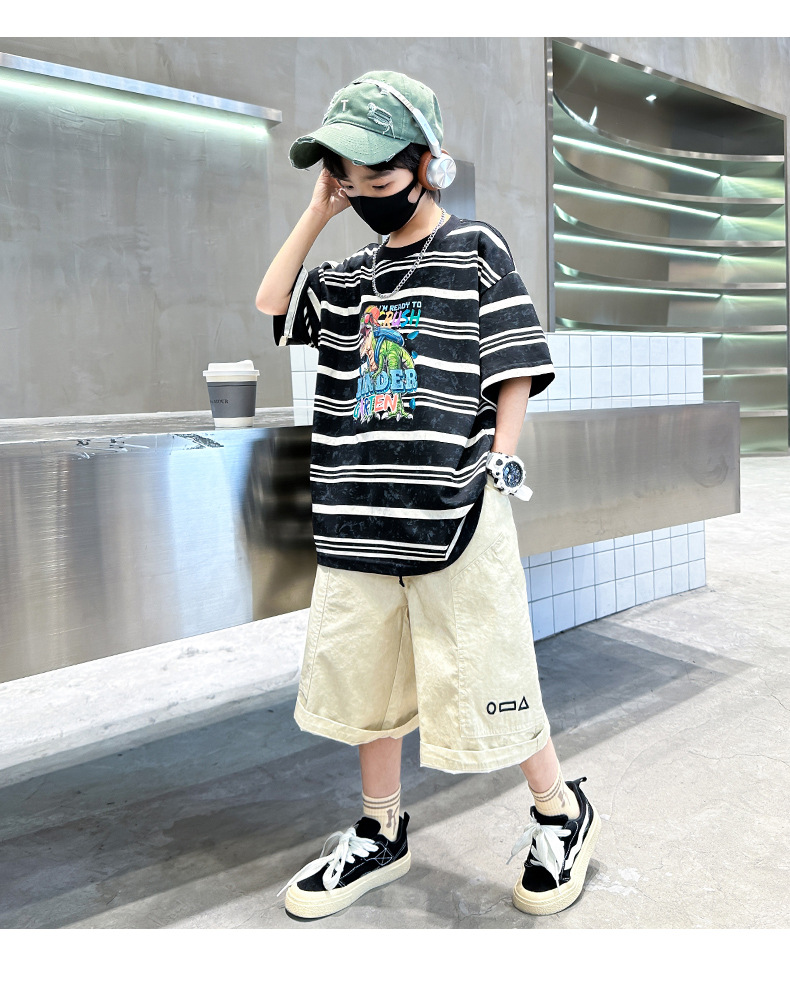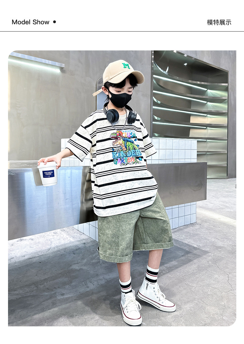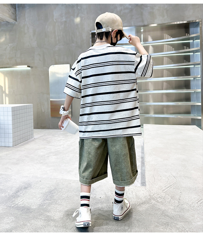 男童条纹潮童套装夏季新款2024中大童男孩潮酷休闲帅气短袖衣服薄