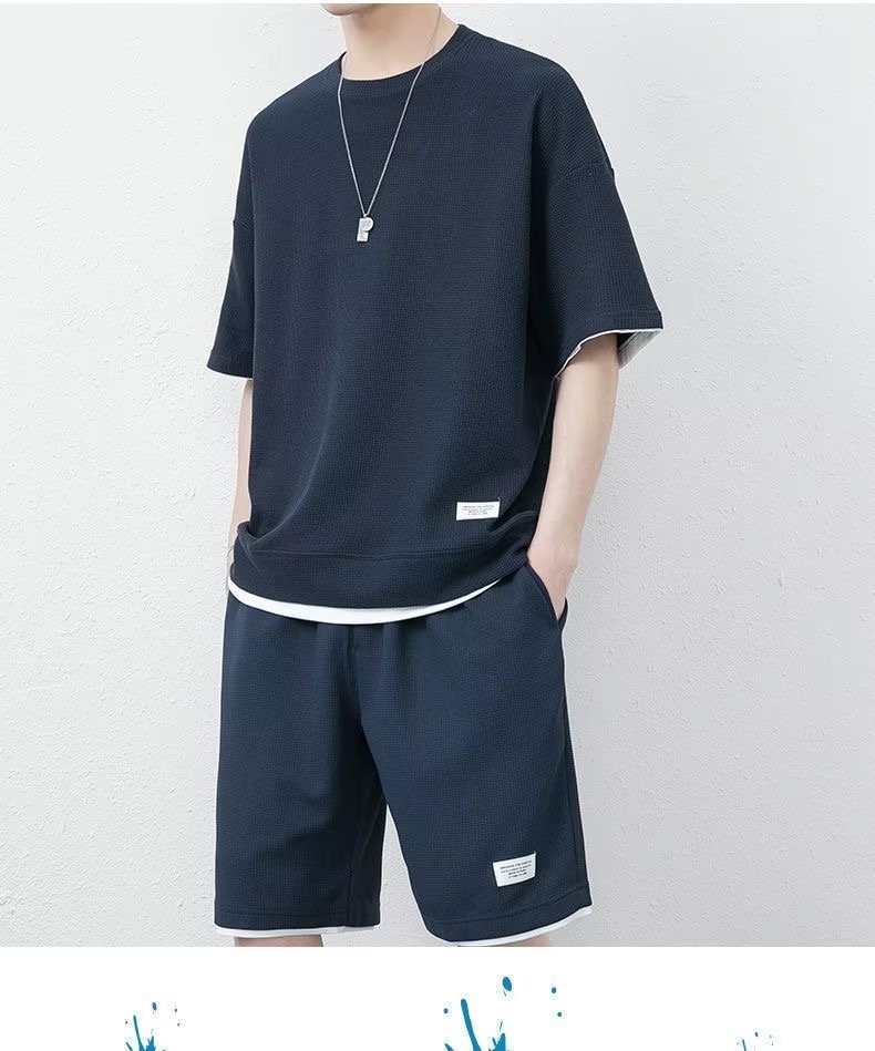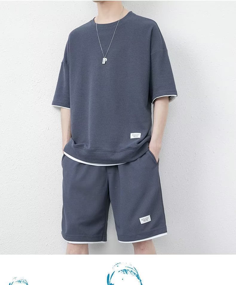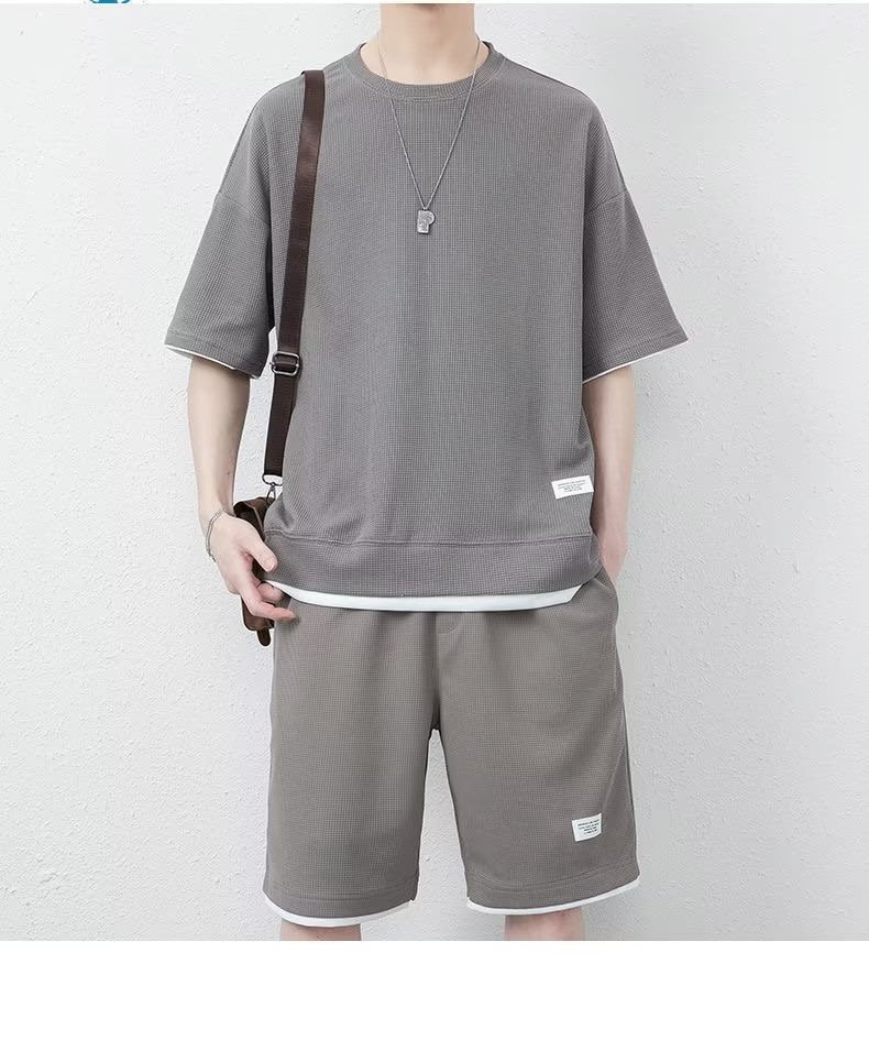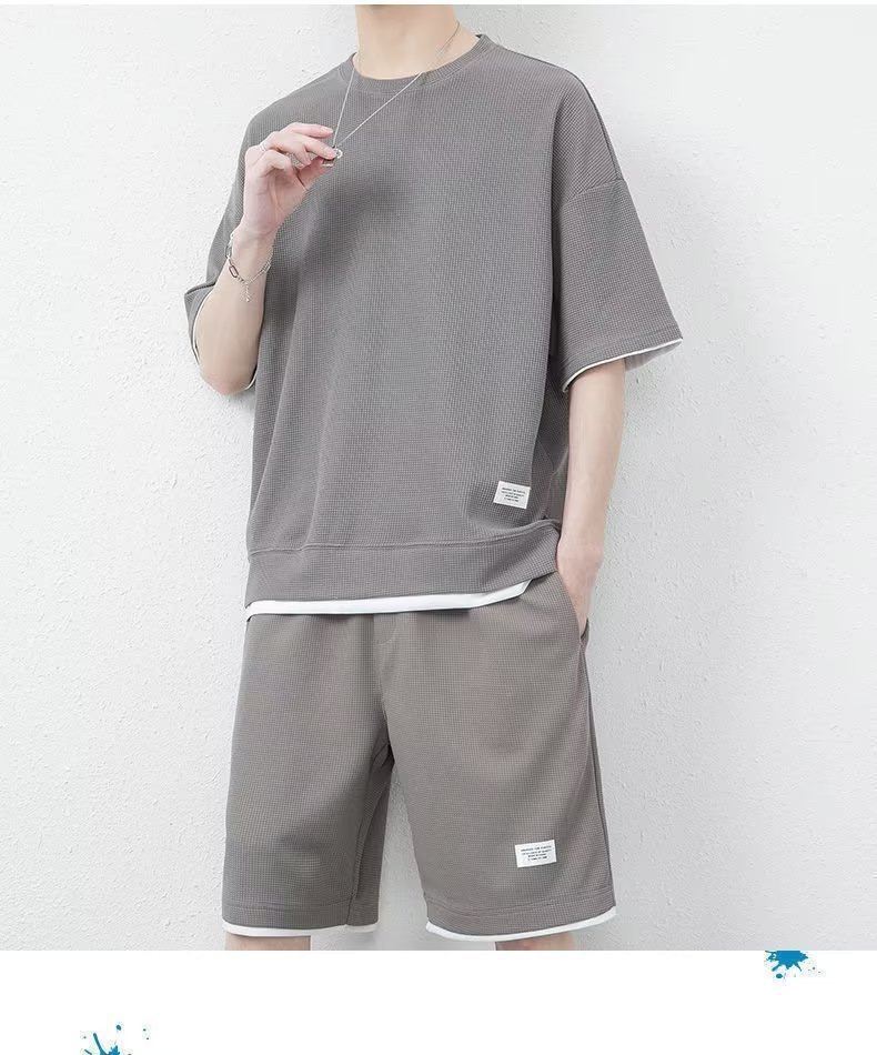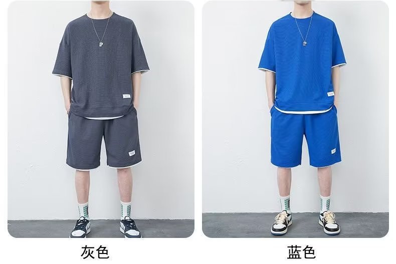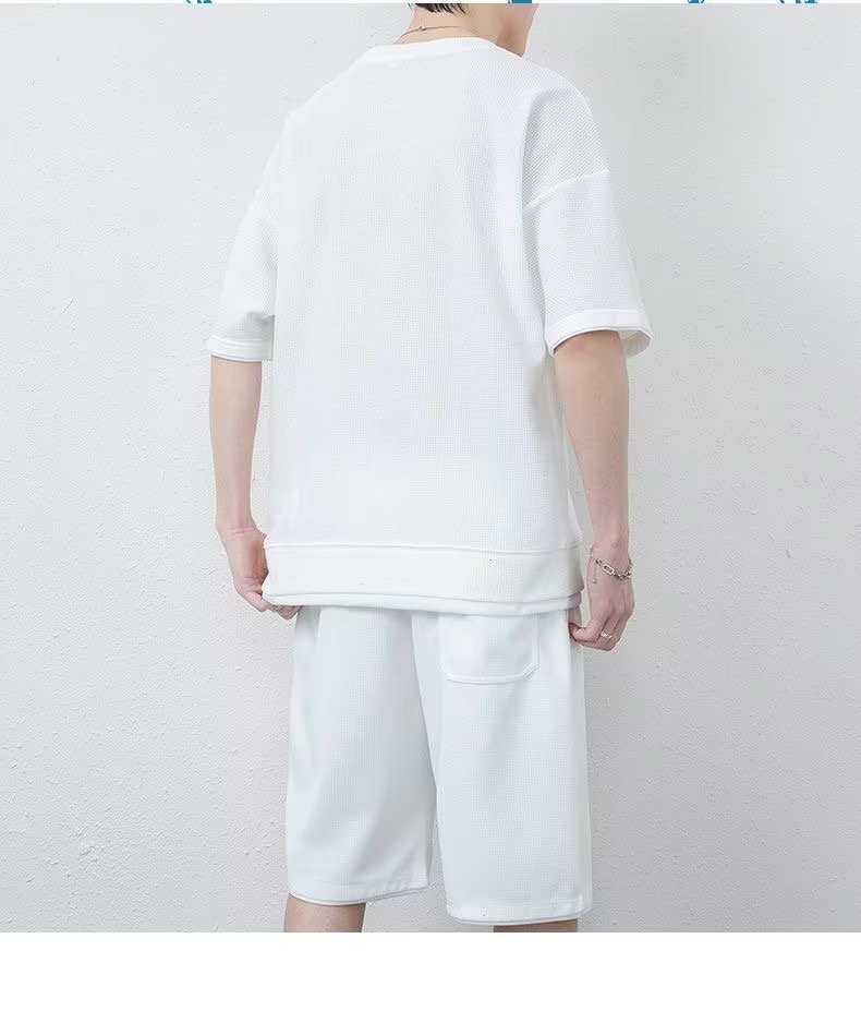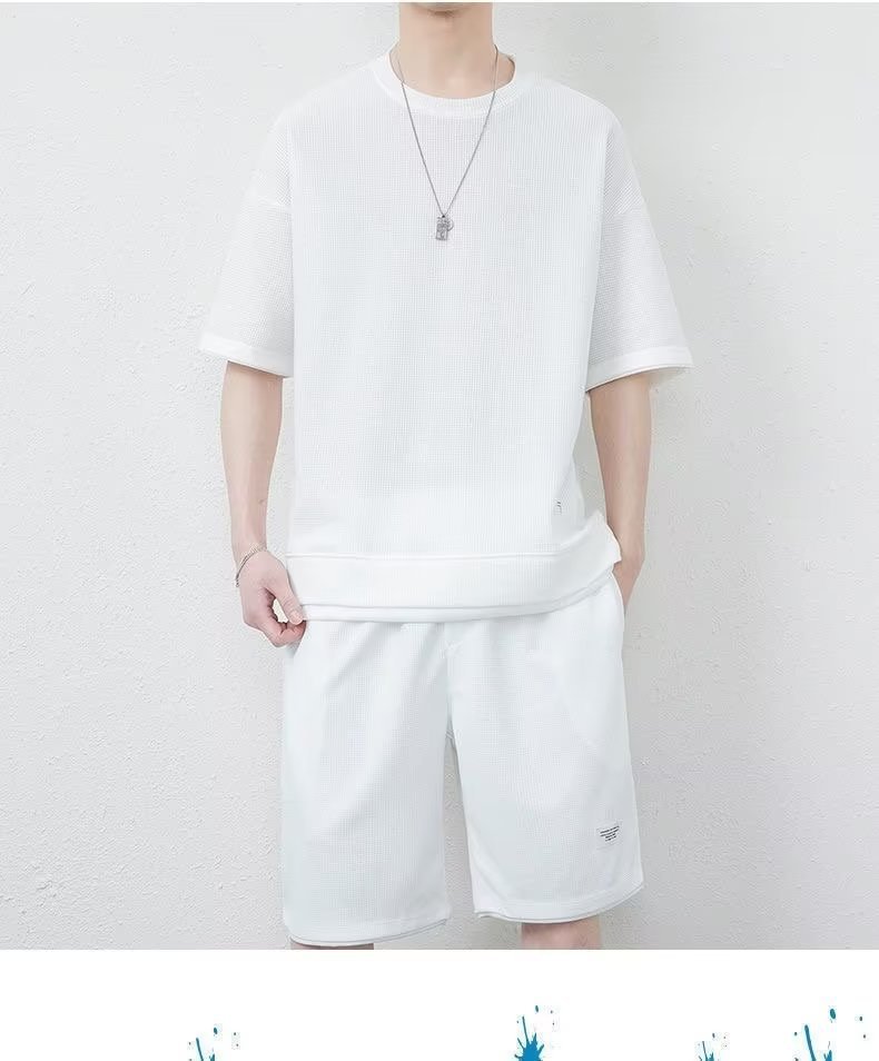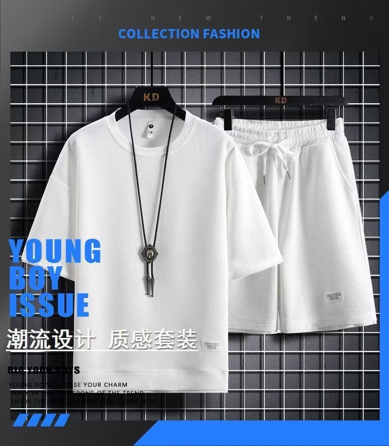 休闲运动套装男夏季冰感潮流宽松华夫格短袖短裤一套衣服帅气搭配