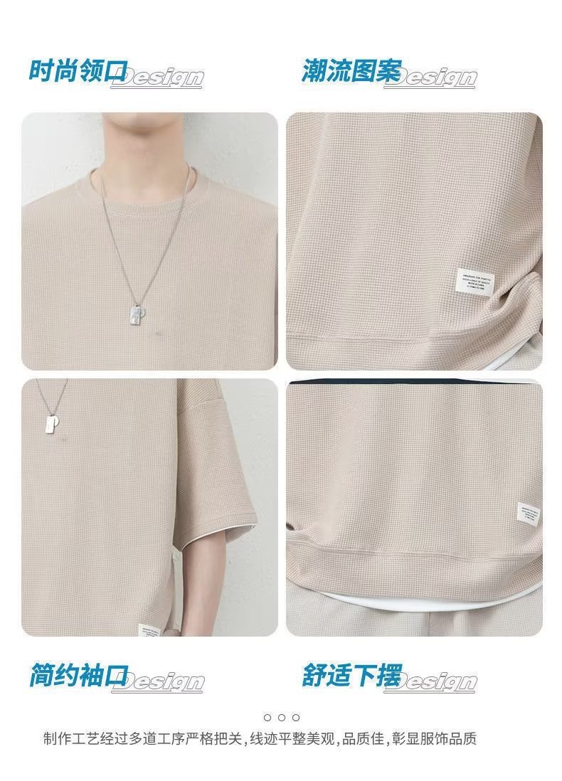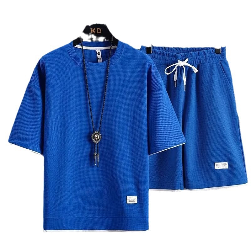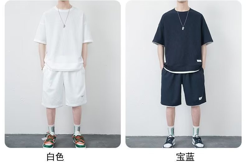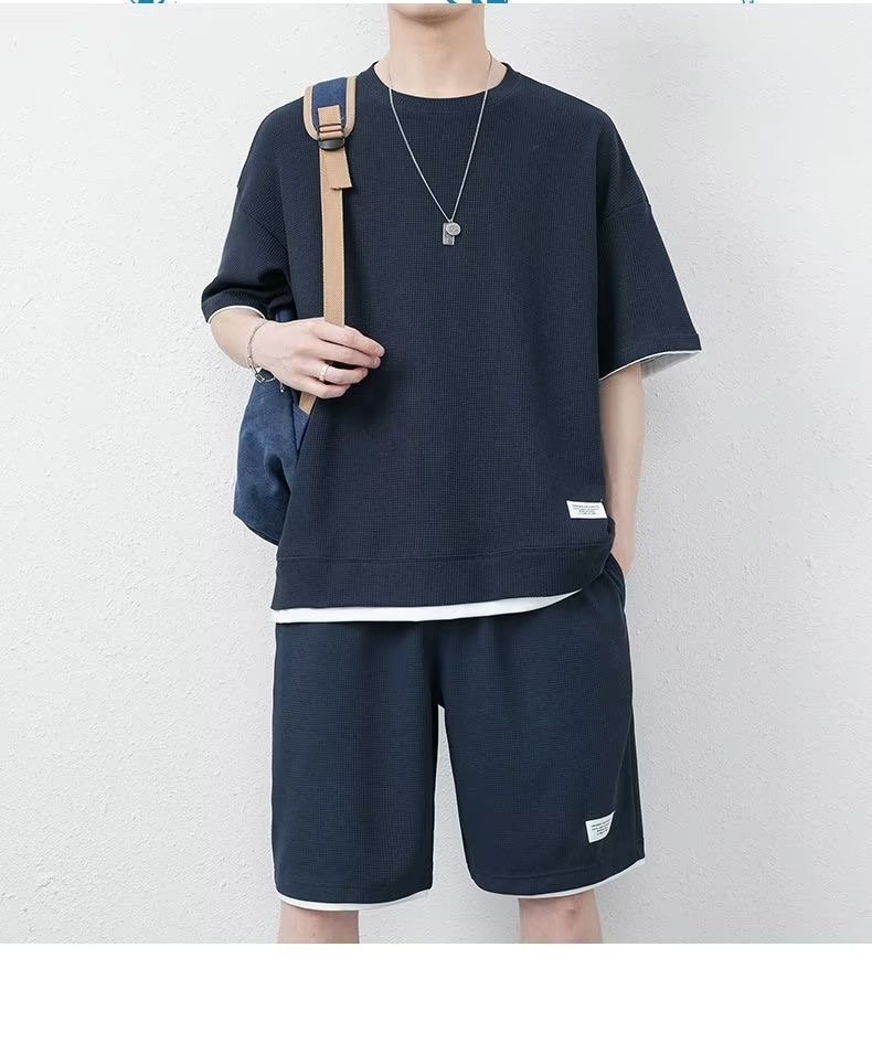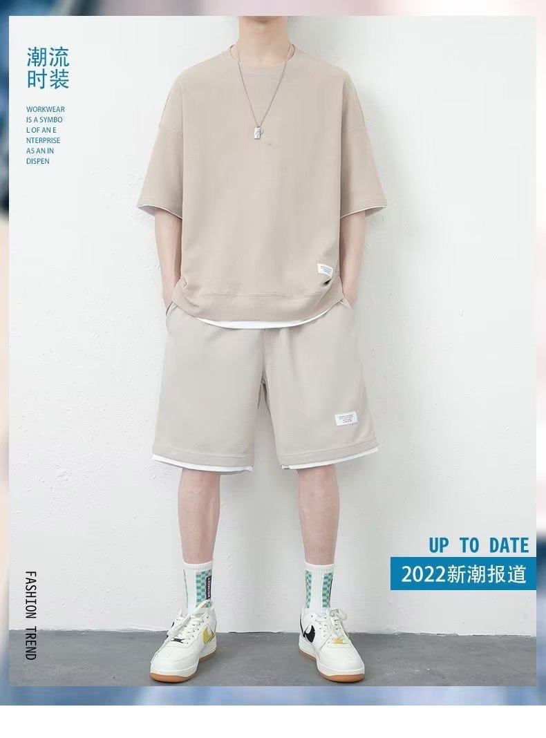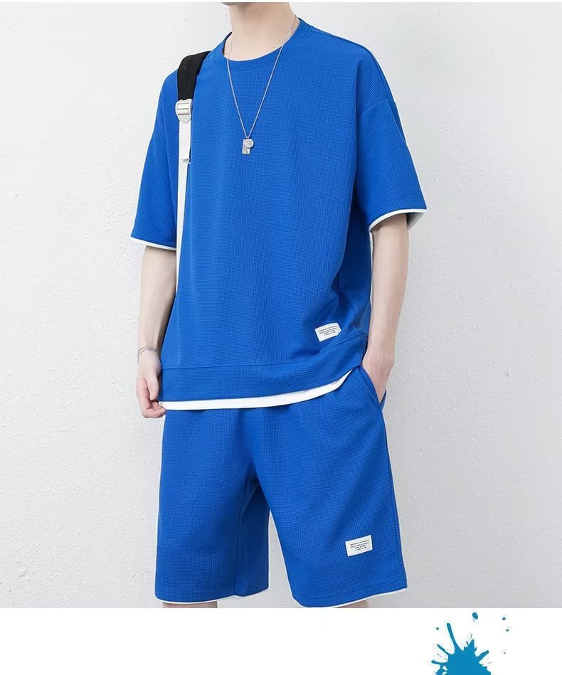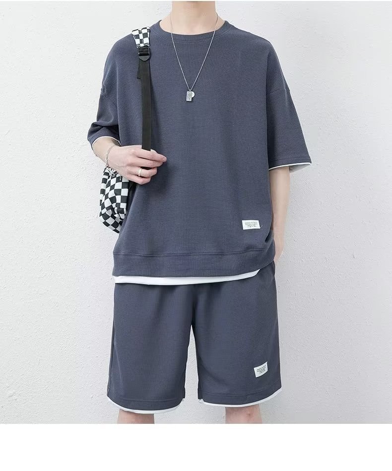 休闲运动套装男夏季冰感潮流宽松华夫格短袖短裤一套衣服帅气搭配