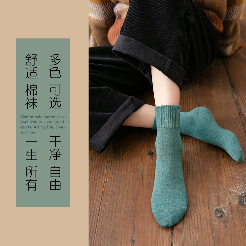 春秋季纯棉中筒袜女纯色复古保暖新款袜子糖果色女士休闲长罗口袜