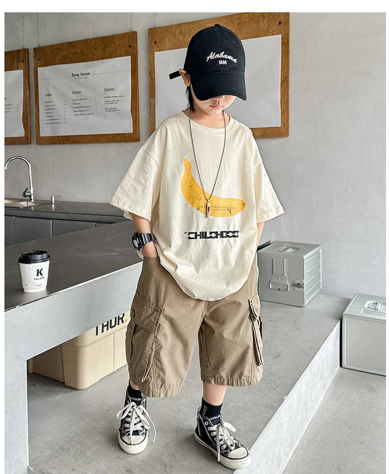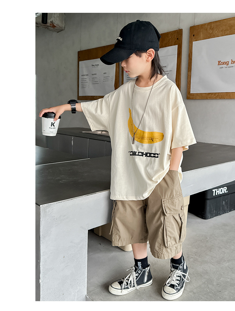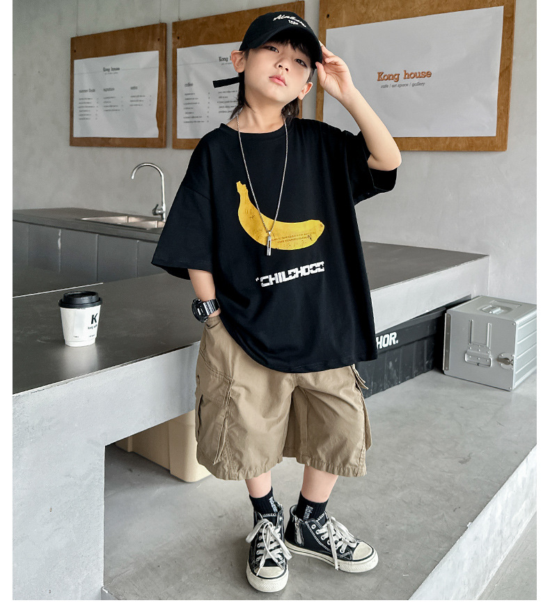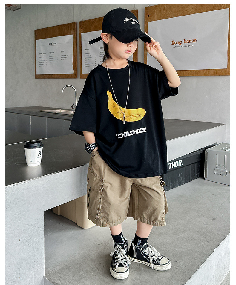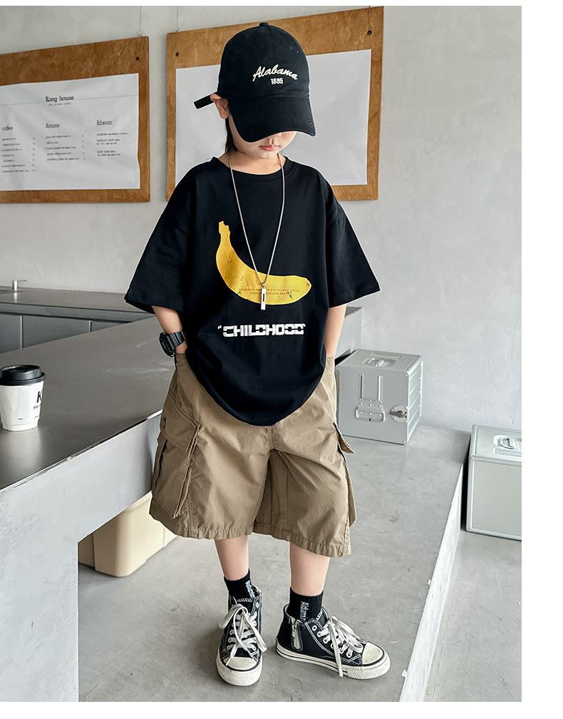 儿童香蕉印花纯色T恤夏款2024新款薄款夏装中大童男孩帅气短袖潮T