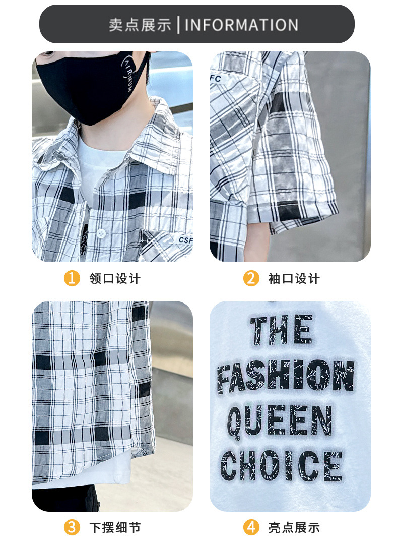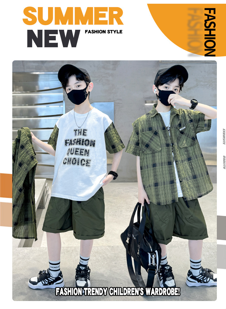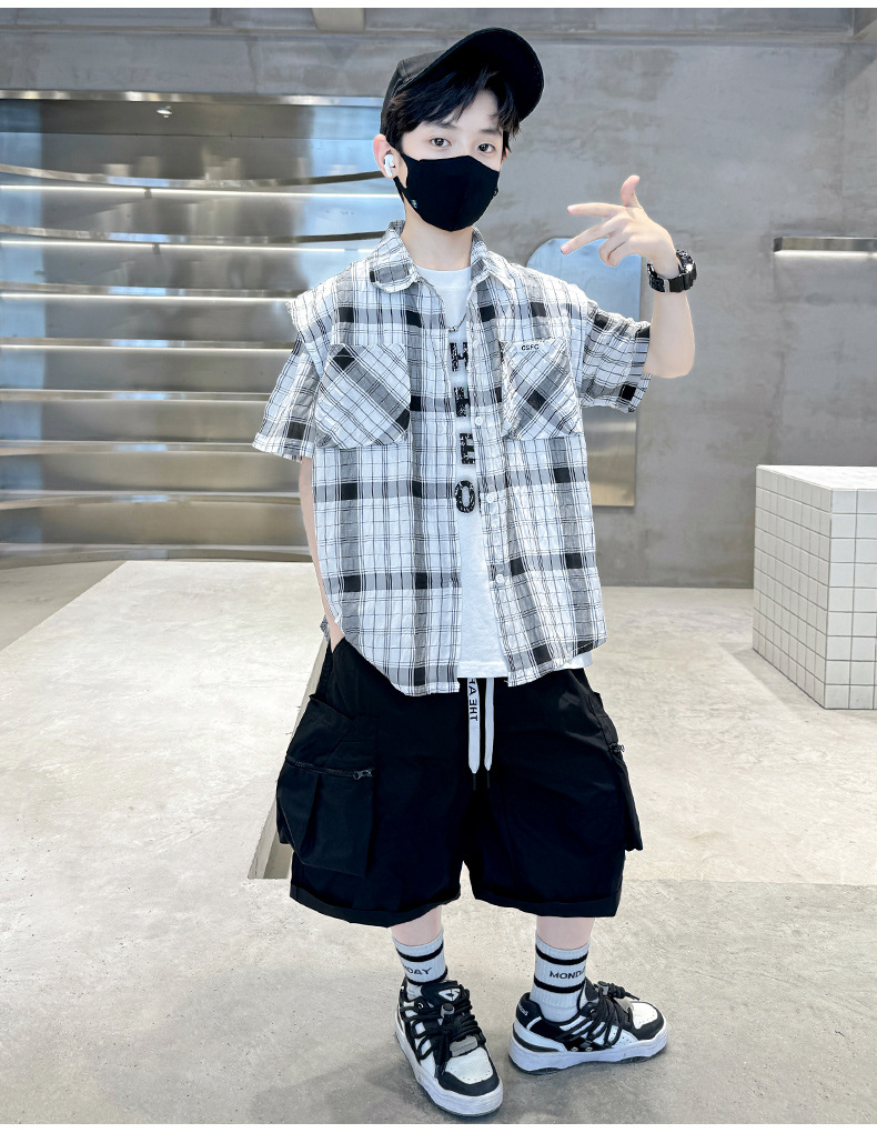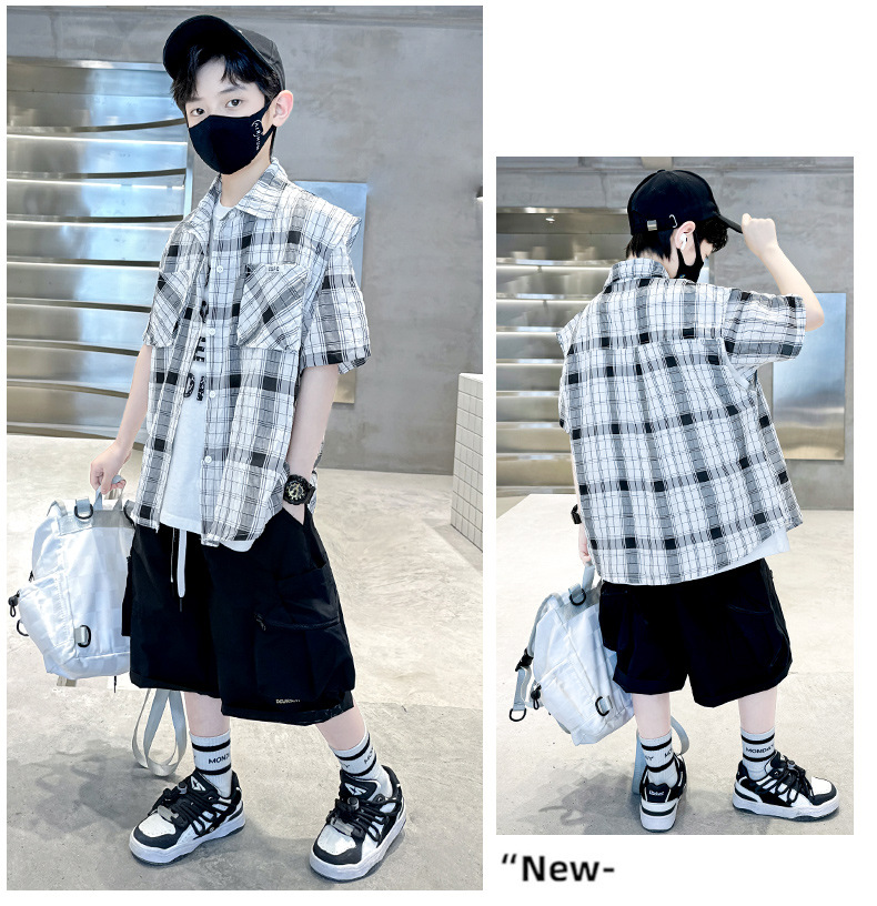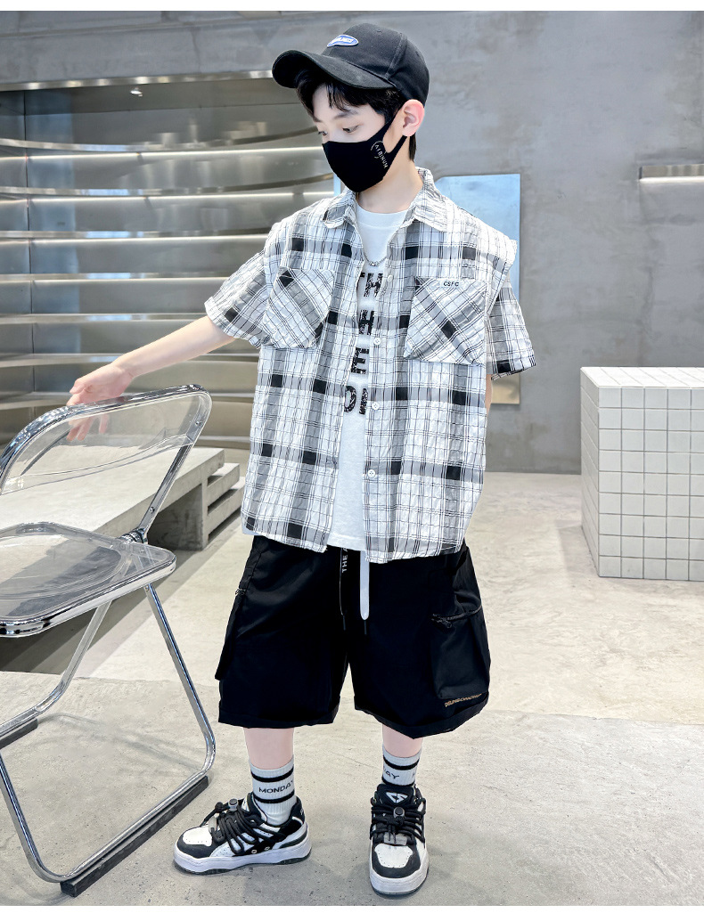 男童衬衫三件套夏装2024新款中大童男孩夏季格子T恤短裤夏款薄款t
