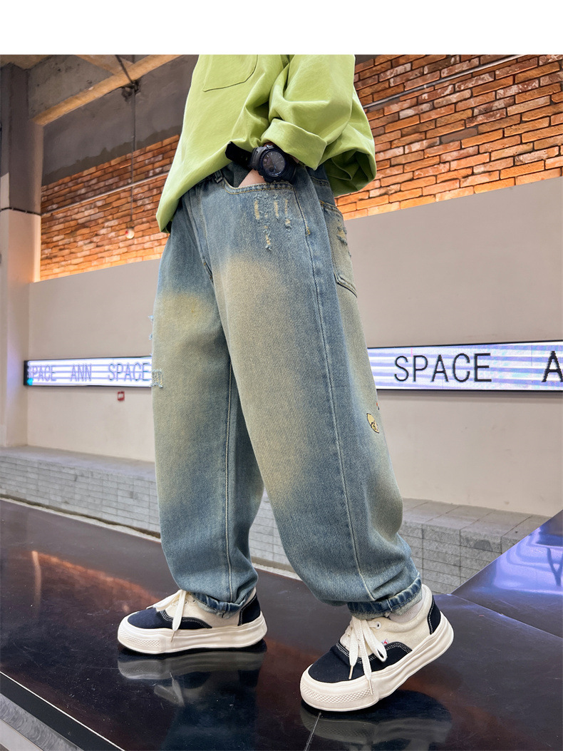 男童裤子春秋款2024新款儿童春季中大童洋气卡通印花牛仔裤春装潮