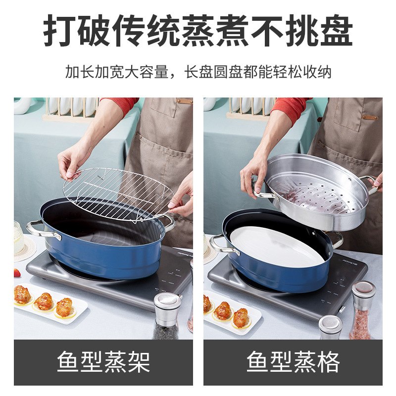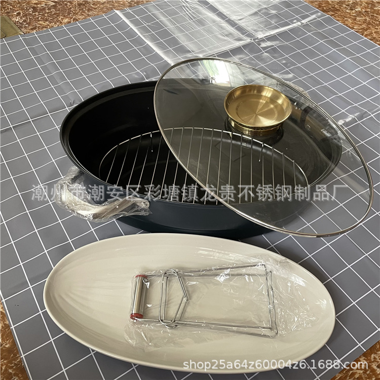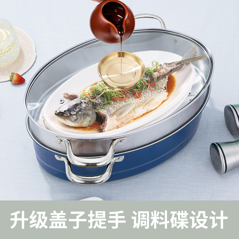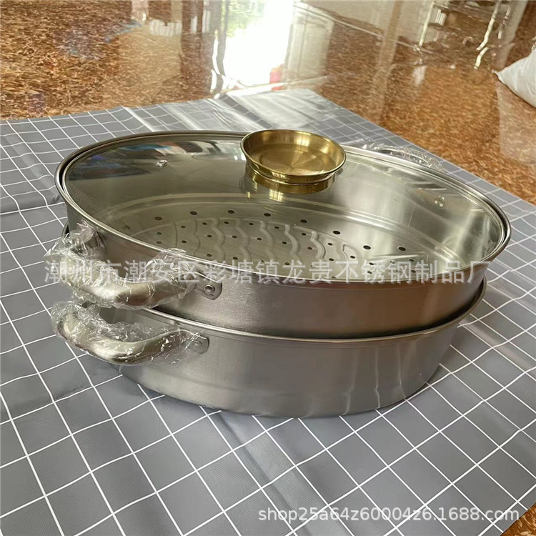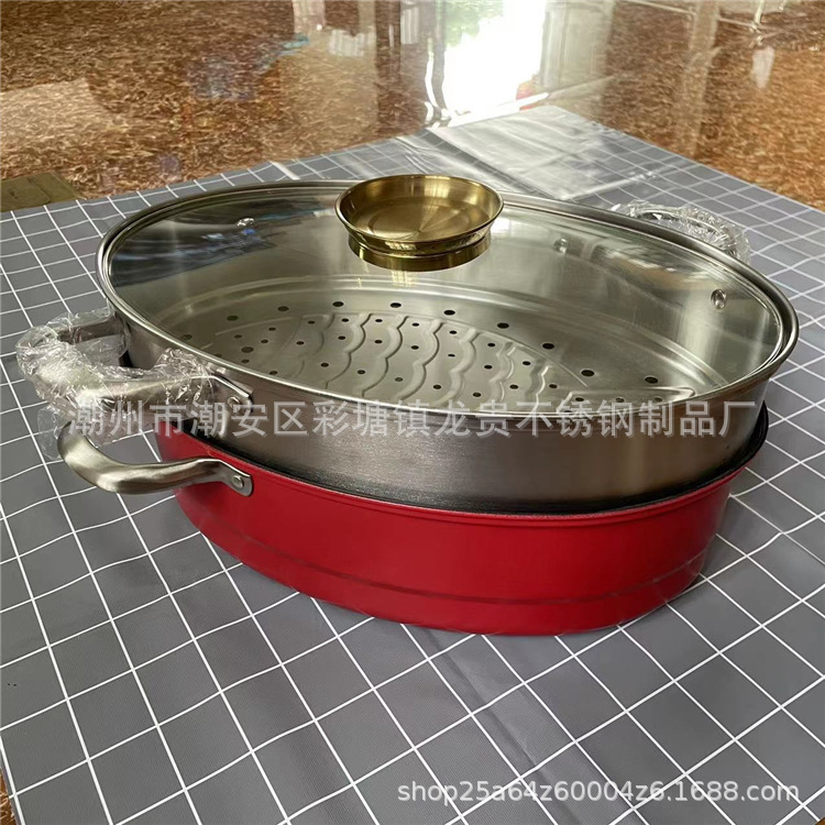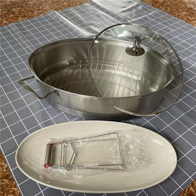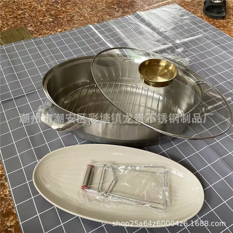 不锈钢锅加厚椭圆形蒸鱼锅玻璃盖汤蒸锅厨房多用炊具多功能火锅