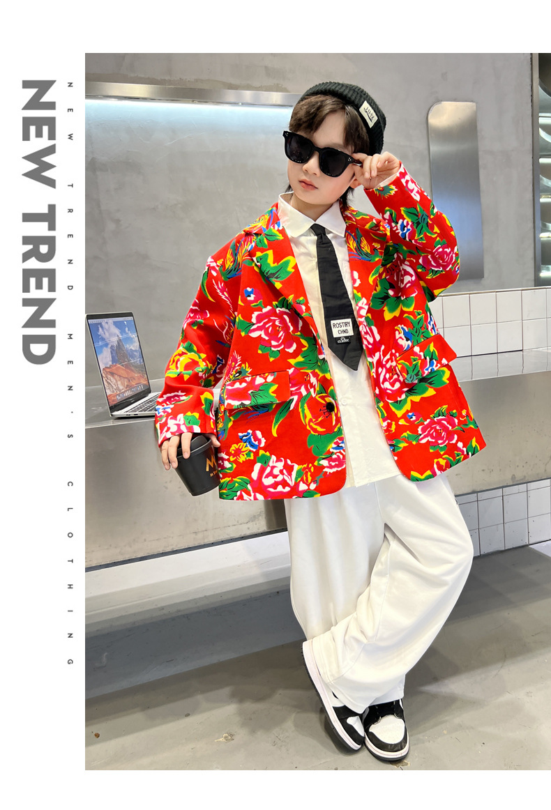 男童东北大花西服外套套装2024新款中大童个性帅气表演服春秋装潮