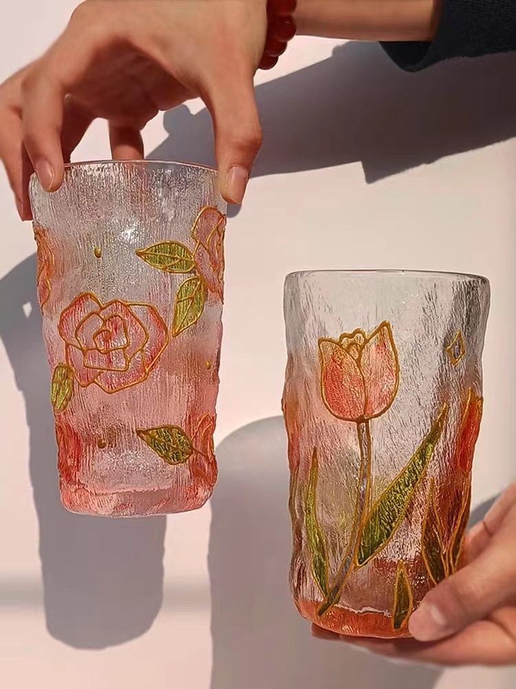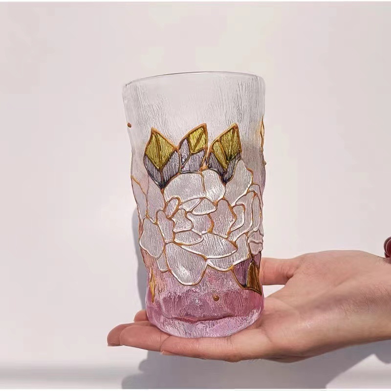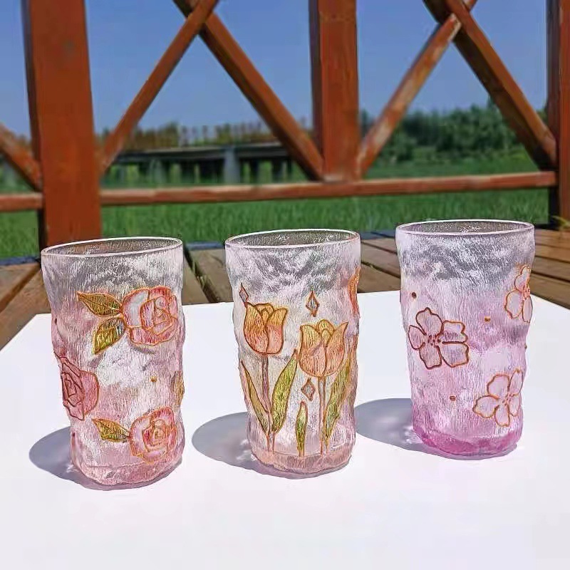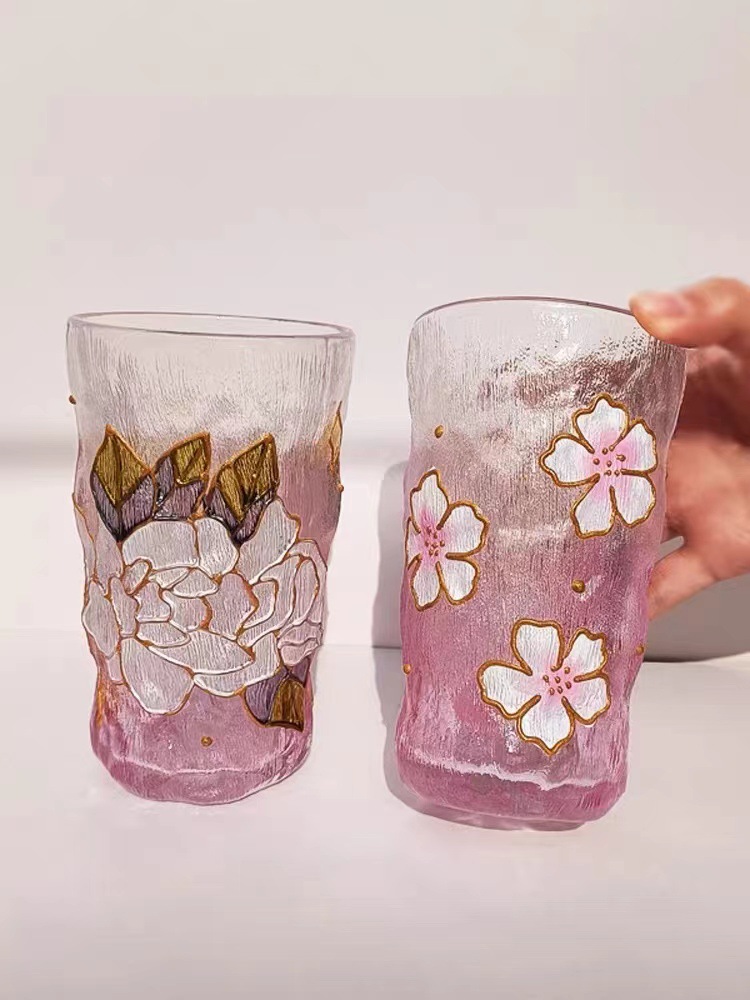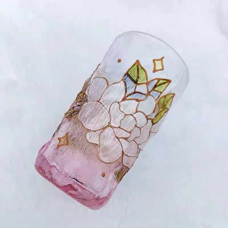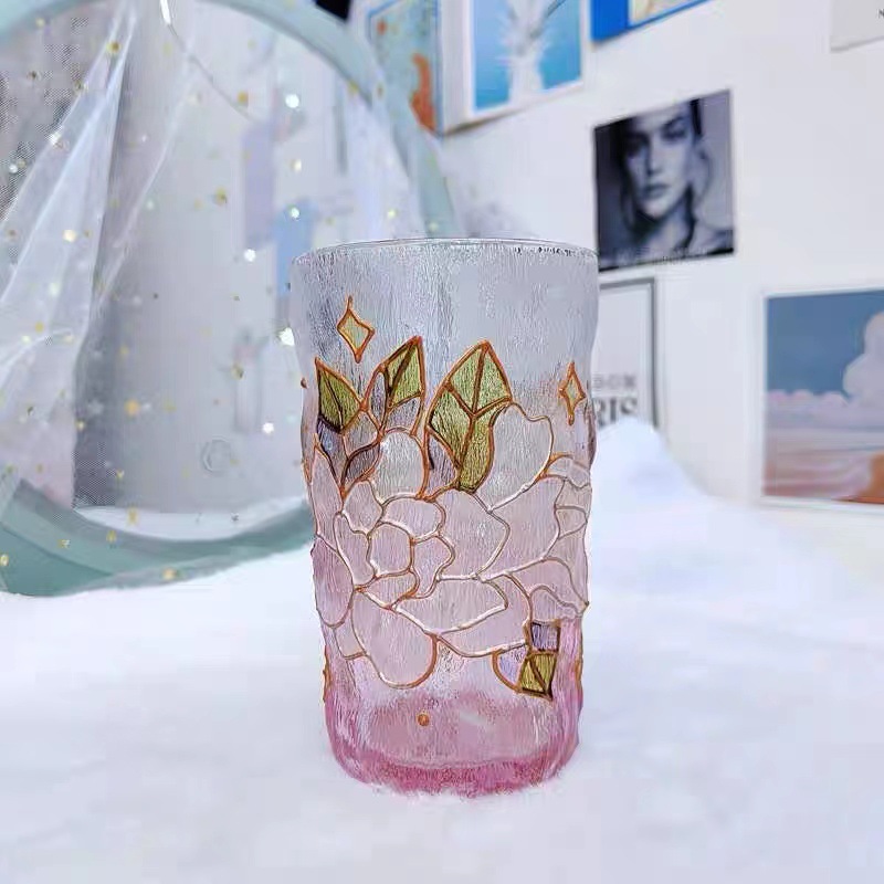 高颜值创意手绘水晶玻璃杯冰川水杯子渐变粉色泡茶杯牛奶杯果汁杯