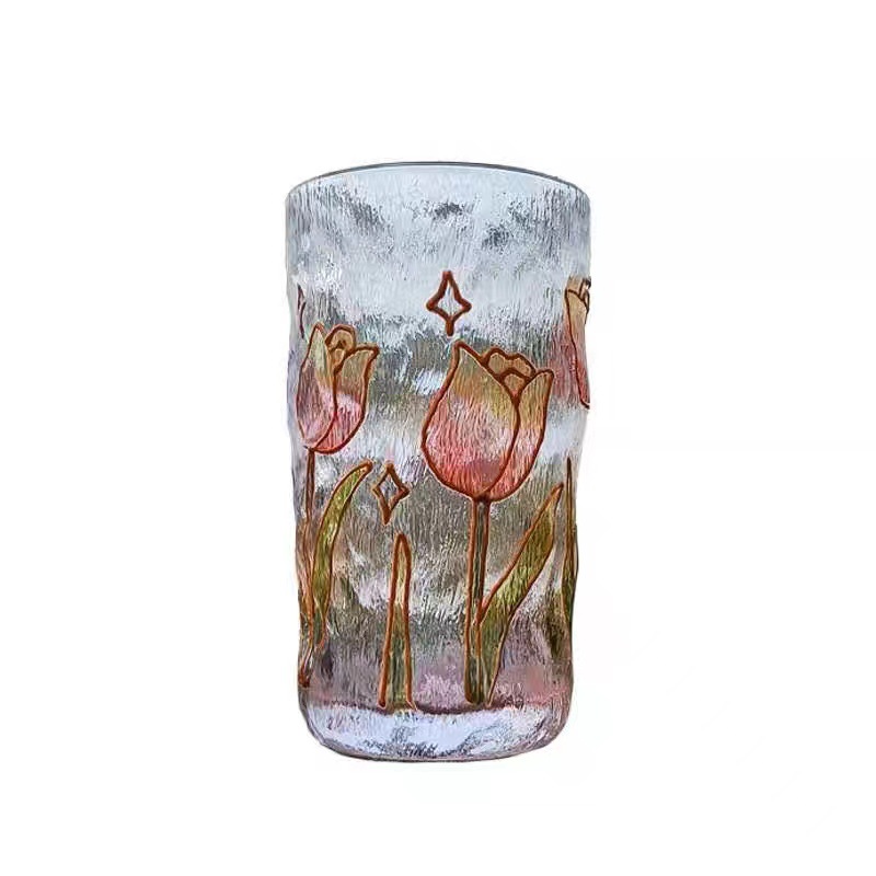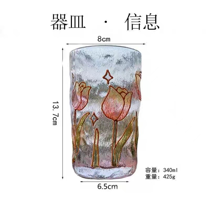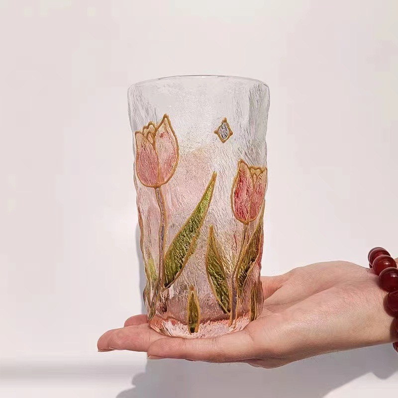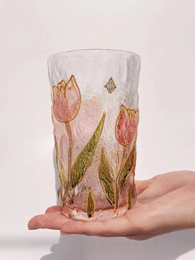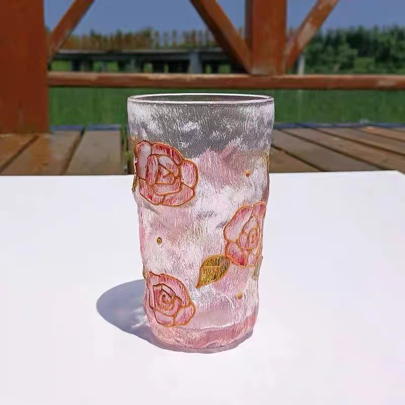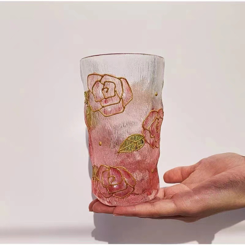 高颜值创意手绘水晶玻璃杯冰川水杯子渐变粉色泡茶杯牛奶杯果汁杯