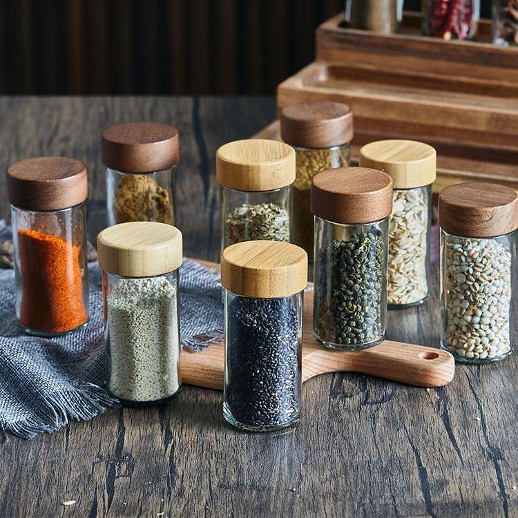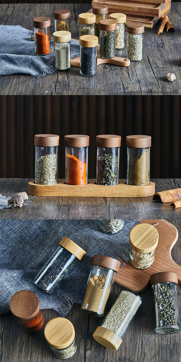 轻奢相思木盖玻璃调料瓶带底座四件套 厨房调料罐烧烤孜然调味罐