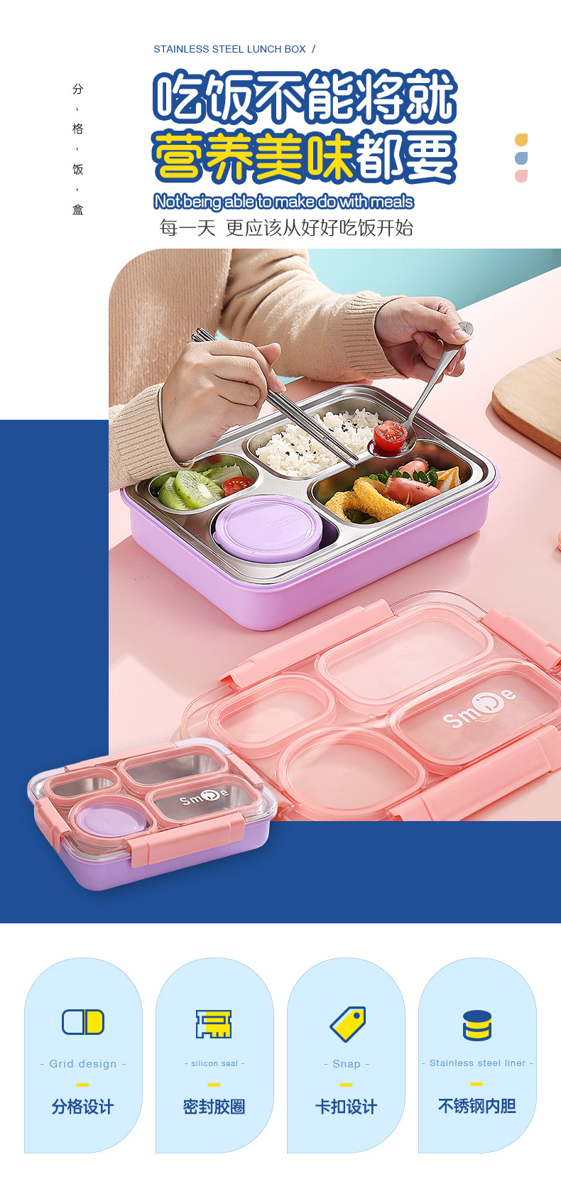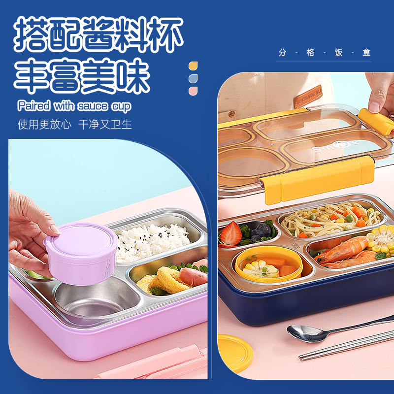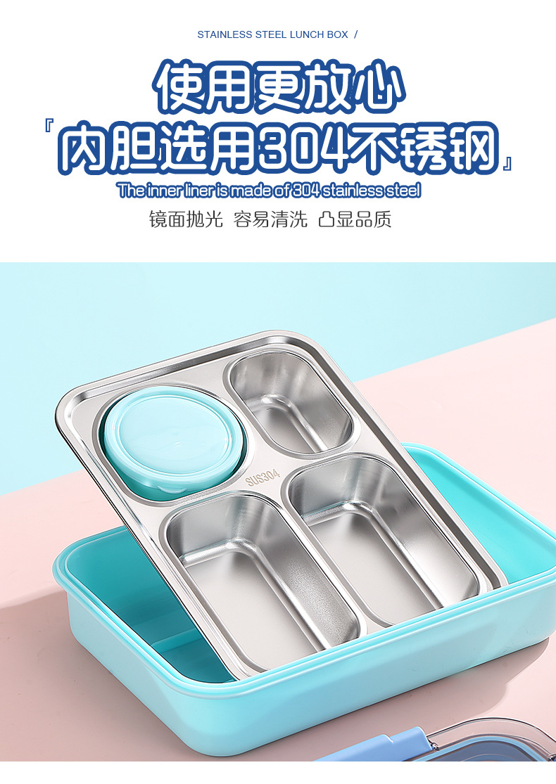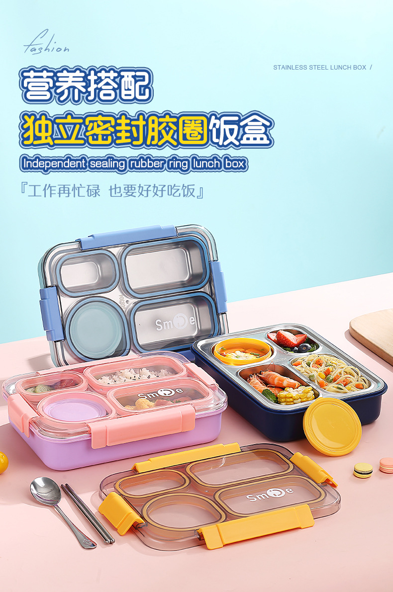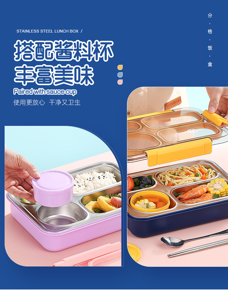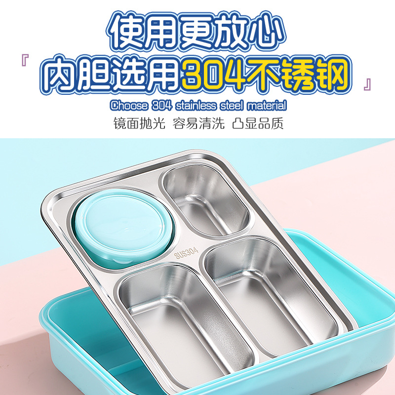新款日式简约304不锈钢密封分格便当盒四格带碗筷户外休闲批发