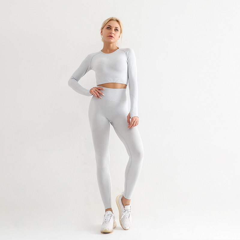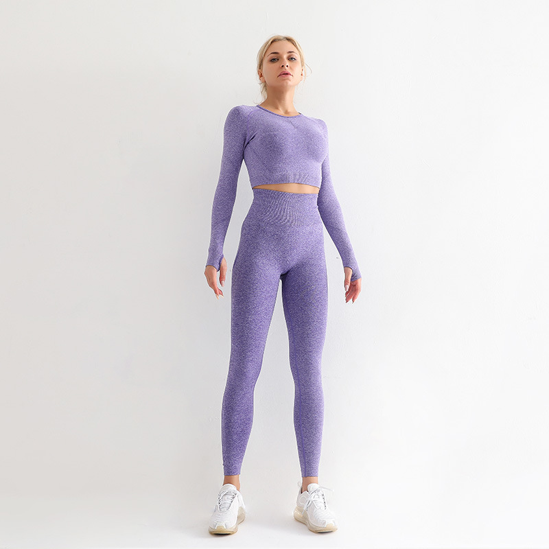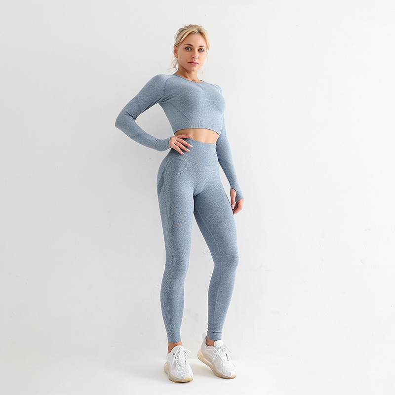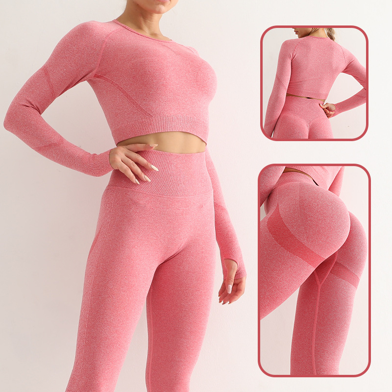 欧美无缝瑜伽服两件套女户外健身高腰提臀显瘦紧身长袖瑜伽套装