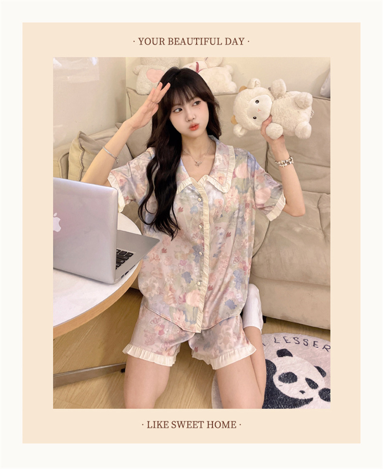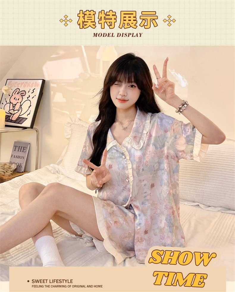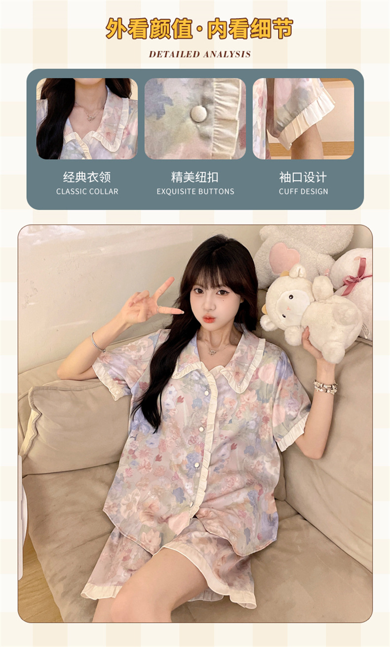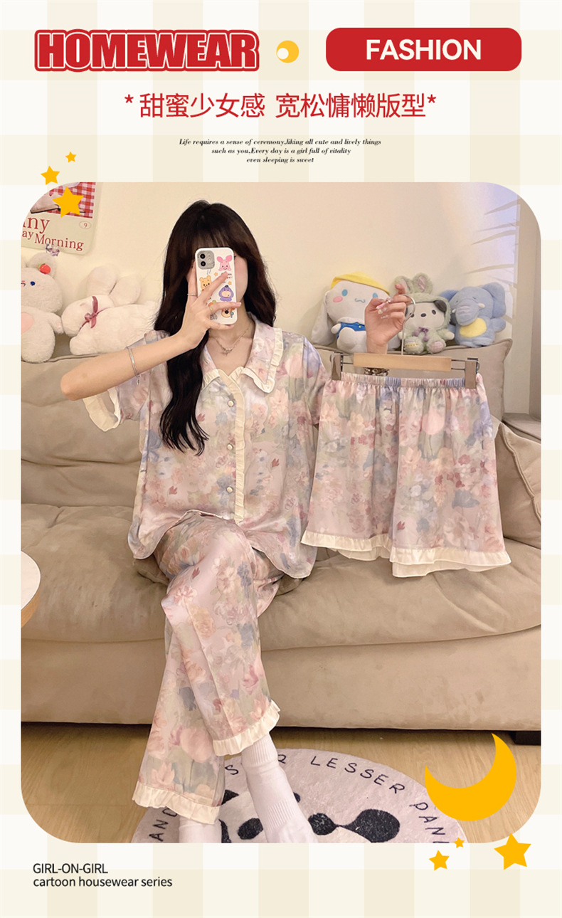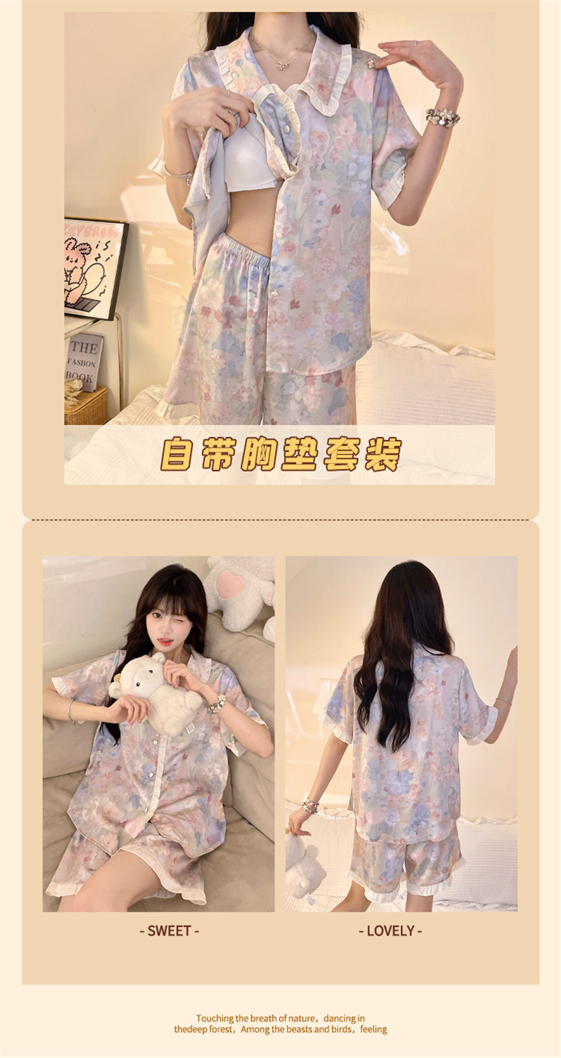 三件套睡衣女款夏季带胸垫冰丝绸短袖长裤2024新款大码家居服夏天