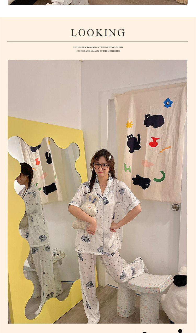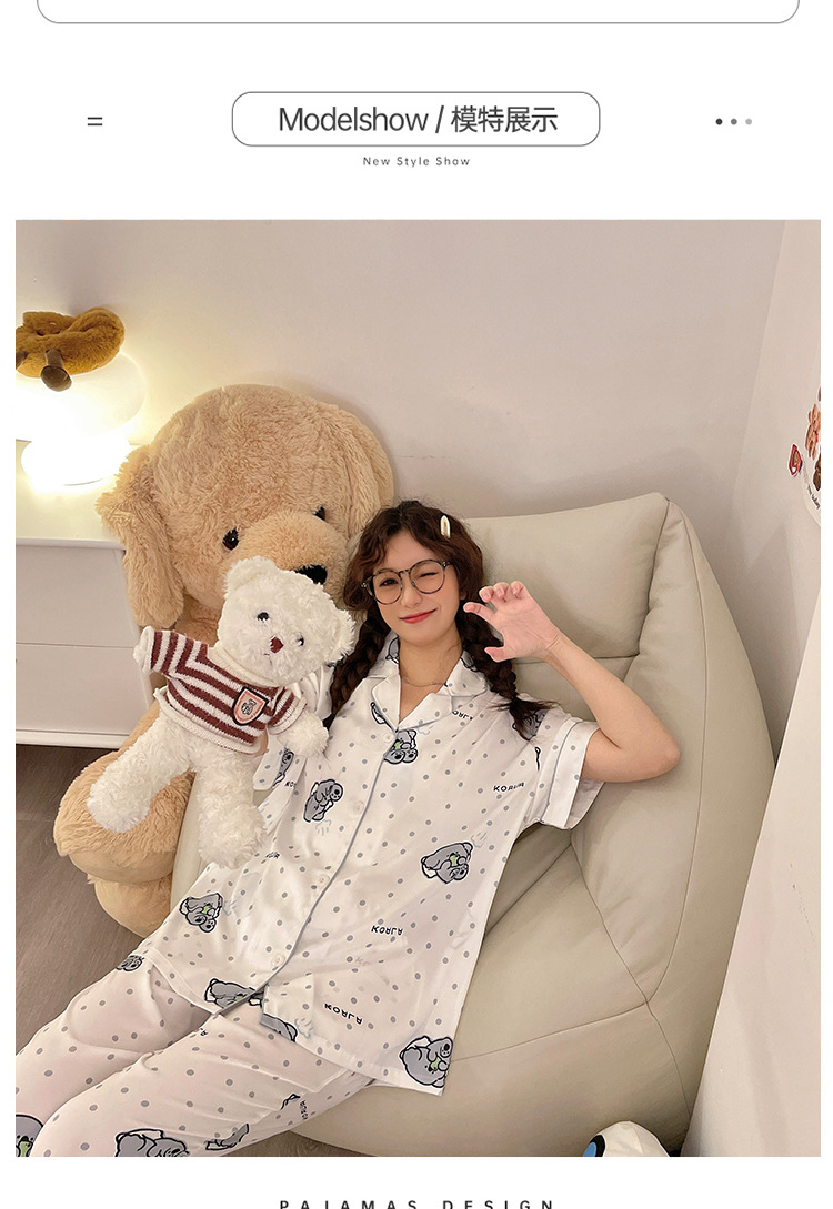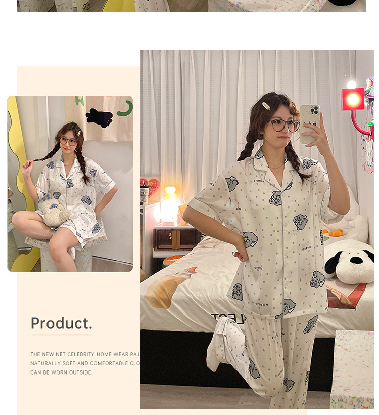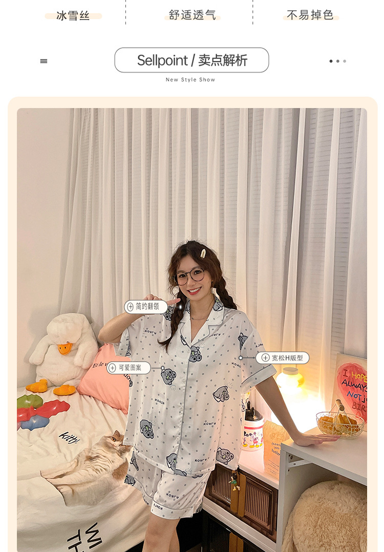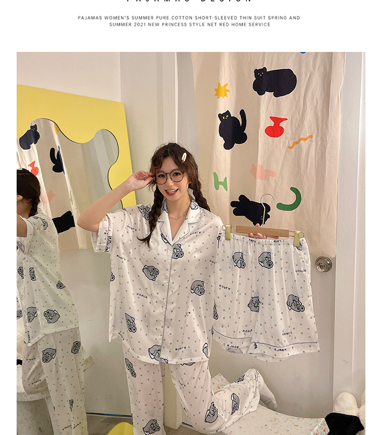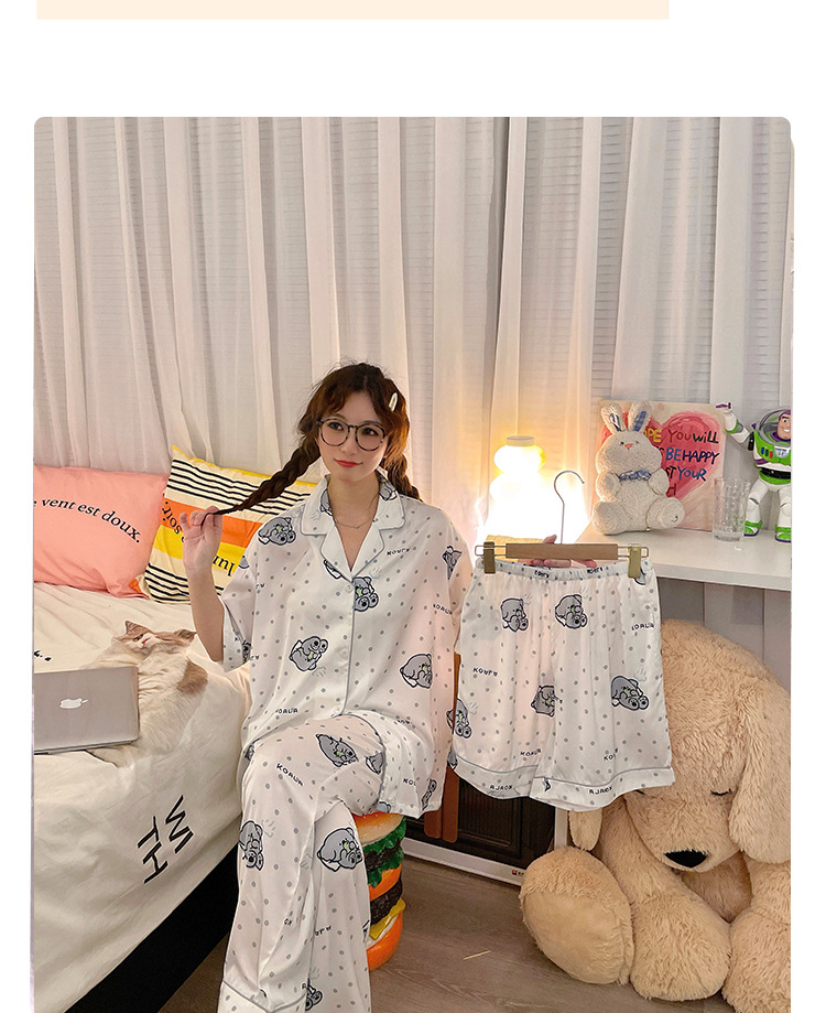 夏季睡衣女三件套冰丝绸短袖长裤2024新款夏天卡通可爱家居服套装