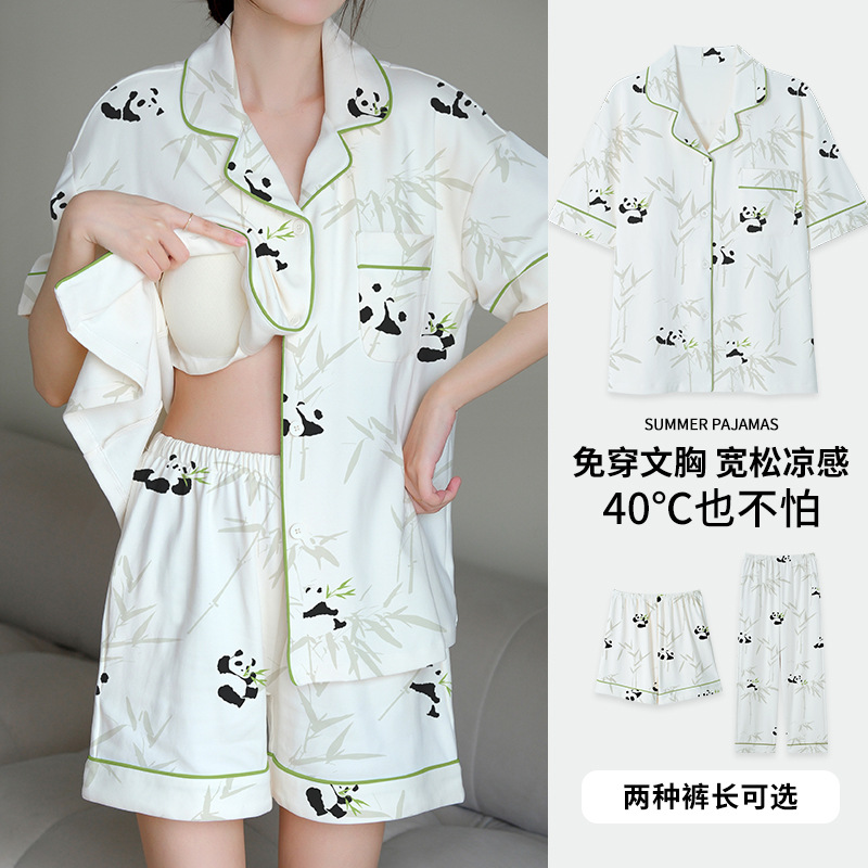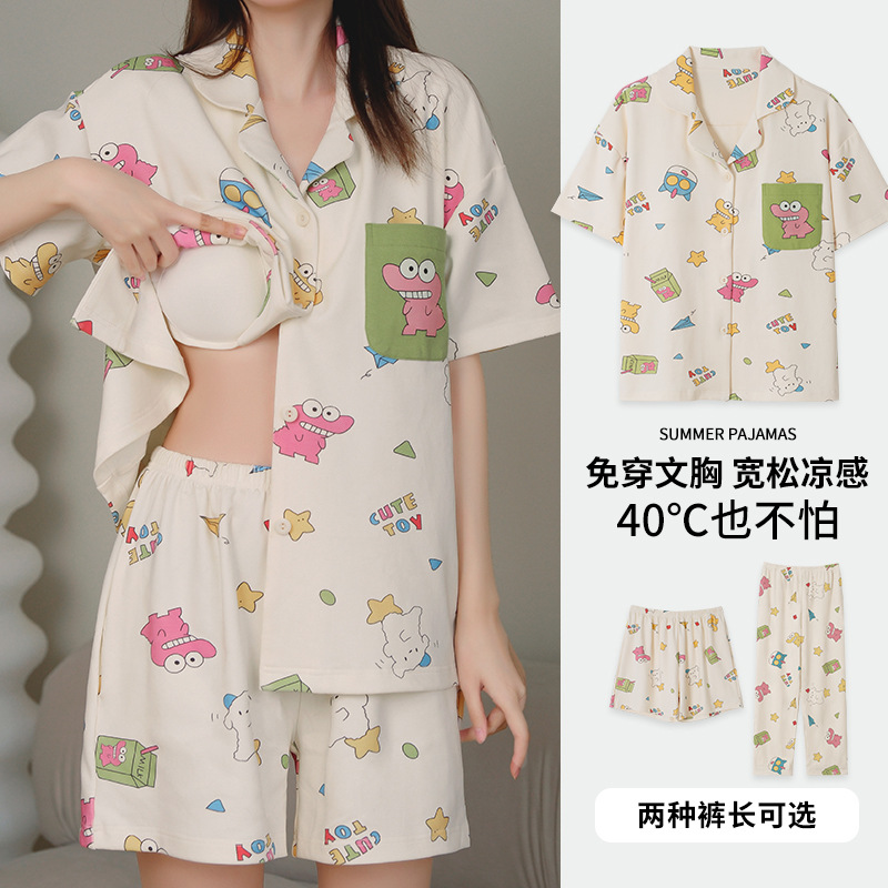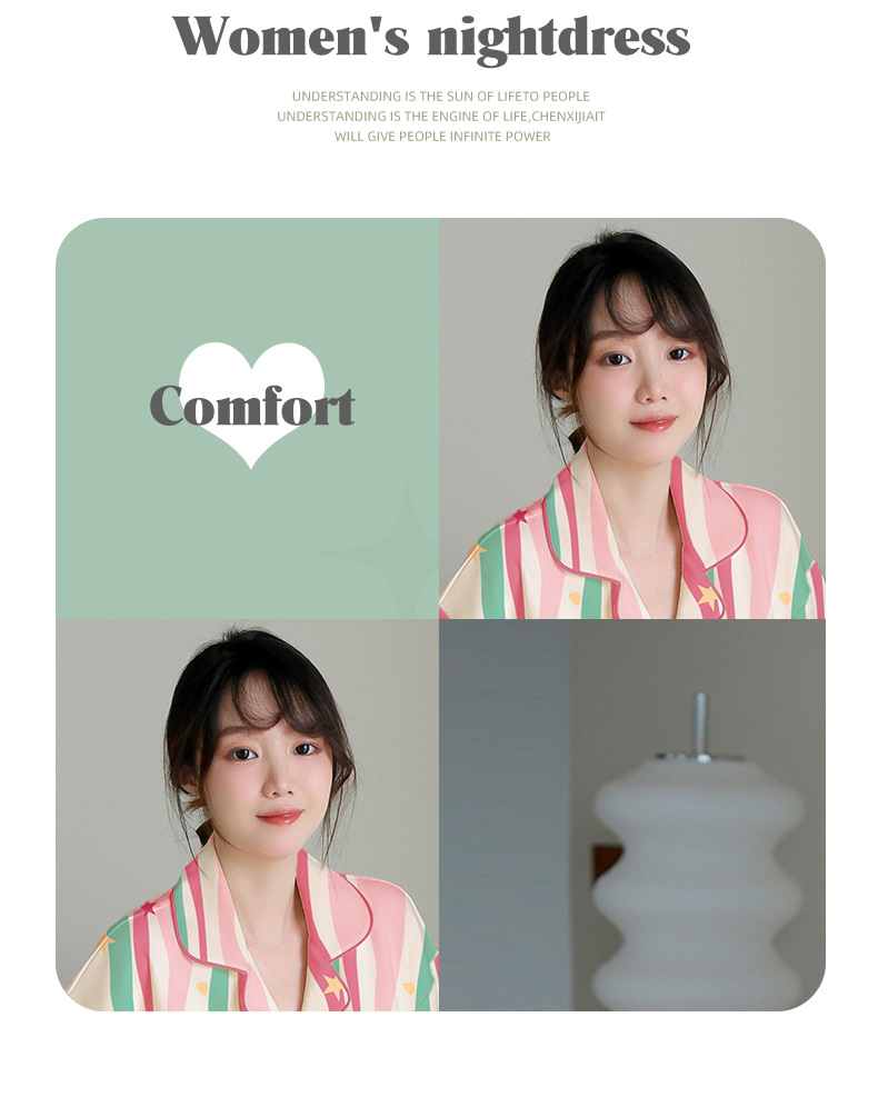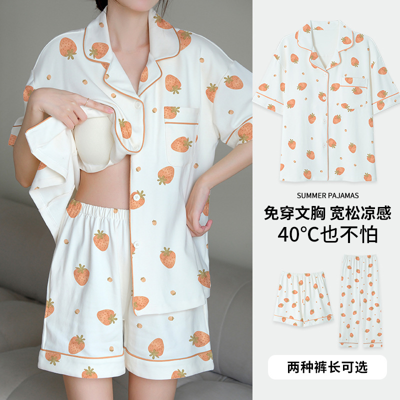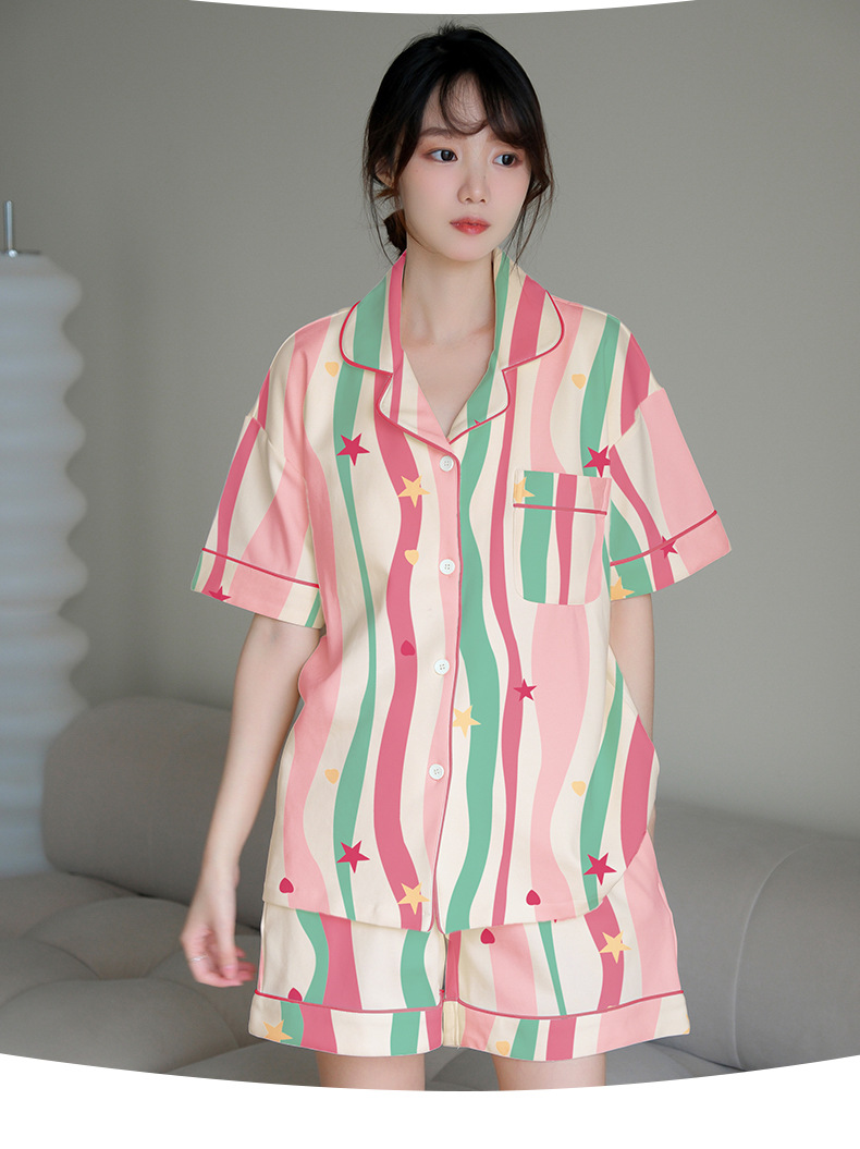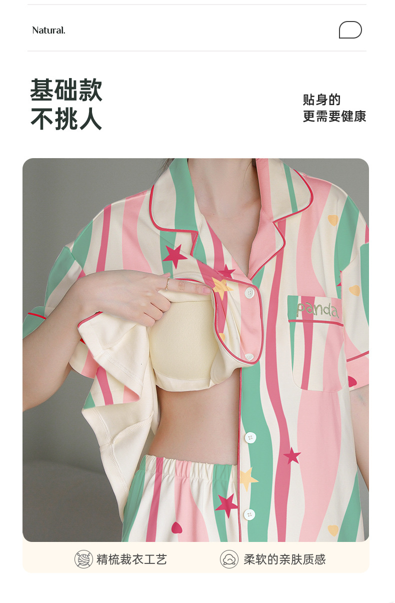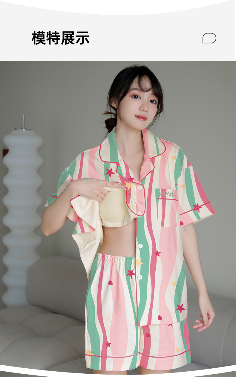 多巴胺粉色条纹带胸垫睡衣女夏季天薄款2024新款大码家居服三件套