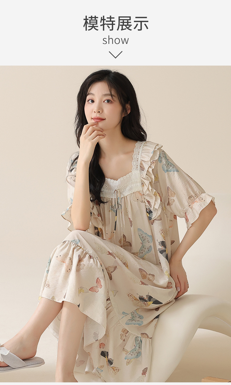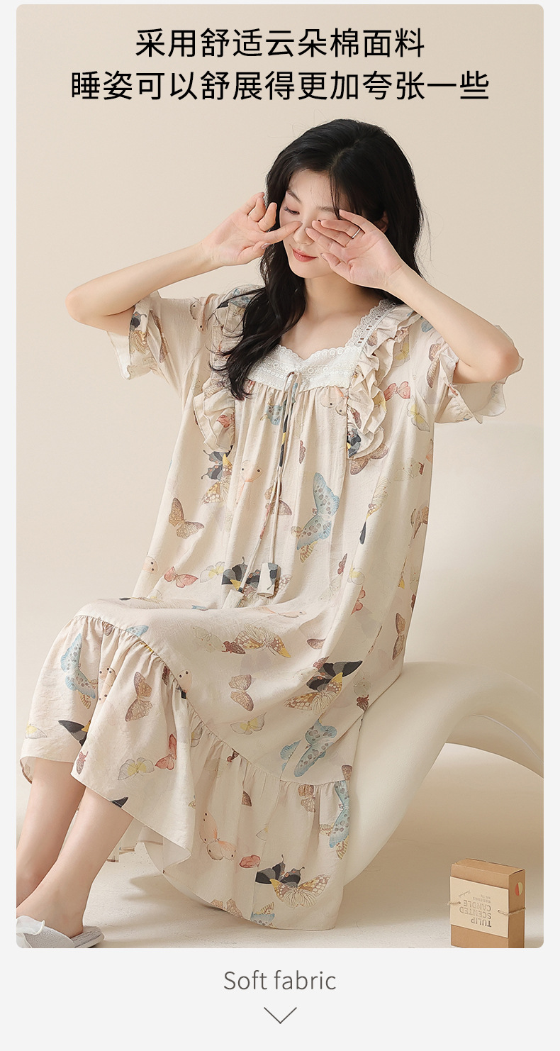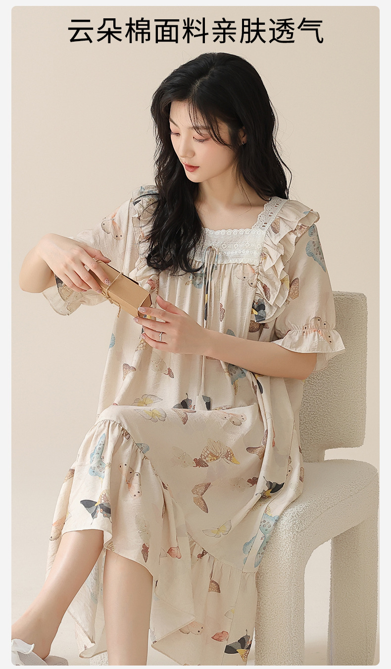 复古风睡裙女夏季方领短袖云朵棉绸孕妇中长款大码睡衣夏天家居服
