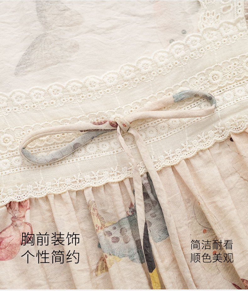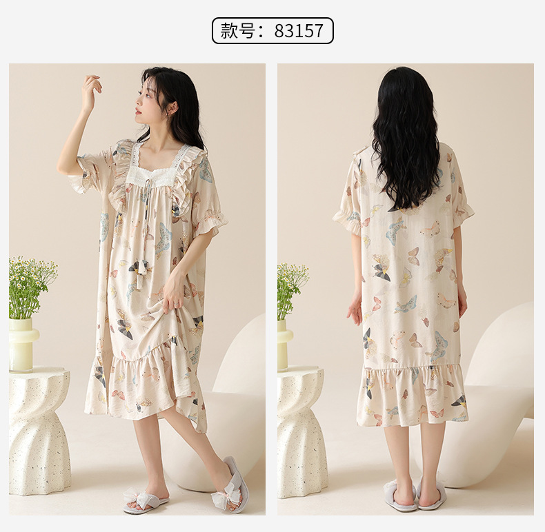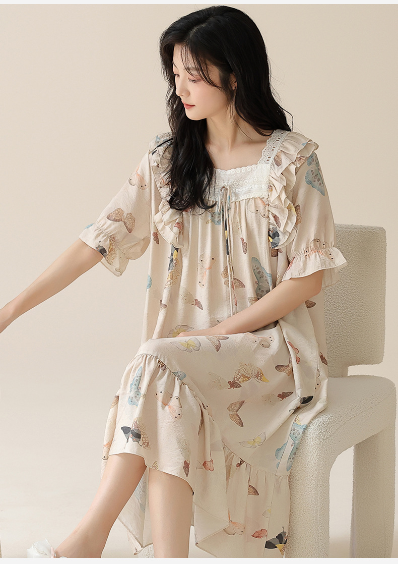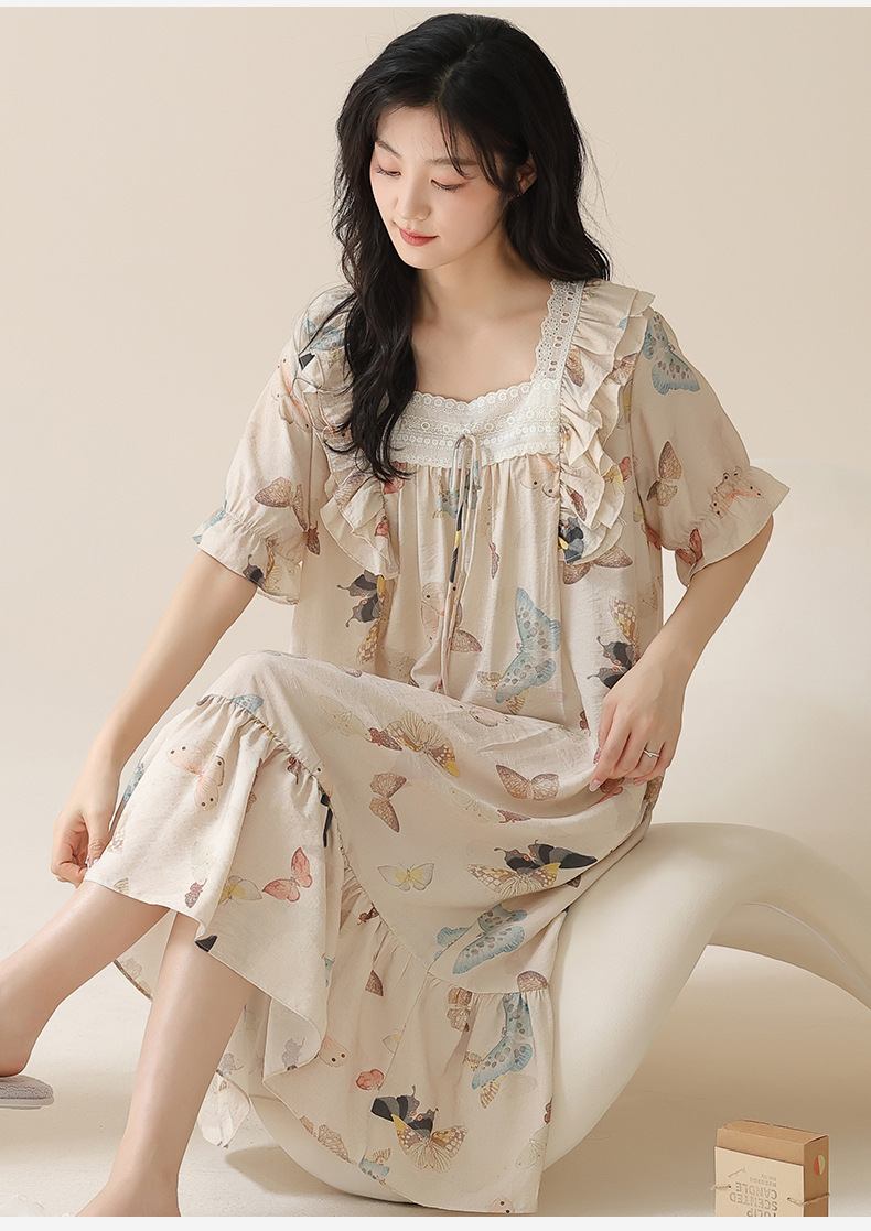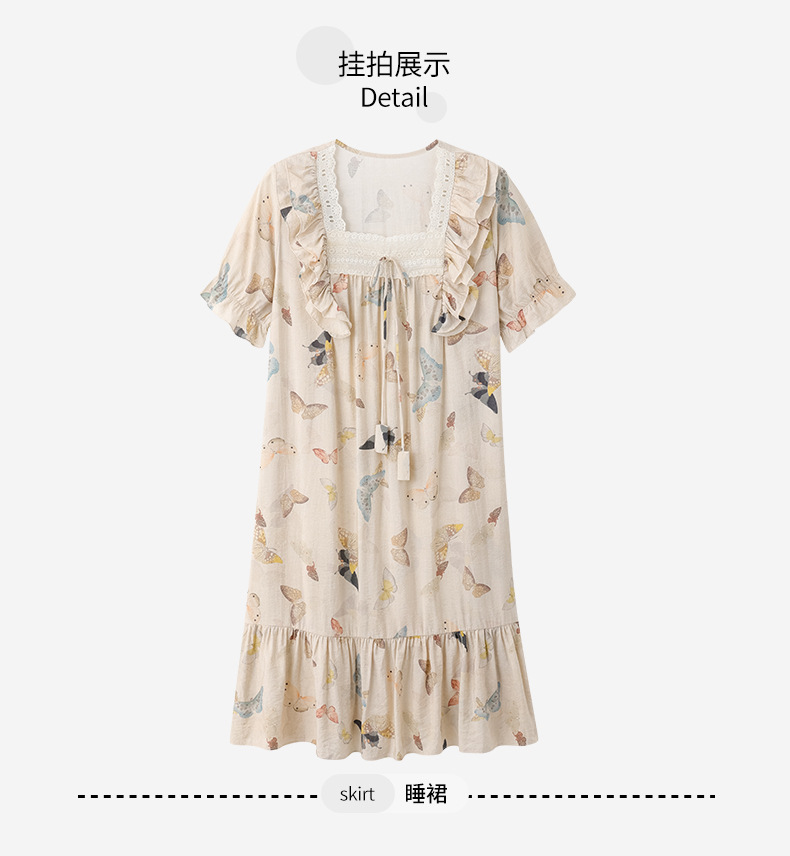 复古风睡裙女夏季方领短袖云朵棉绸孕妇中长款大码睡衣夏天家居服