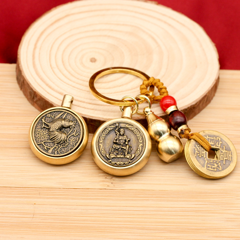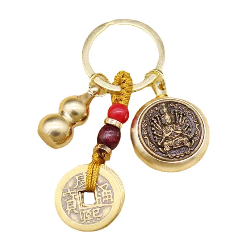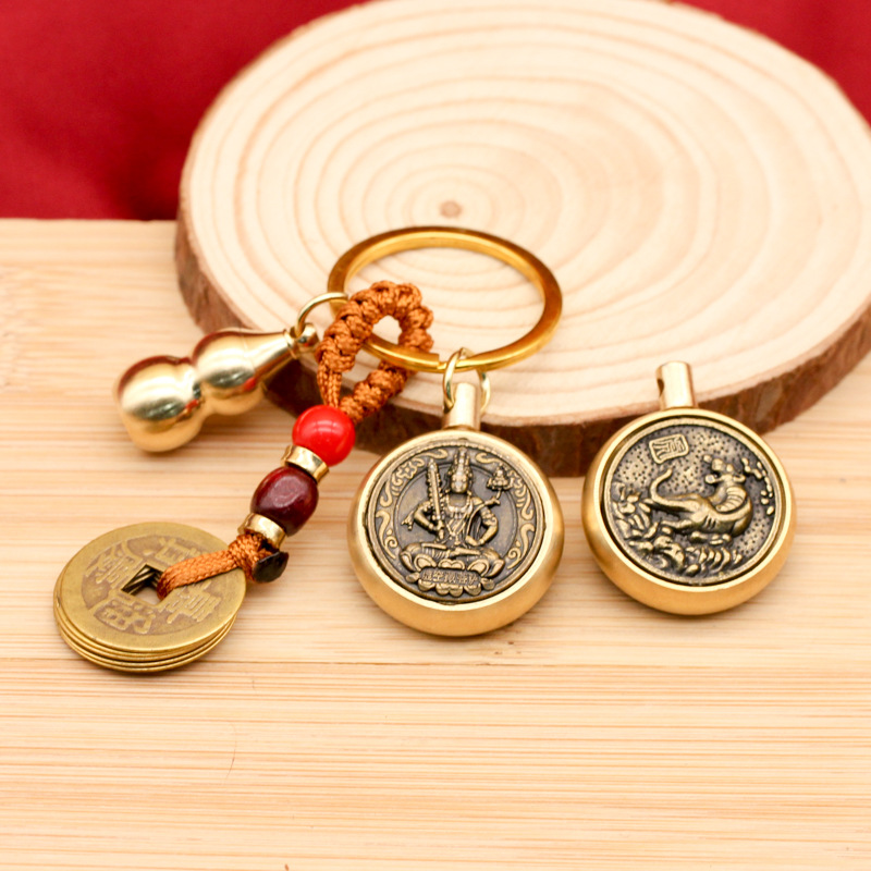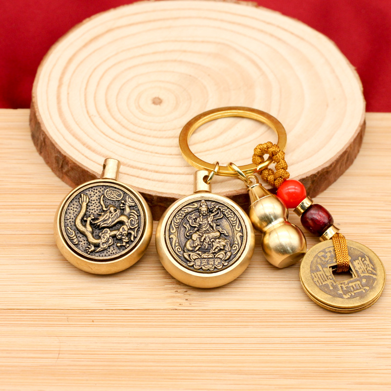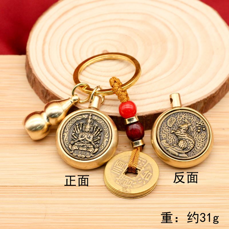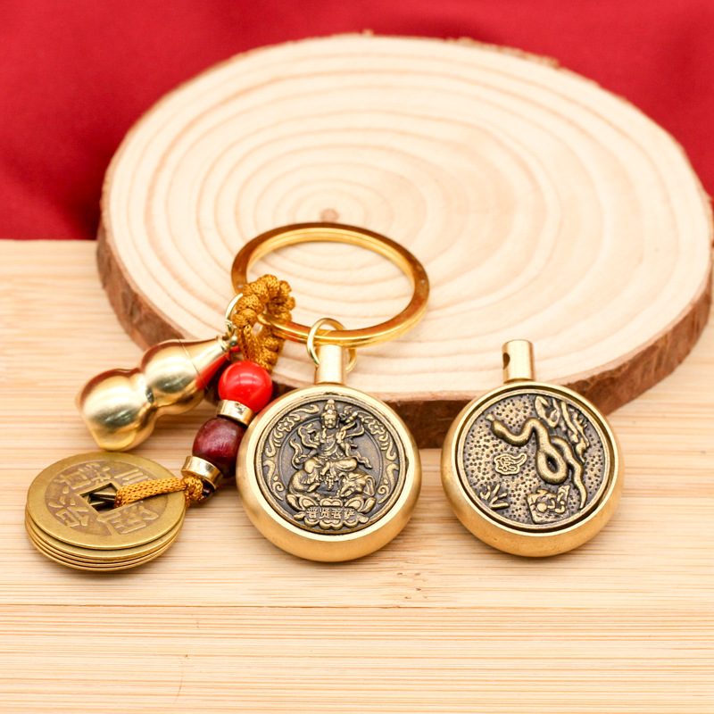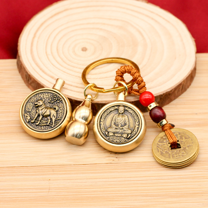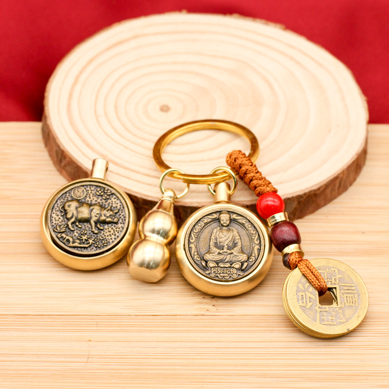 黄铜本命佛转转朱砂葫芦五帝钱钥匙扣挂件可转动一面生肖一面佛