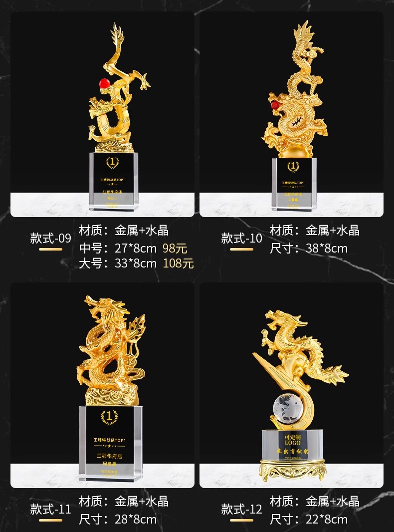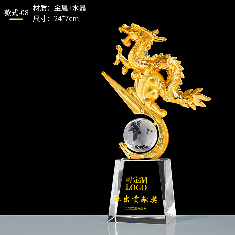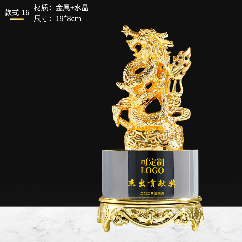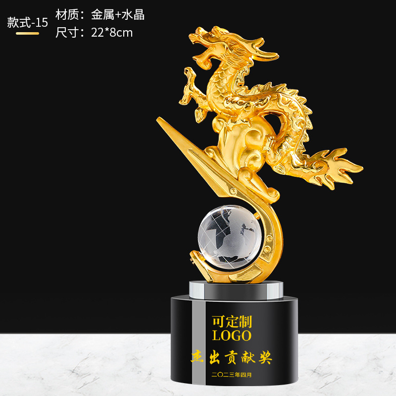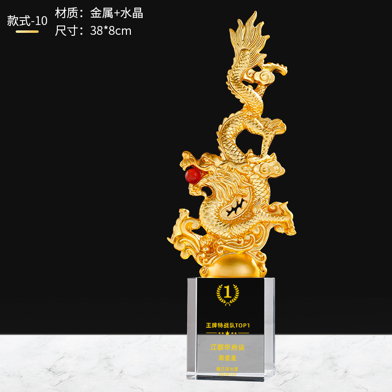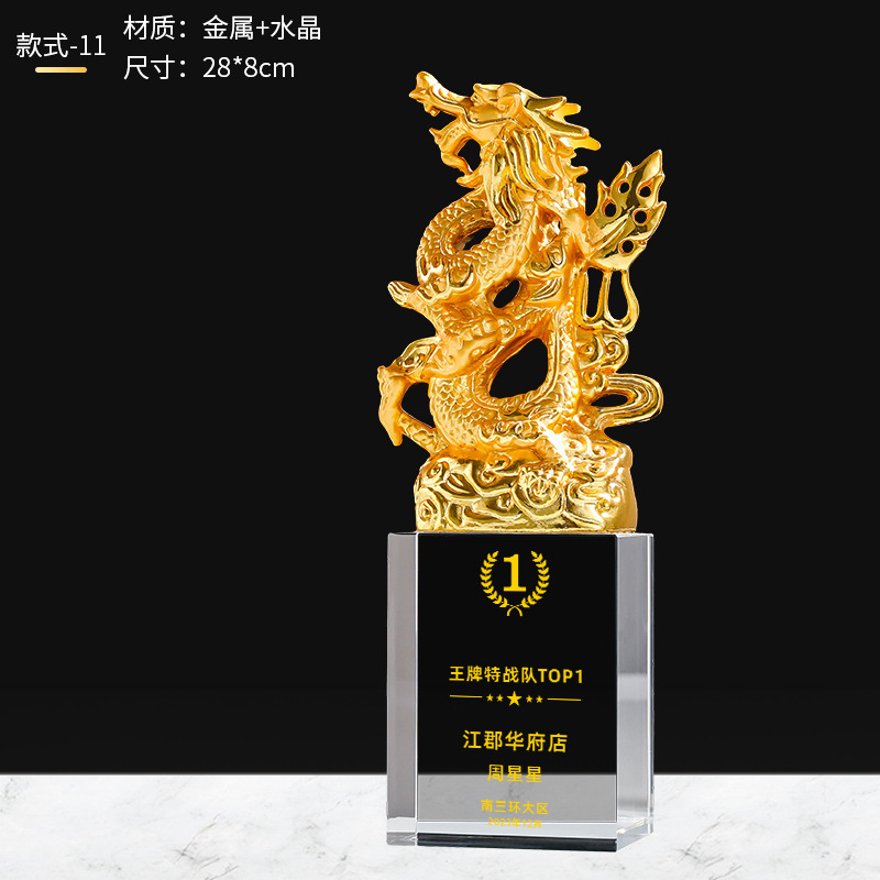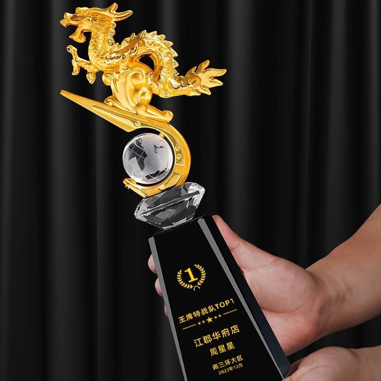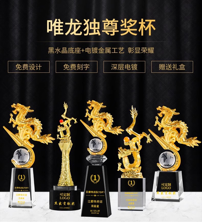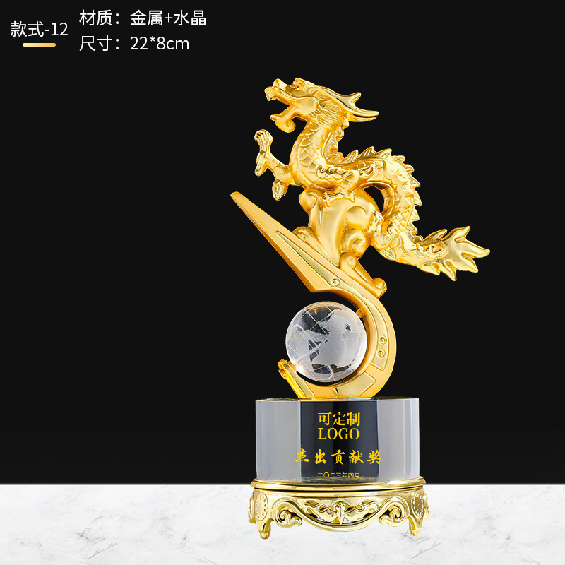 龙年造型水晶奖杯定制中国龙舟比赛颁奖冠军团队优秀员工金属奖牌