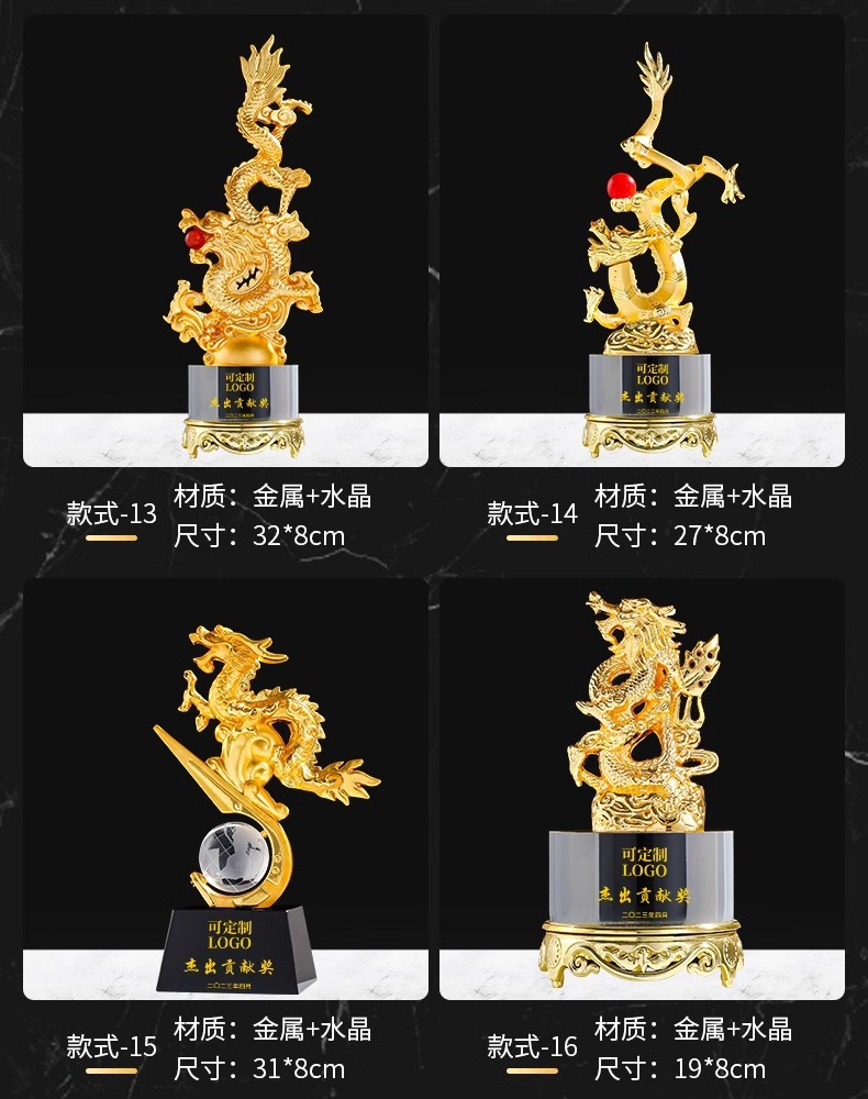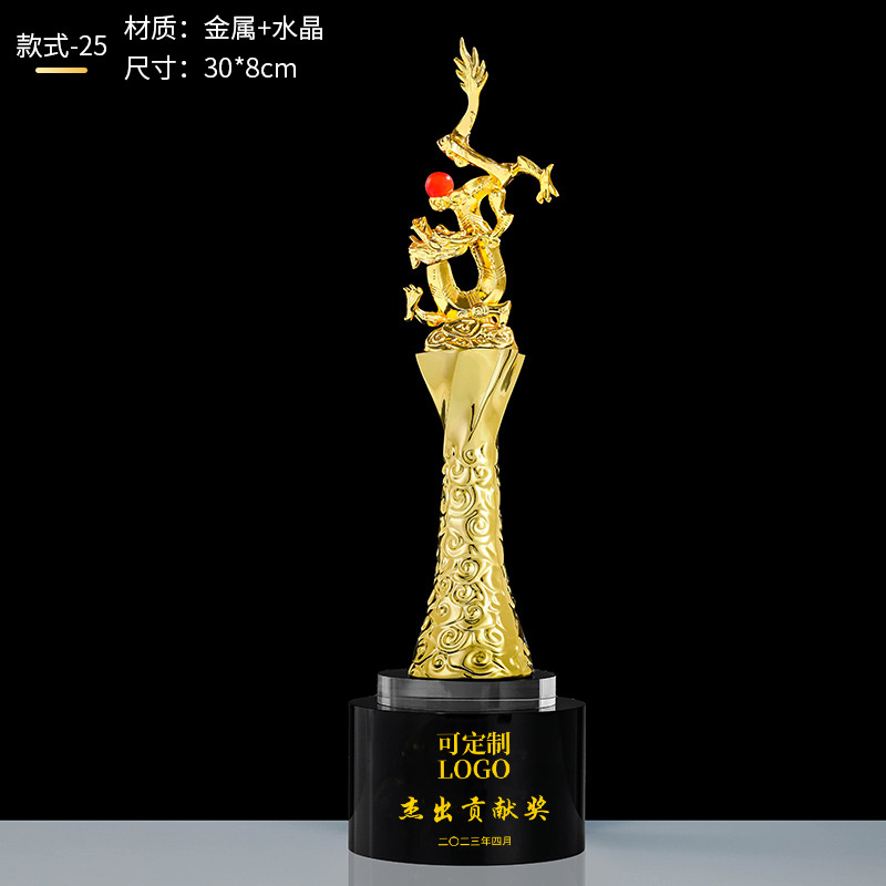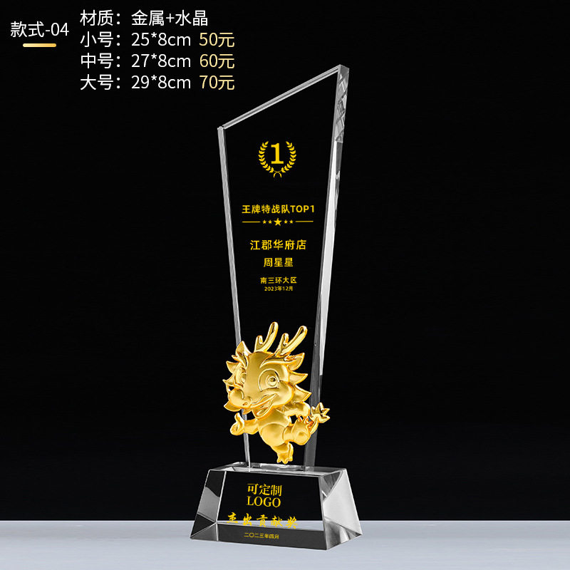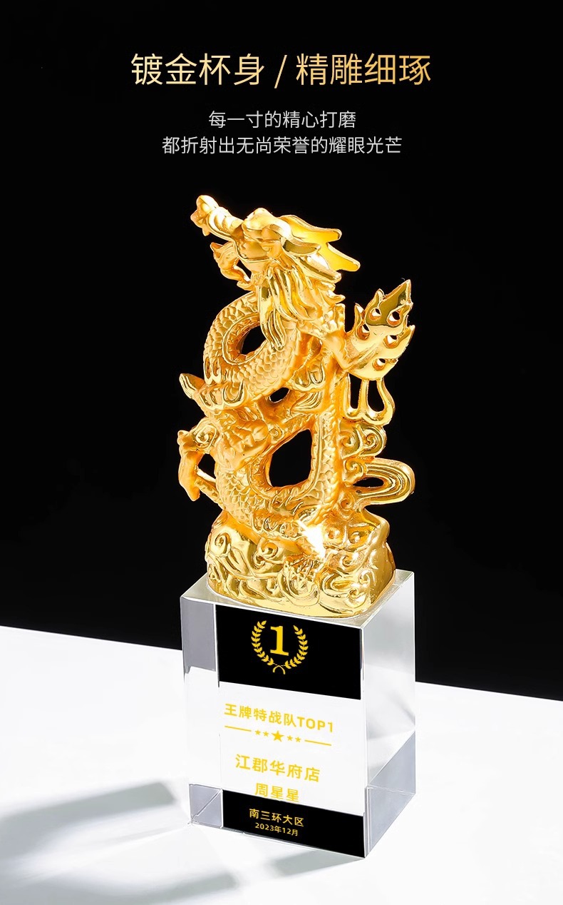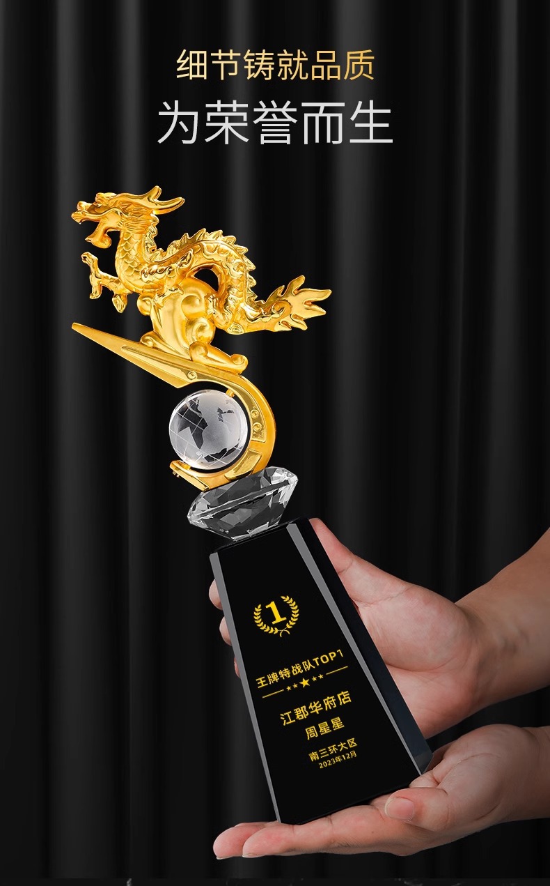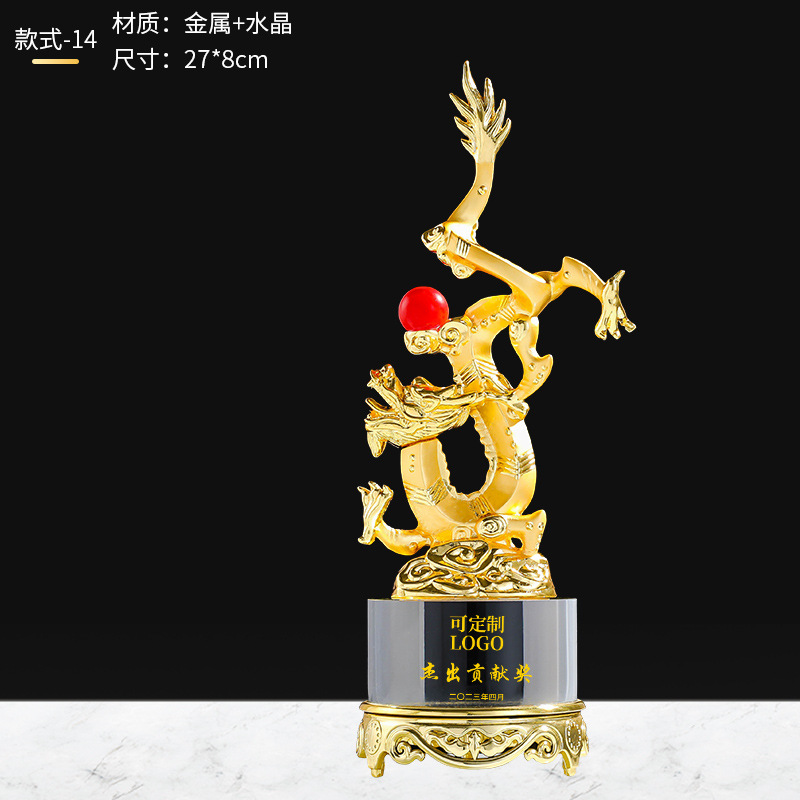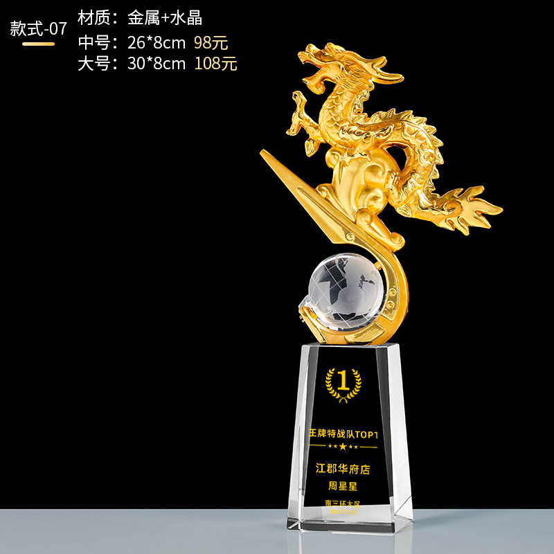龙年造型水晶奖杯定制中国龙舟比赛颁奖冠军团队优秀员工金属奖牌