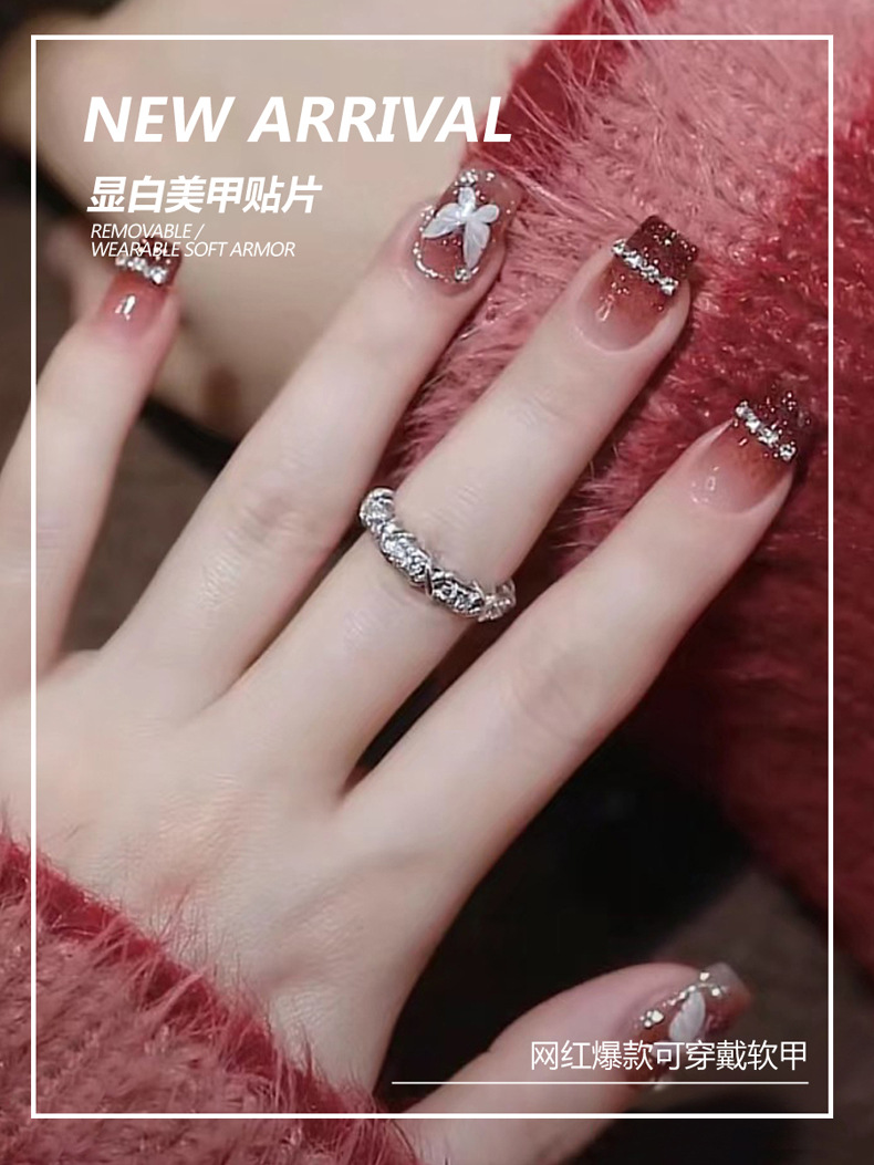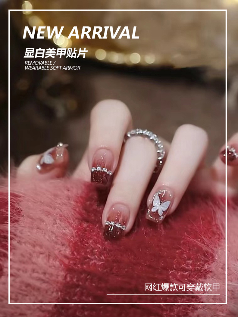 新品爆款穿戴甲批发短款T形车厘子蝴蝶碎钻美甲片可拆卸指甲贴片