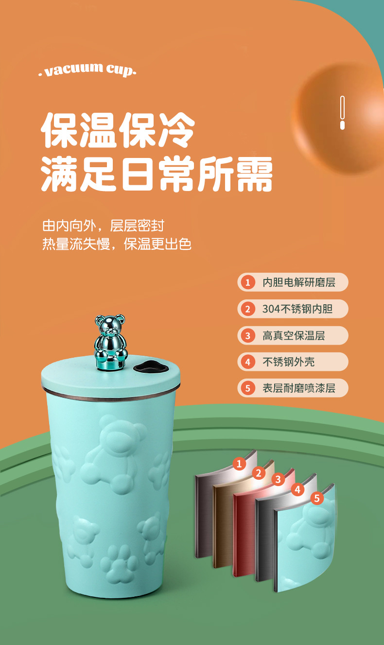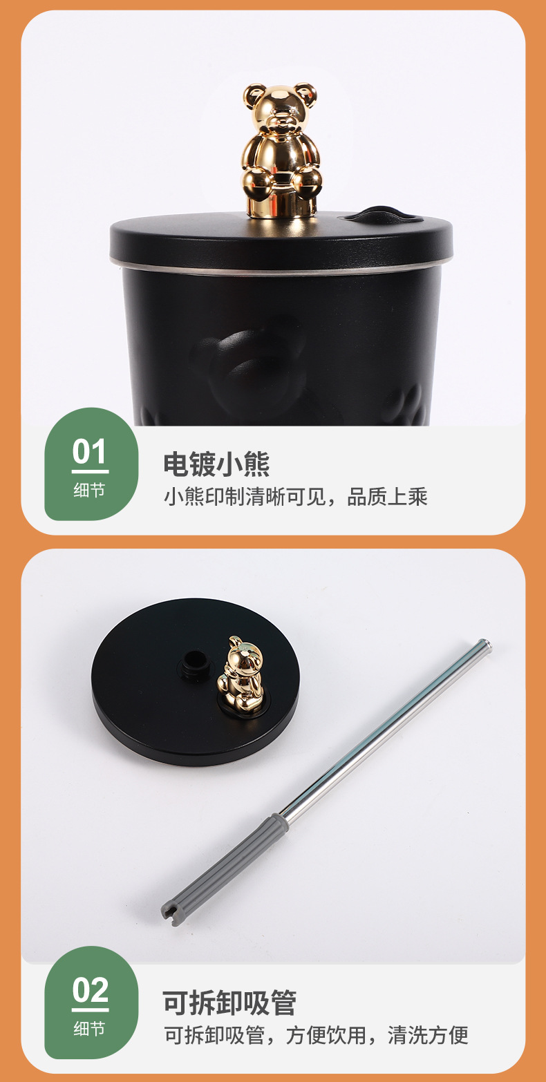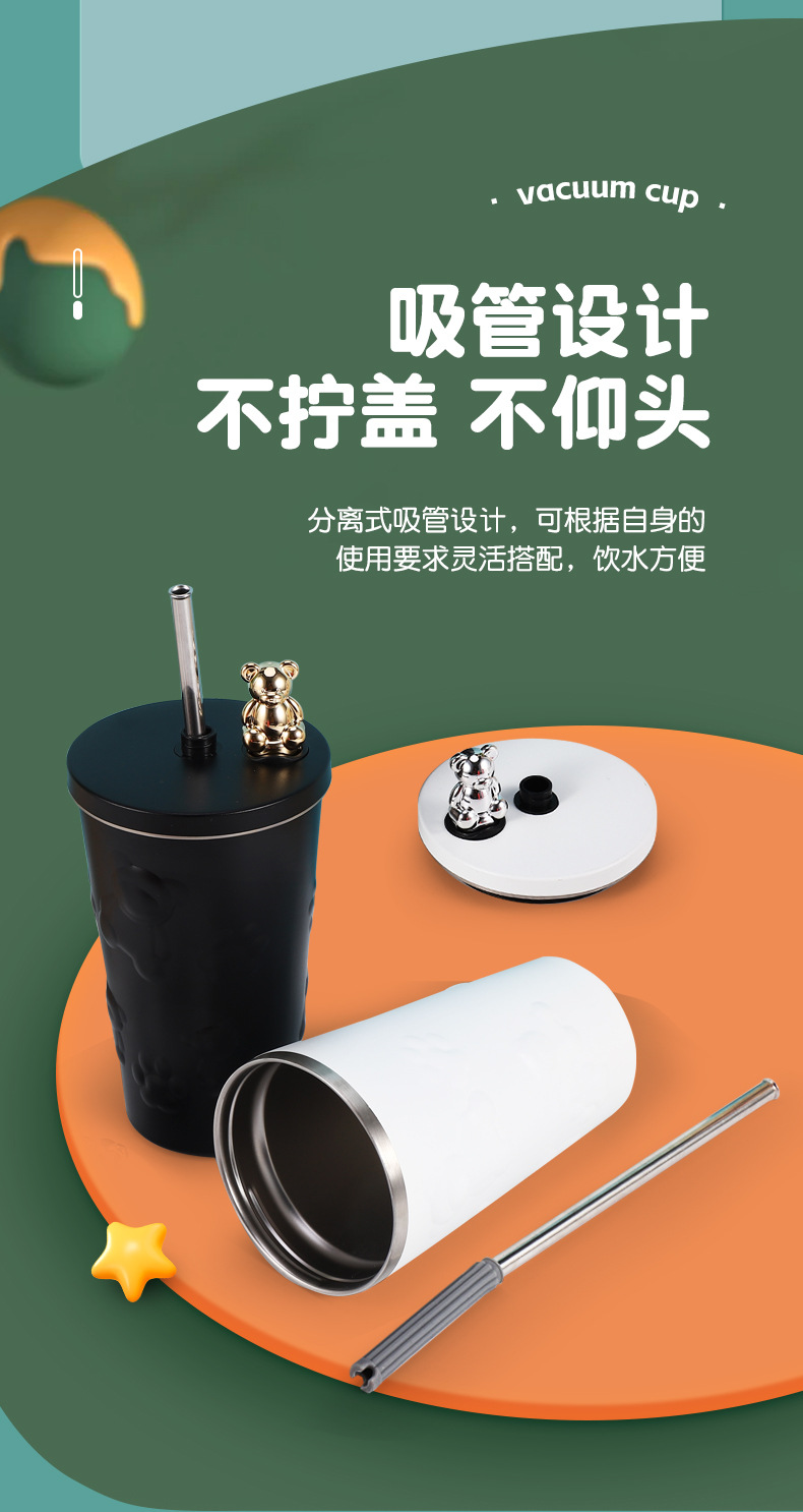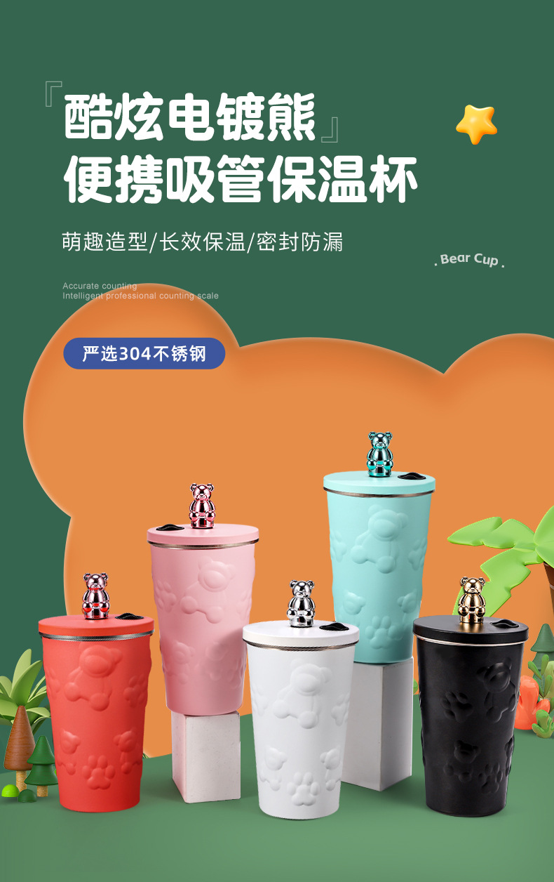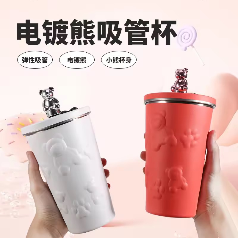 跨境304不锈钢保温杯高颜值卡通电镀熊咖啡吸管杯大容量随手杯