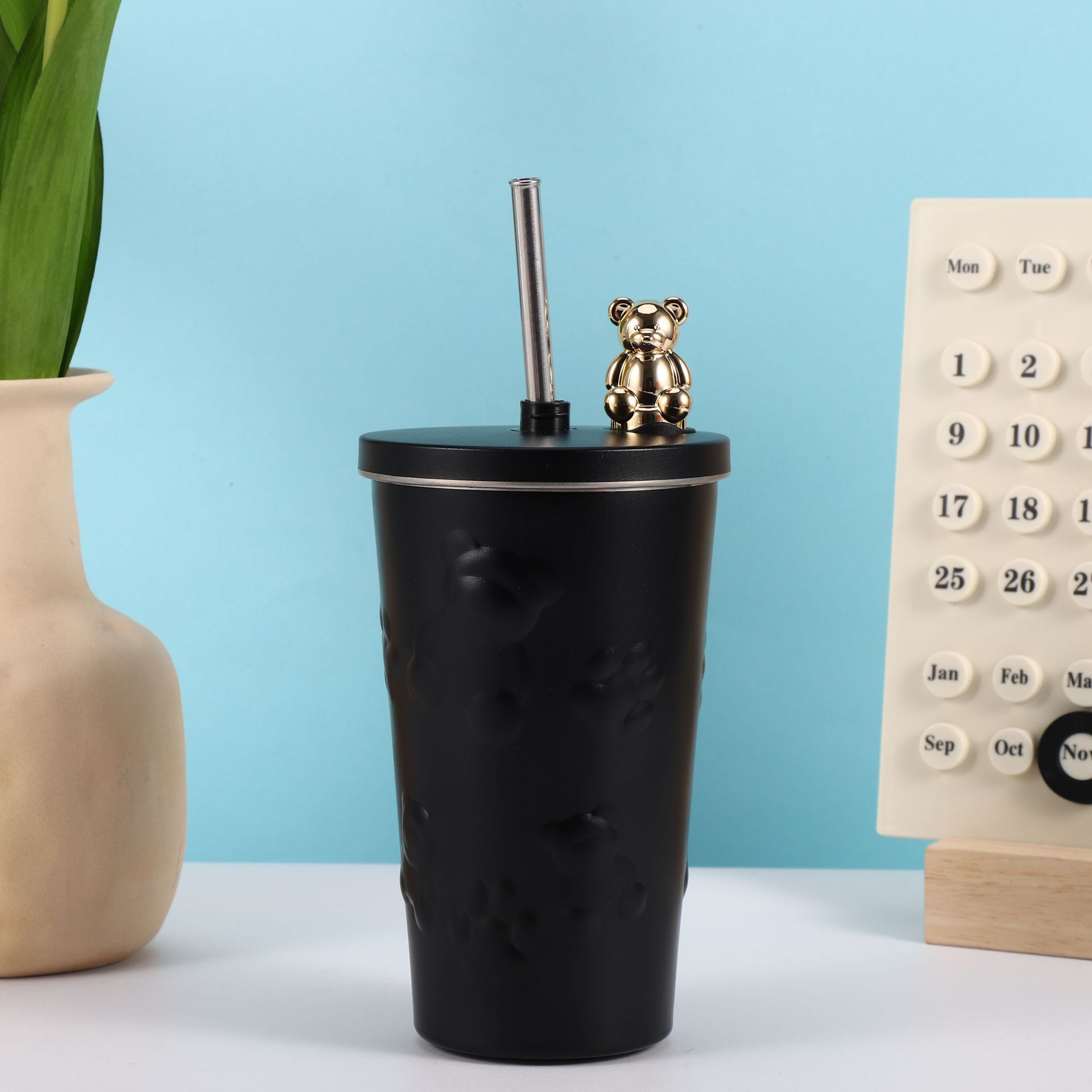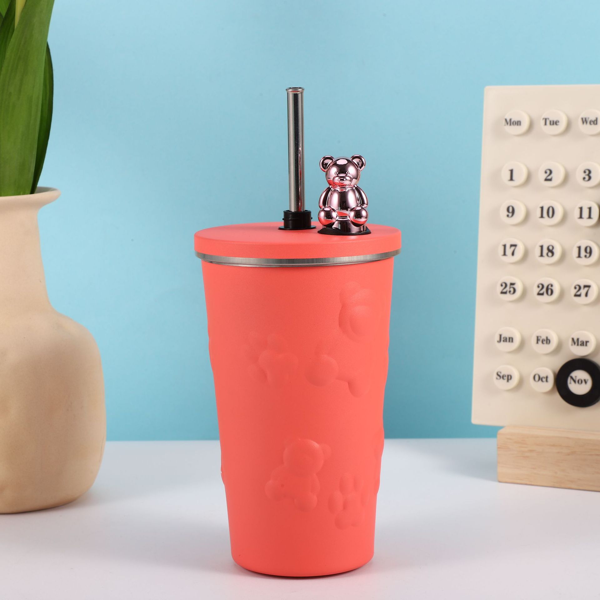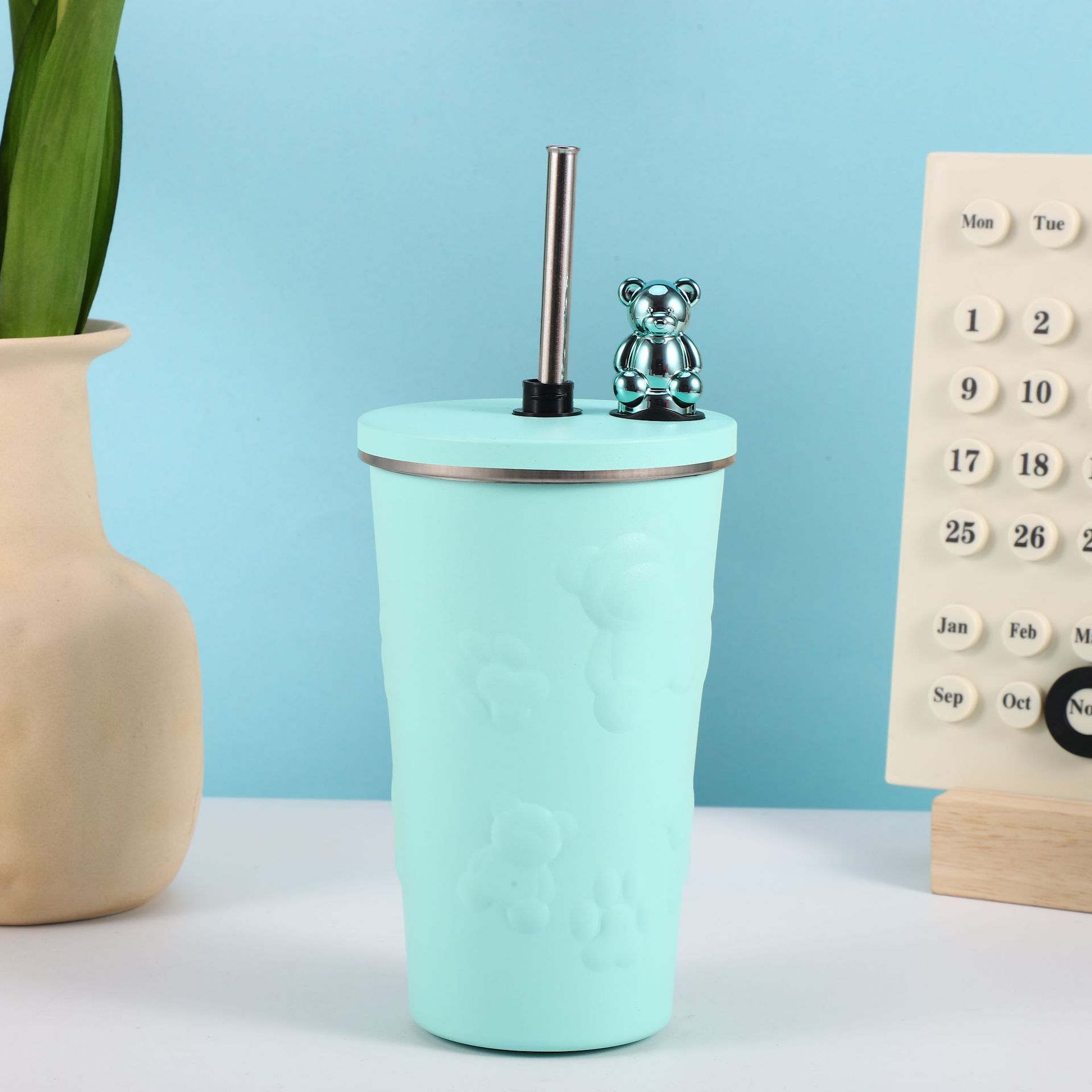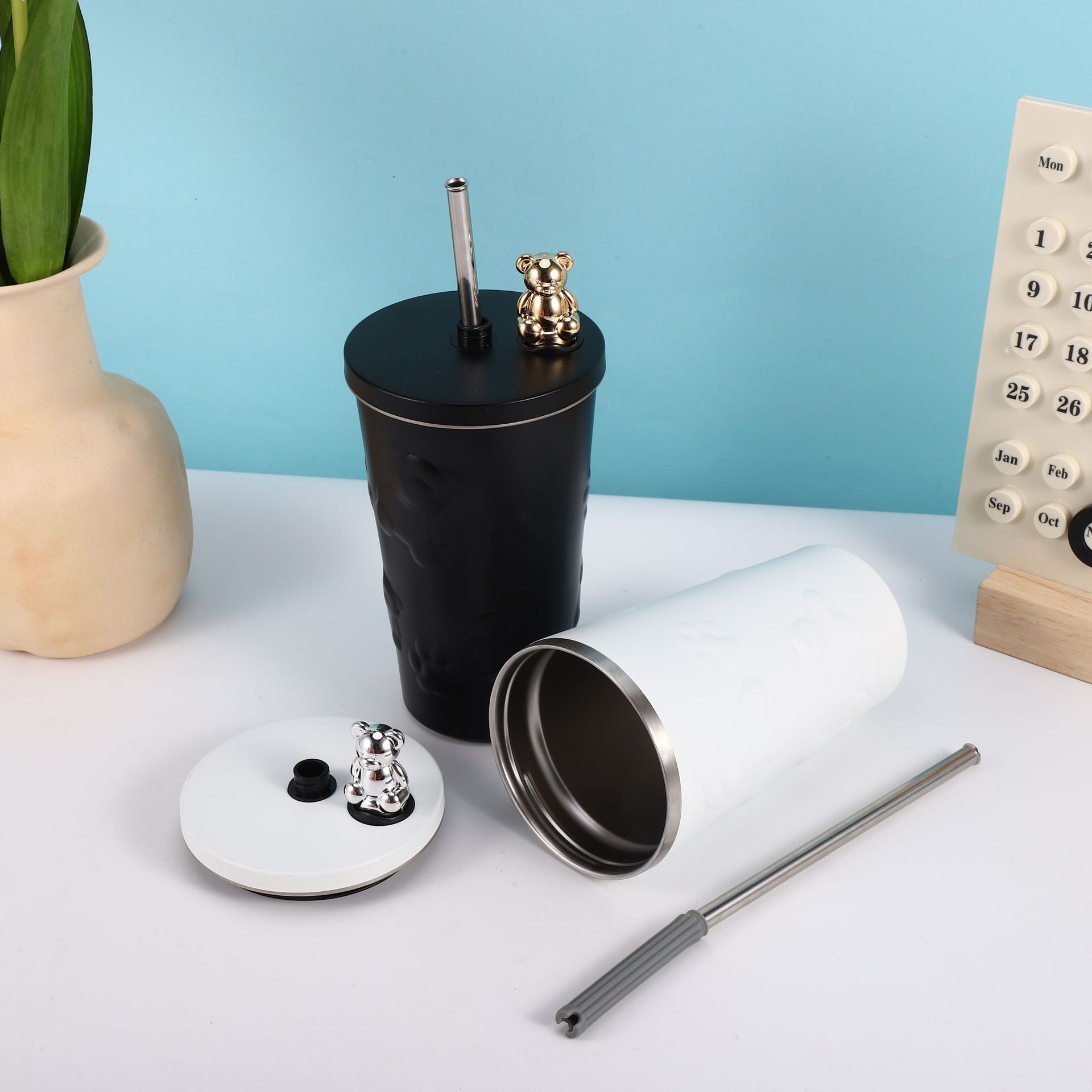 跨境304不锈钢保温杯高颜值卡通电镀熊咖啡吸管杯大容量随手杯