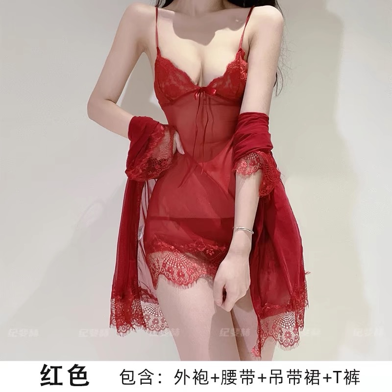 情趣内衣大码三件套性感诱惑蕾丝花边薄纱吊带睡裙套装外贸带外袍