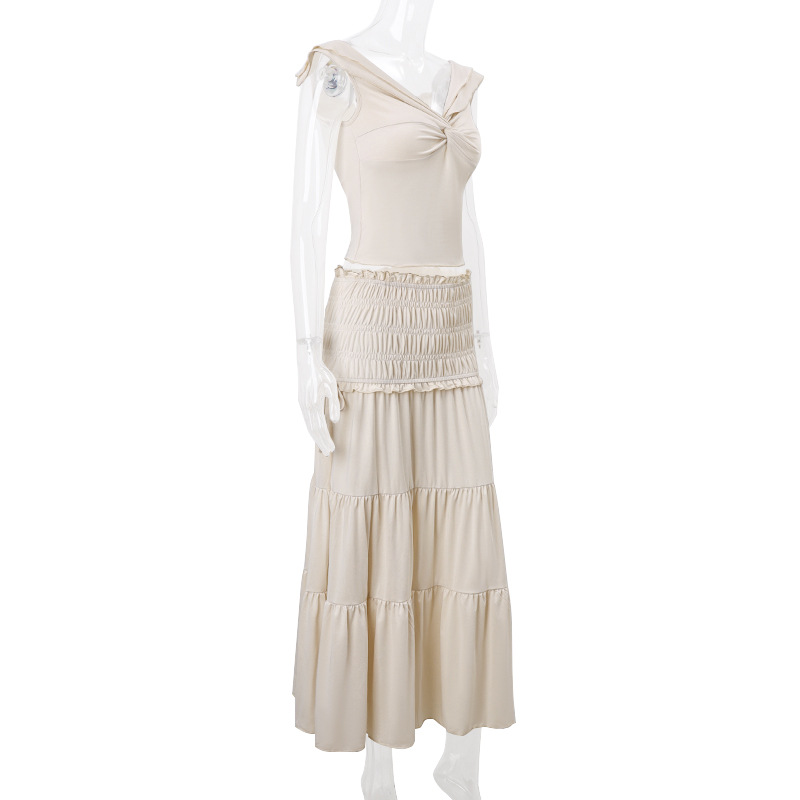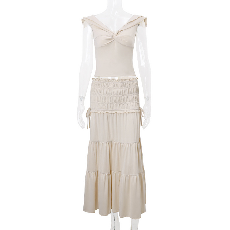 2024夏季新款女装性感露脐低胸短款背心法式气质褶皱半身裙套装女