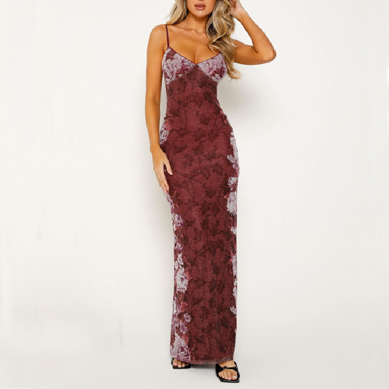 外贸亚马逊2024夏季新款女装欧美复古印花高级感吊带连衣裙晚礼服