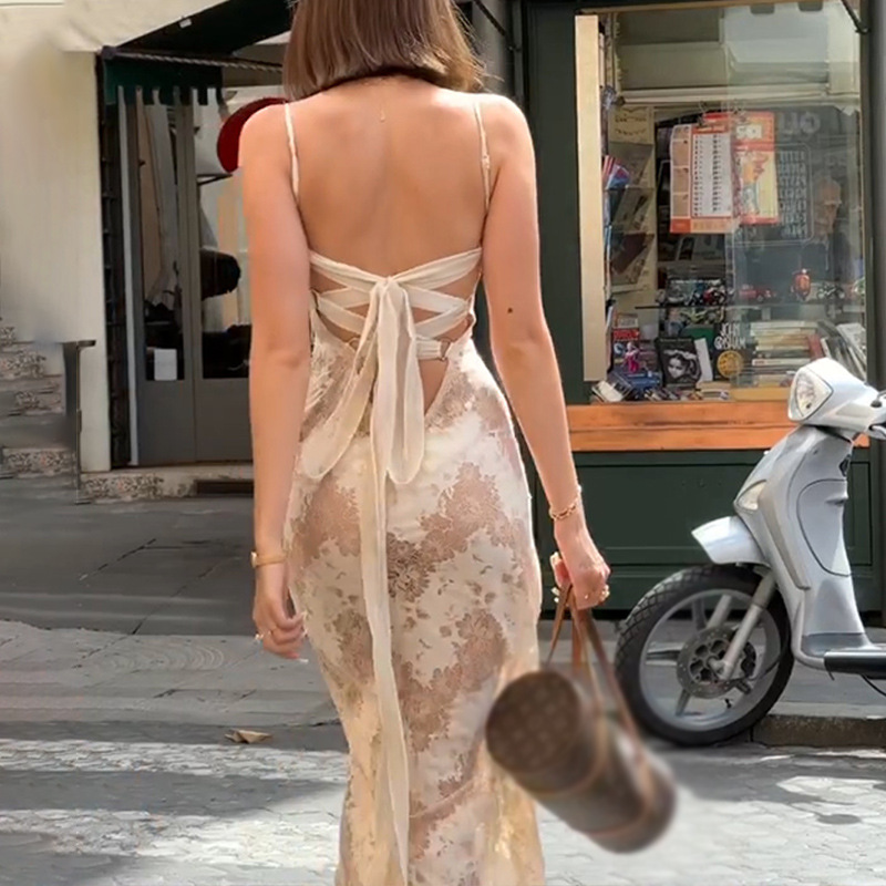 亚马逊2024夏季新款女装度假风性感背带高级气质印花吊带连衣裙女