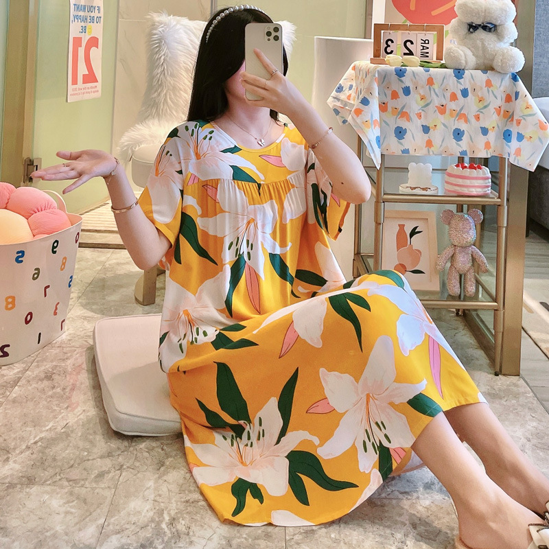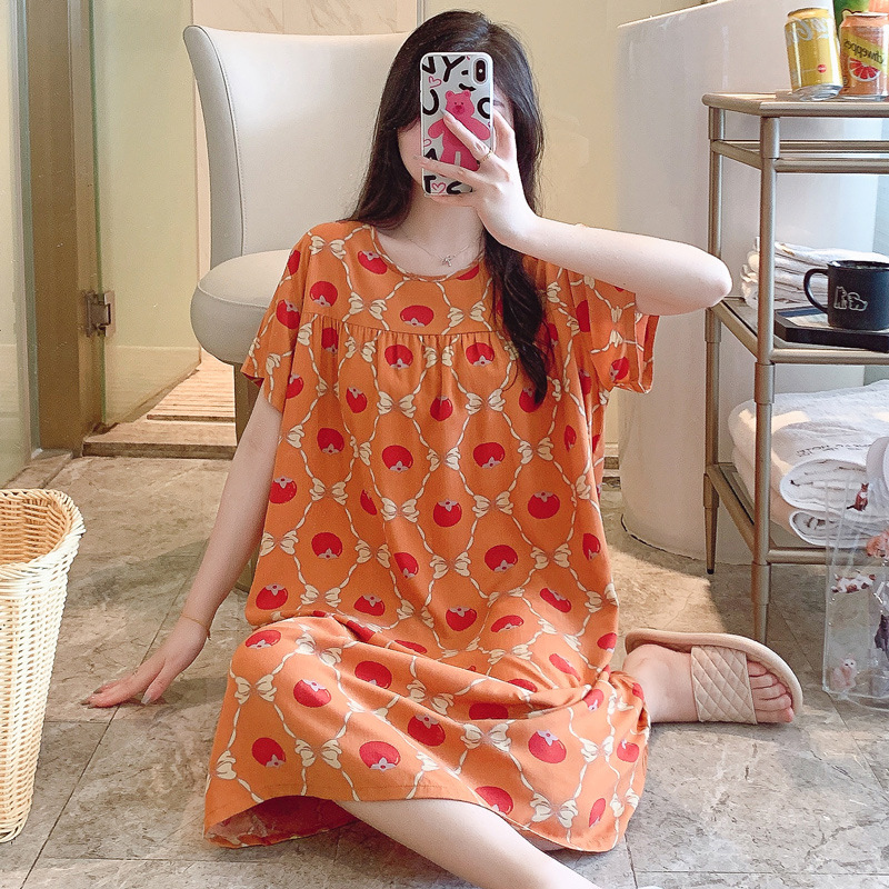 棉绸睡裙女夏季2024新款短袖卡通连衣裙欧版春秋大码宽松绵绸睡衣