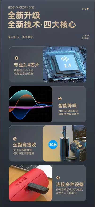 比较无线领夹麦克风的品质,主要从收音距离,收音稳定性,是否降噪,是否有杂音等去判断。欢迎客户下单拿样,从各个方面去评判我们的产品品质!