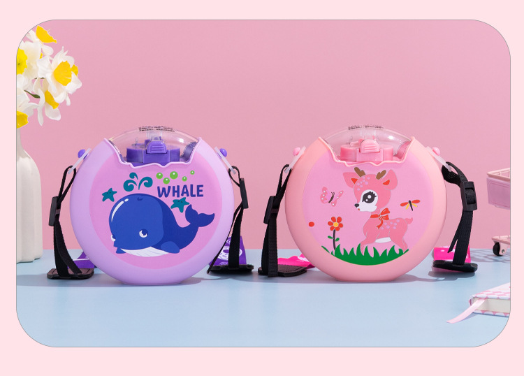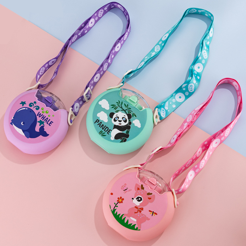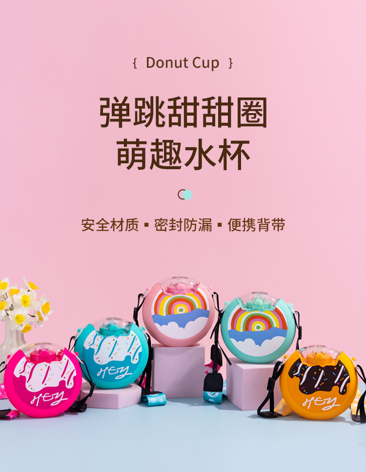 卡通甜甜圈水杯防摔硅胶吸管杯儿童便携斜背带塑料杯宝贝礼品水壶