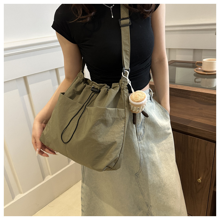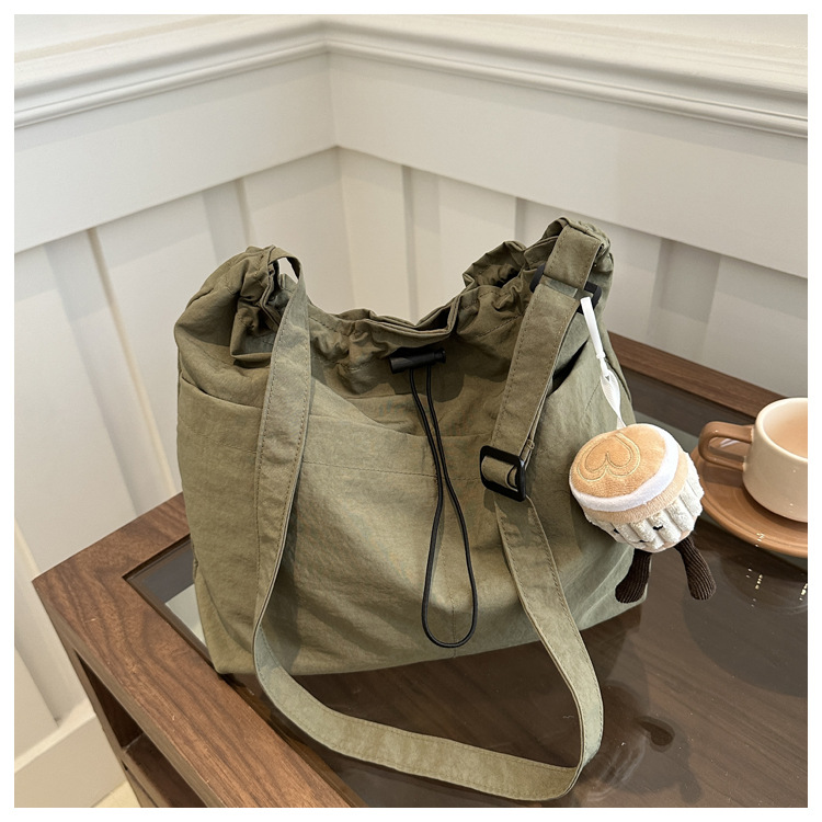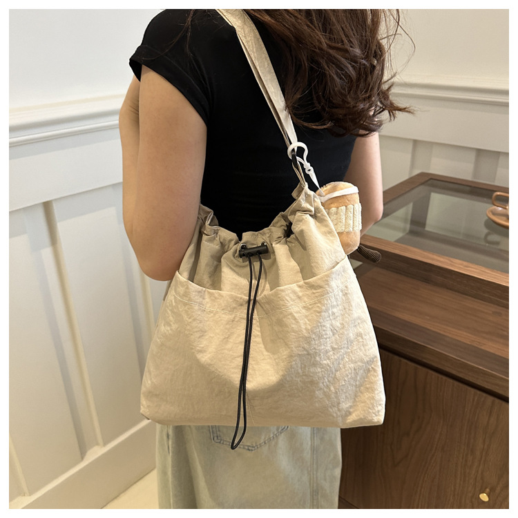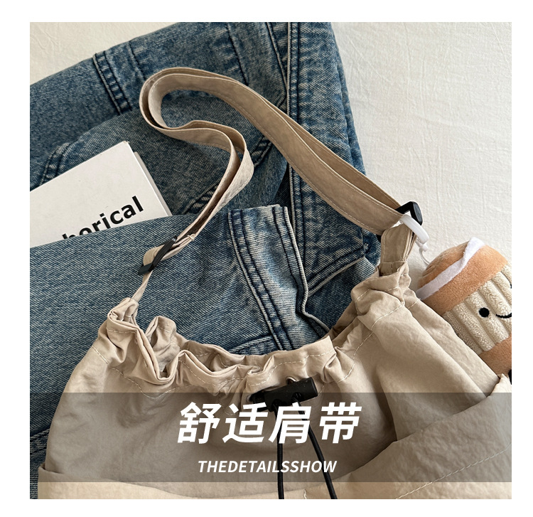 韩版小众休闲文艺帆布水桶包时尚抽绳单肩女包网红褶皱尼龙斜挎包