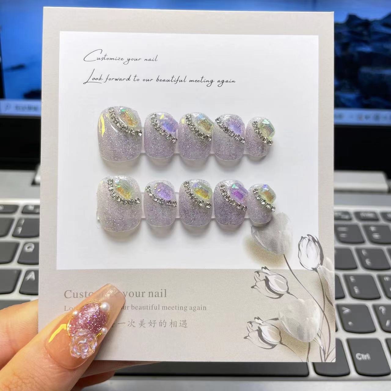 333纯手工光疗穿戴甲杏仁甲满钻山茶花穿戴甲成品重复使用美甲
