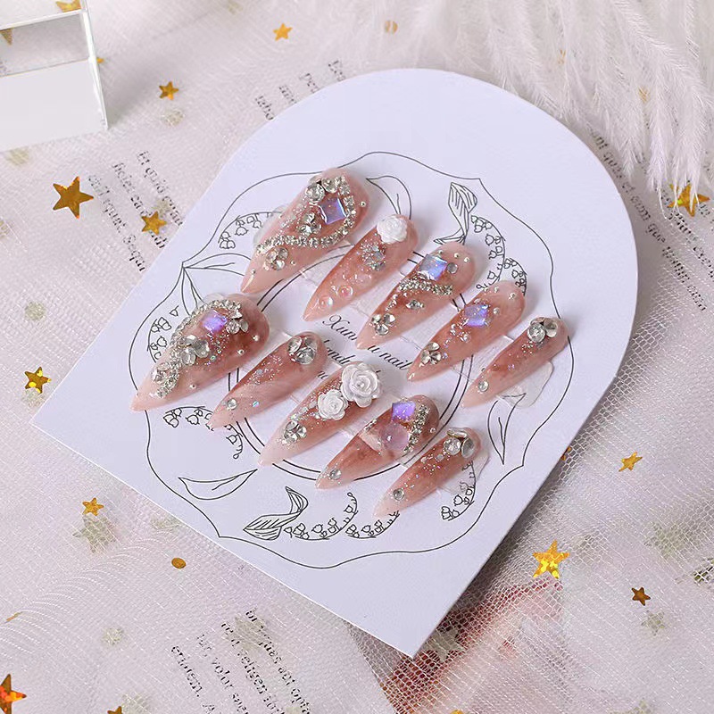 纯手工光疗穿戴甲 杏仁甲满钻山茶花穿戴甲批发成品重复使用美甲