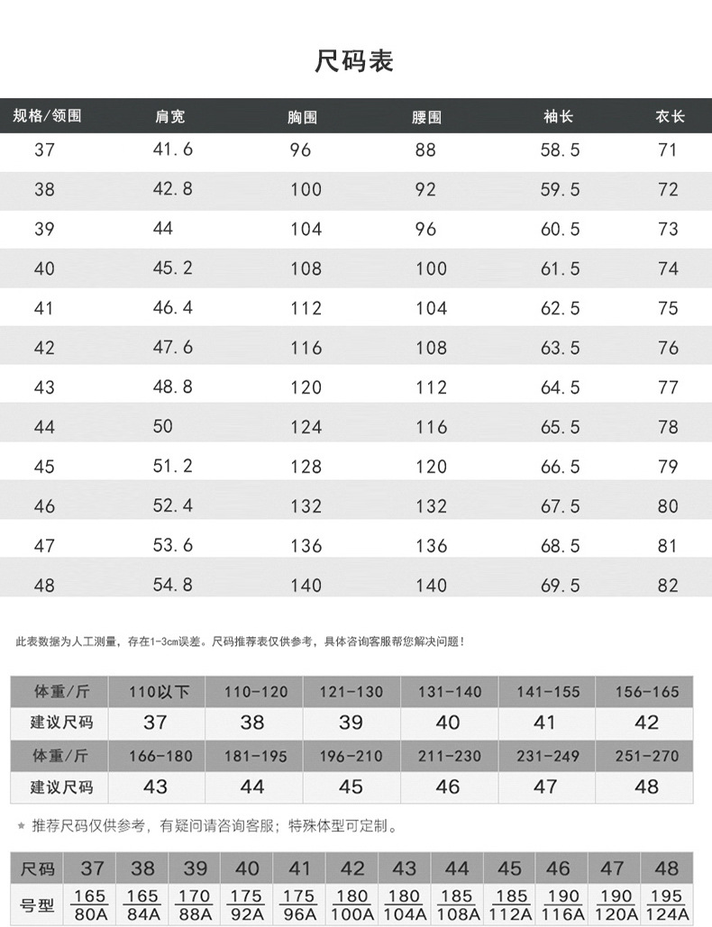 | 38 (47.50 kg-55.00 kg(38(95-110斤)) | USD $0.0 | 996 piece available |