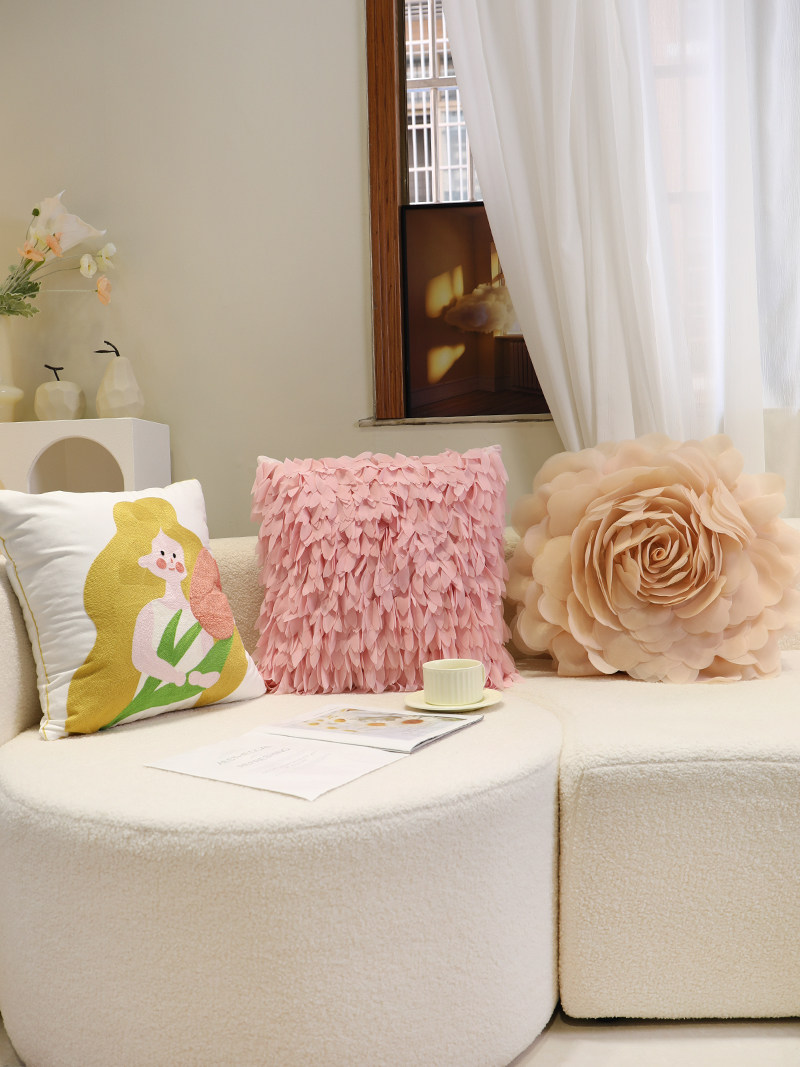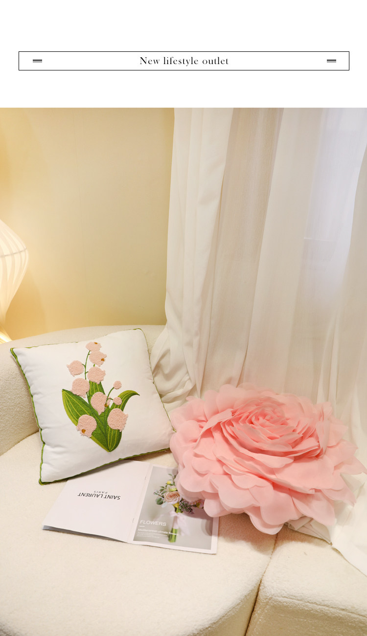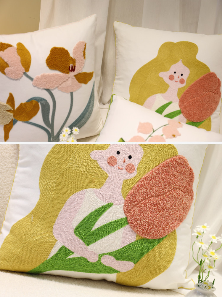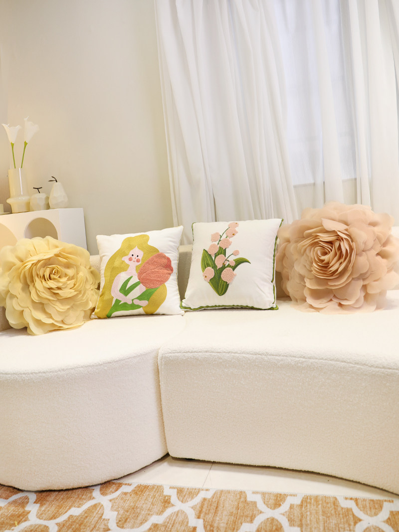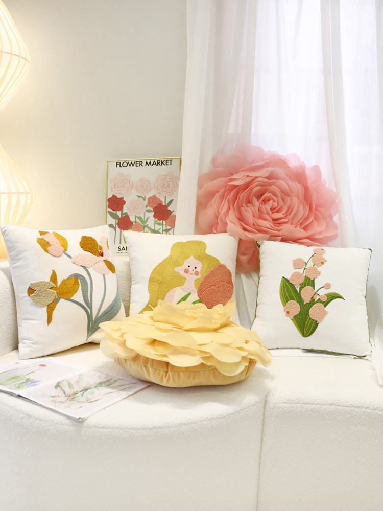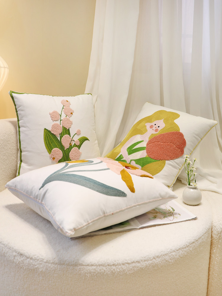 新款奶油风抱枕套卧室靠垫套简约花朵刺绣郁金香软装方形布艺靠枕