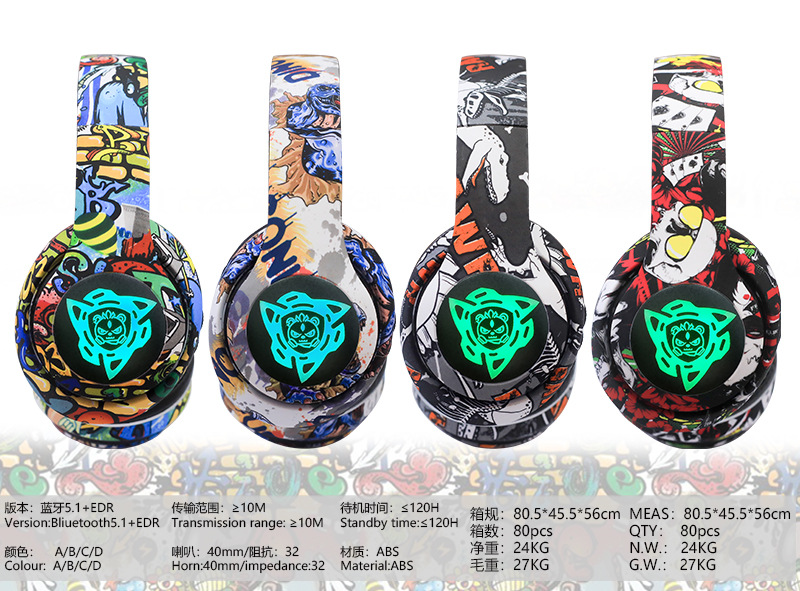P35跨境头戴式蓝牙耳机无线耳麦国潮涂鸦新款发光立体声音乐运动
