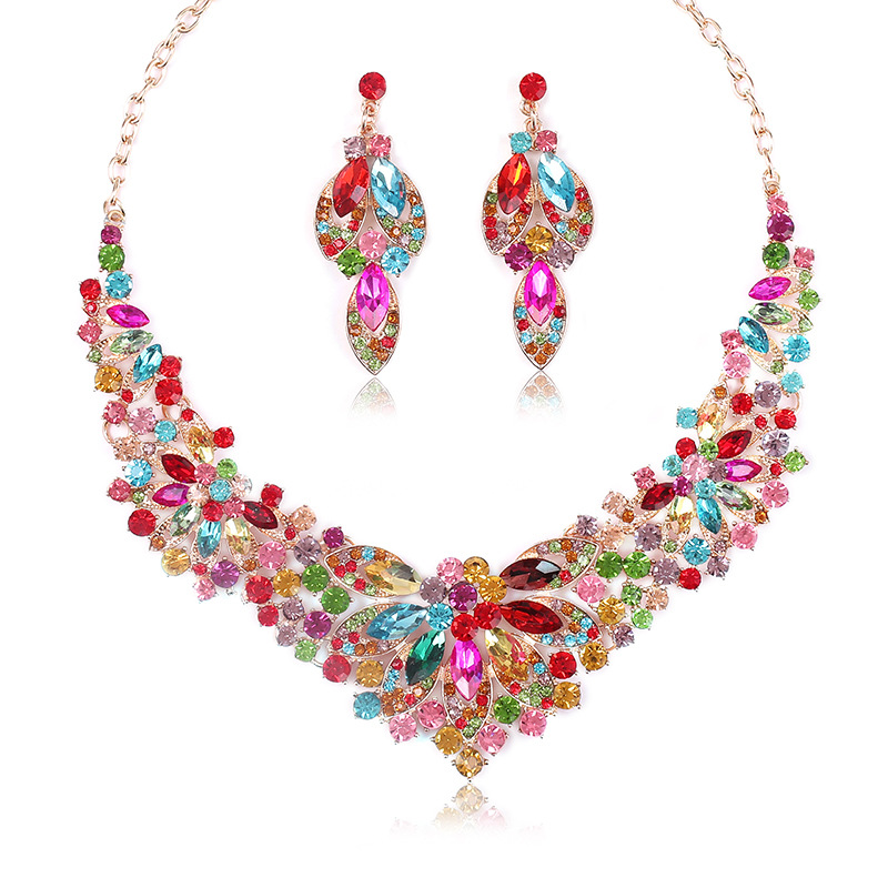 跨境礼服首饰直销欧美项链耳环两件套彩色花朵新娘复古高级设计感