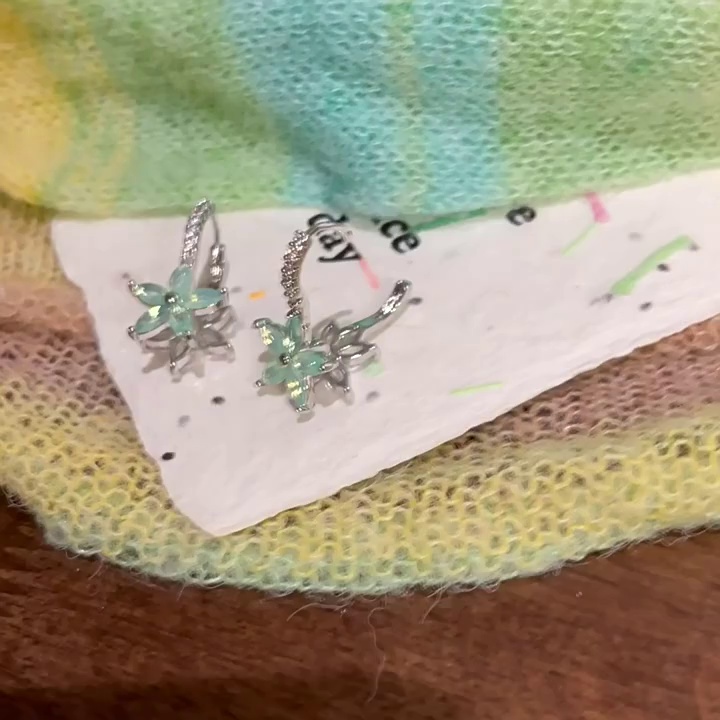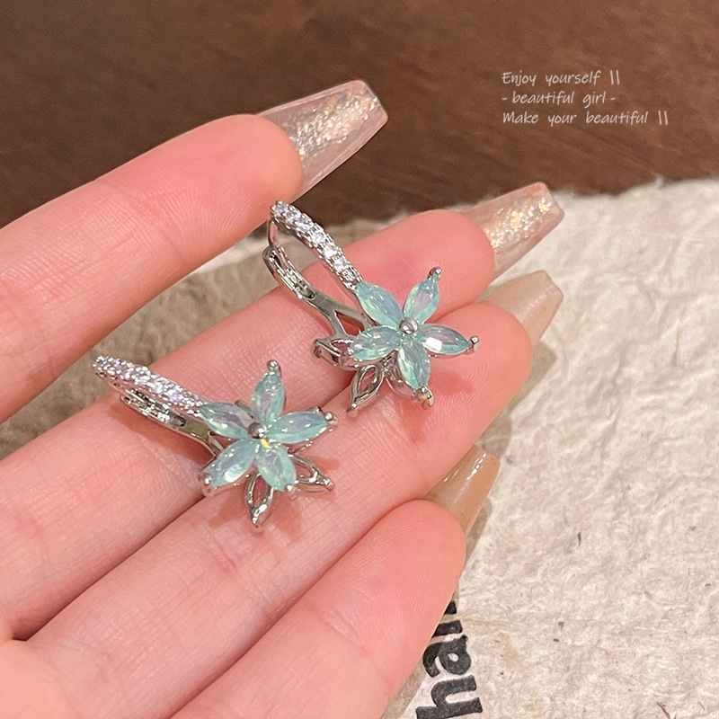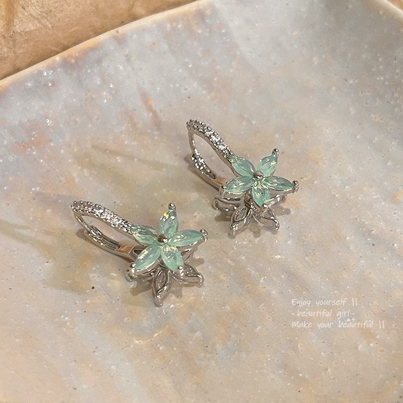 饰品轻奢小众薄荷绿花朵耳钉耳饰新款精致锆石双面花朵耳扣耳钉女
