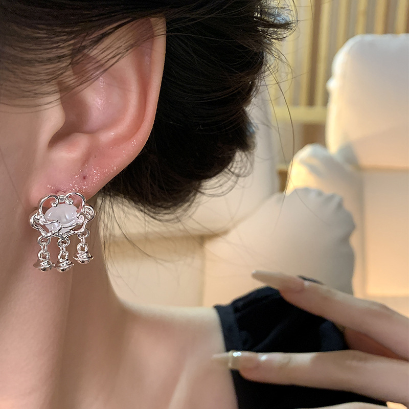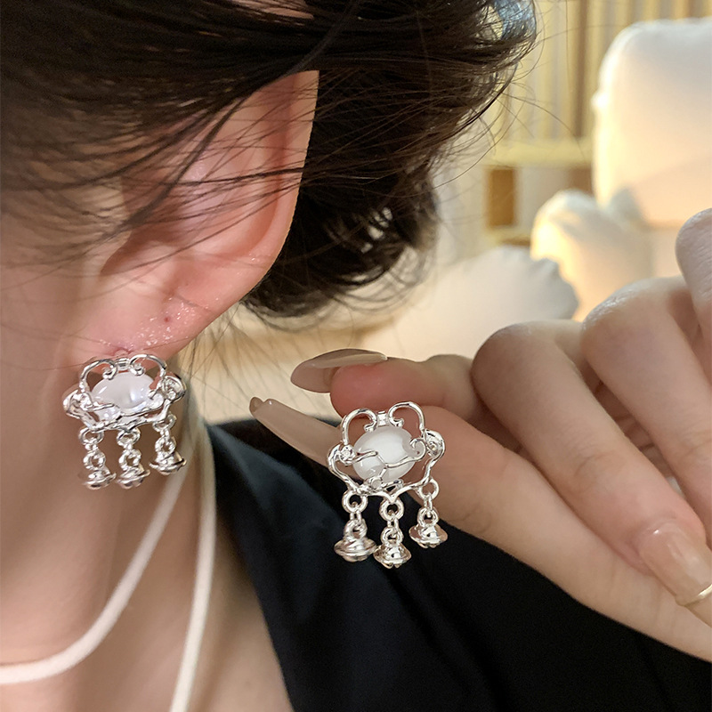 饰品小众搞几个文艺气质猫眼石耳环S925银针新中式复古平安锁耳钉