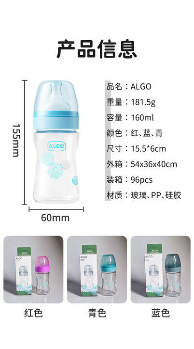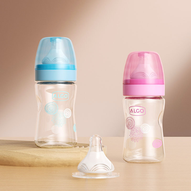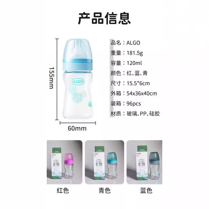 ALGO婴儿玻璃奶瓶食品级宽口径耐摔防胀气新生儿120ml玻璃奶瓶
