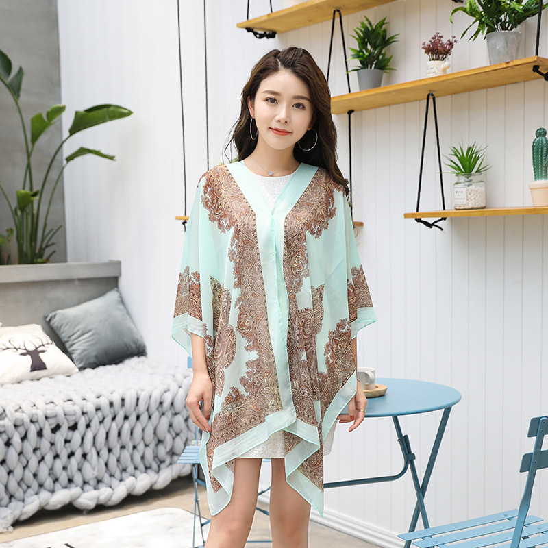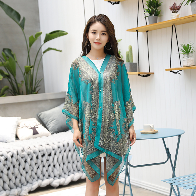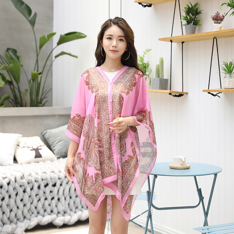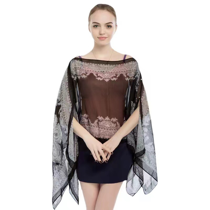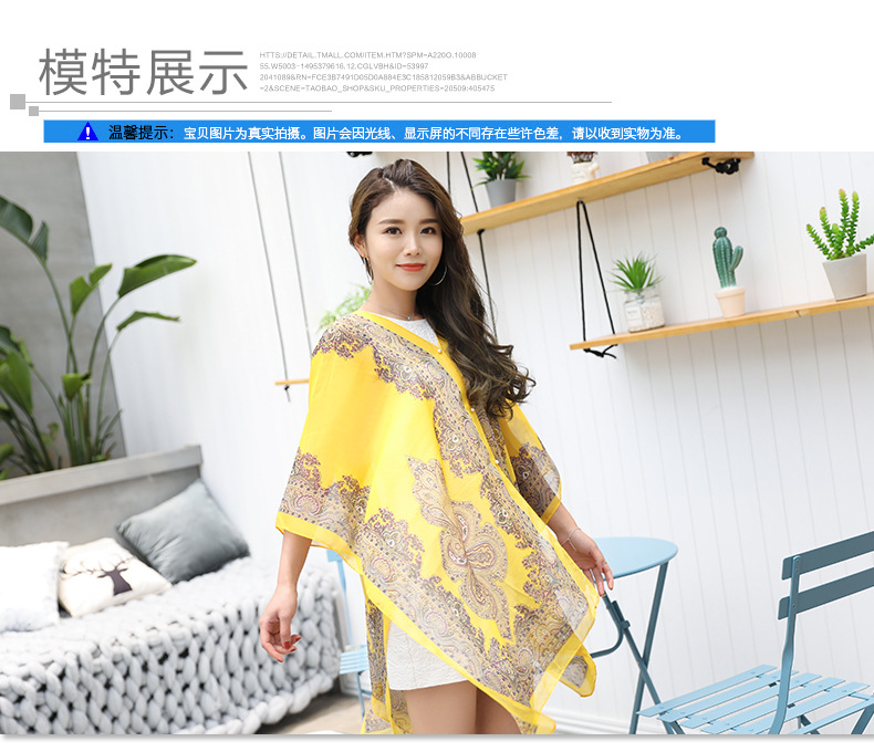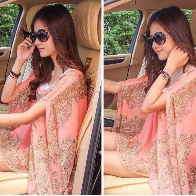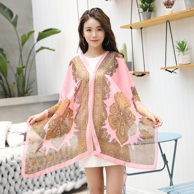 防晒披肩骑车沙滩多用百变丝巾雪纺印花防紫外线腰果花订珍珠披肩