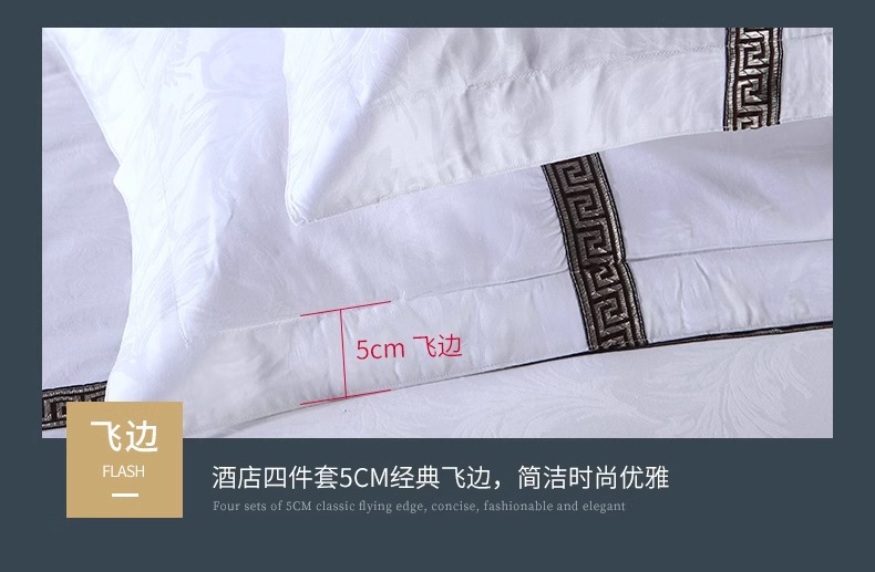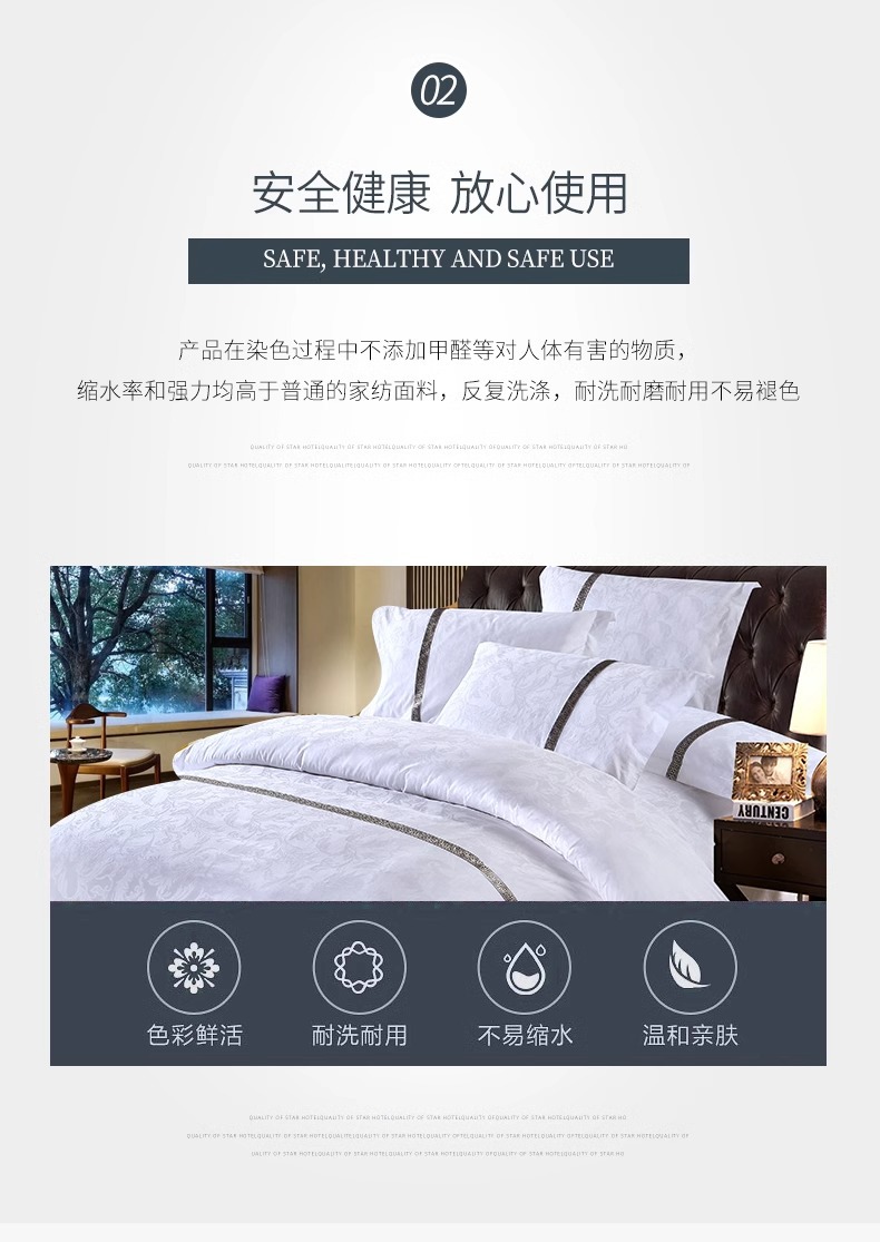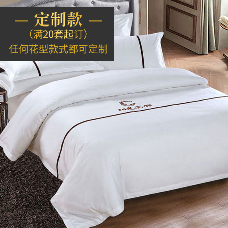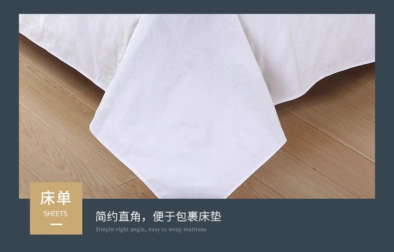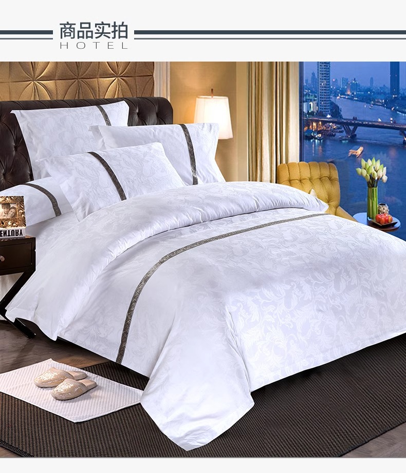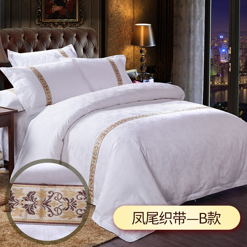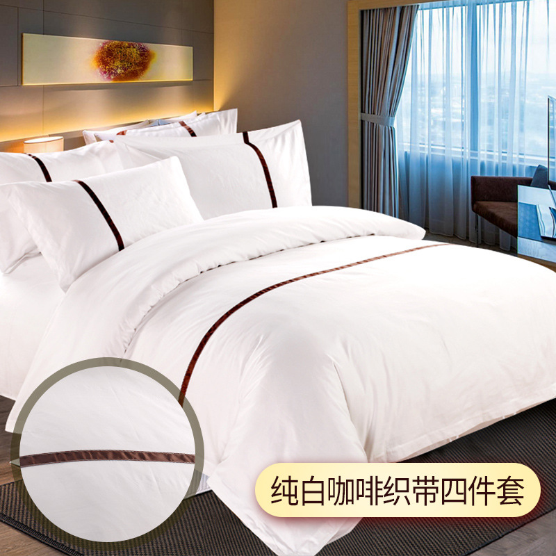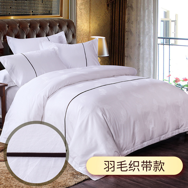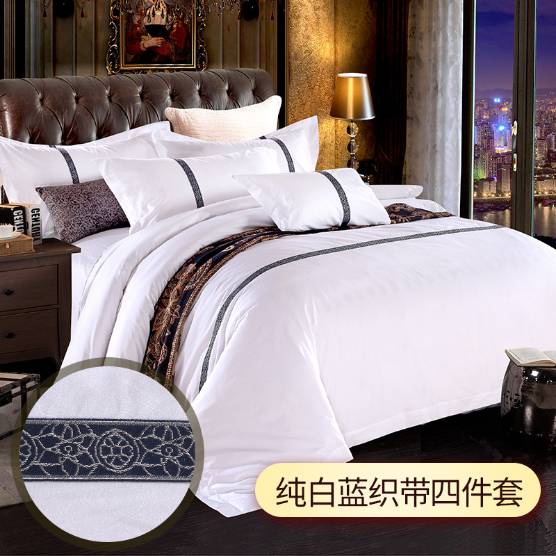 酒店布草全棉贡缎提花四件套织带款宾馆民宿床上用品白色床单被套