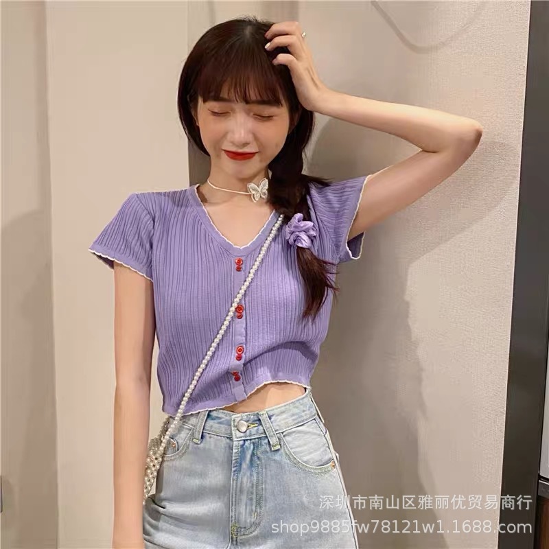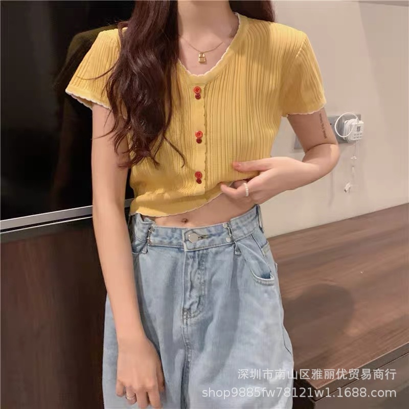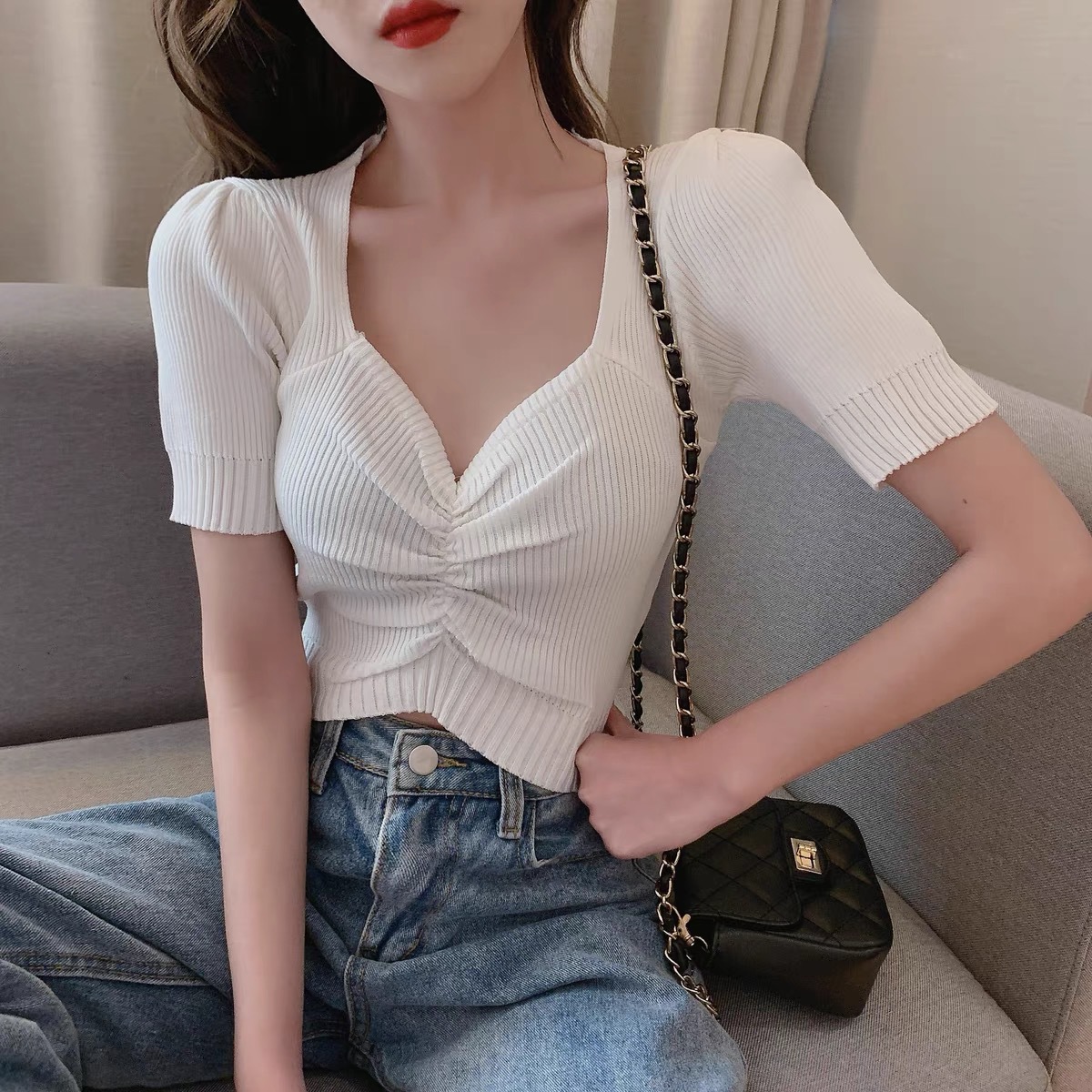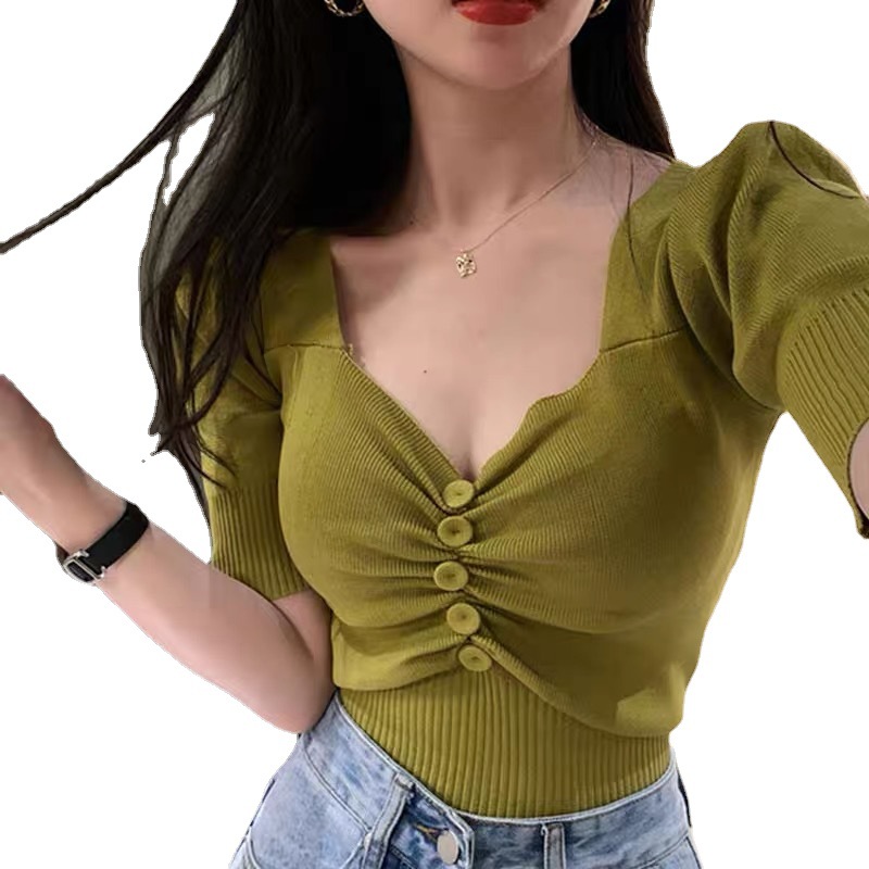 2025春夏新款法式短袖方领针织T恤女修身显瘦泡泡袖薄款高腰上衣