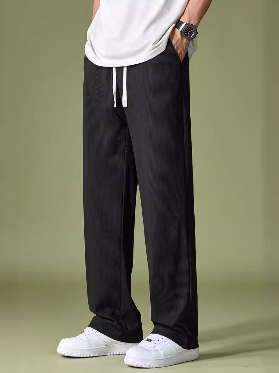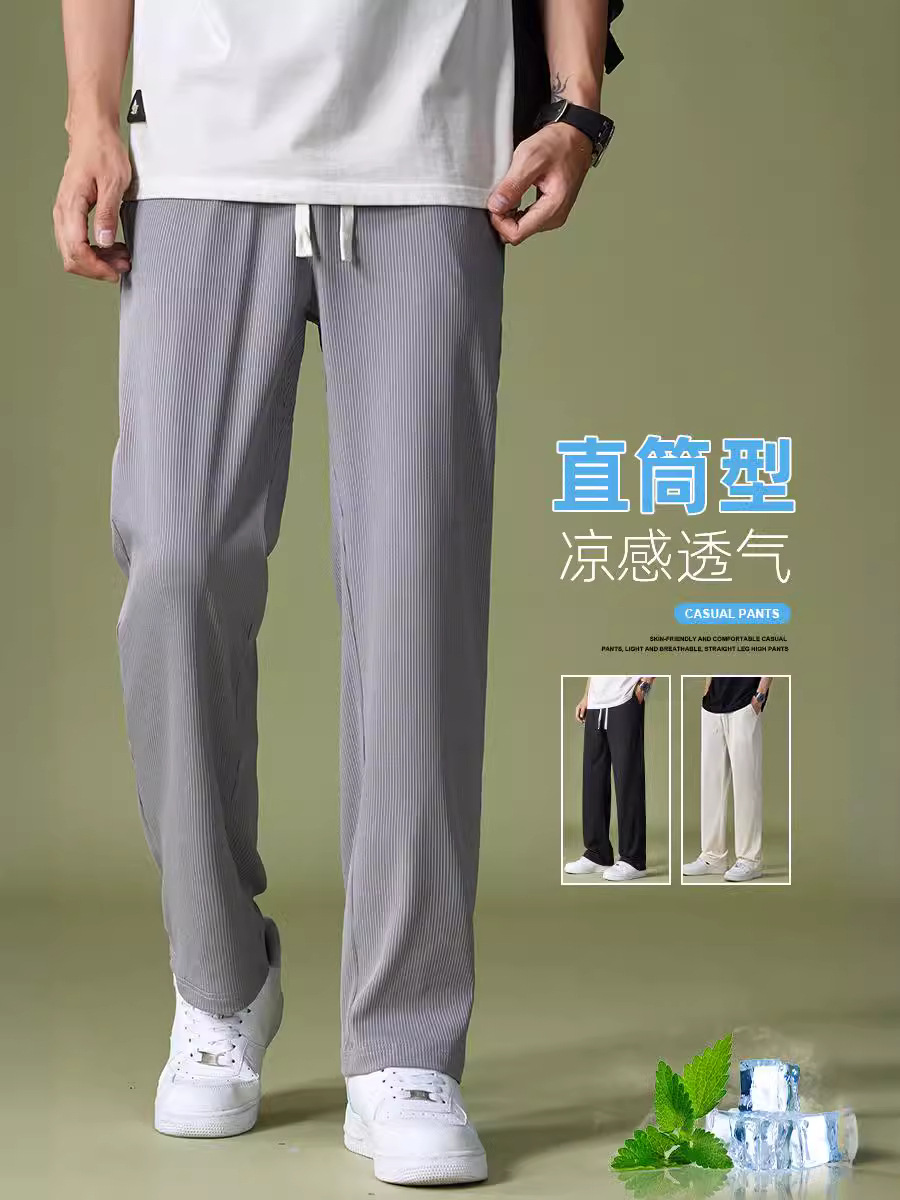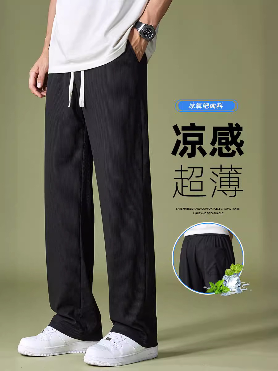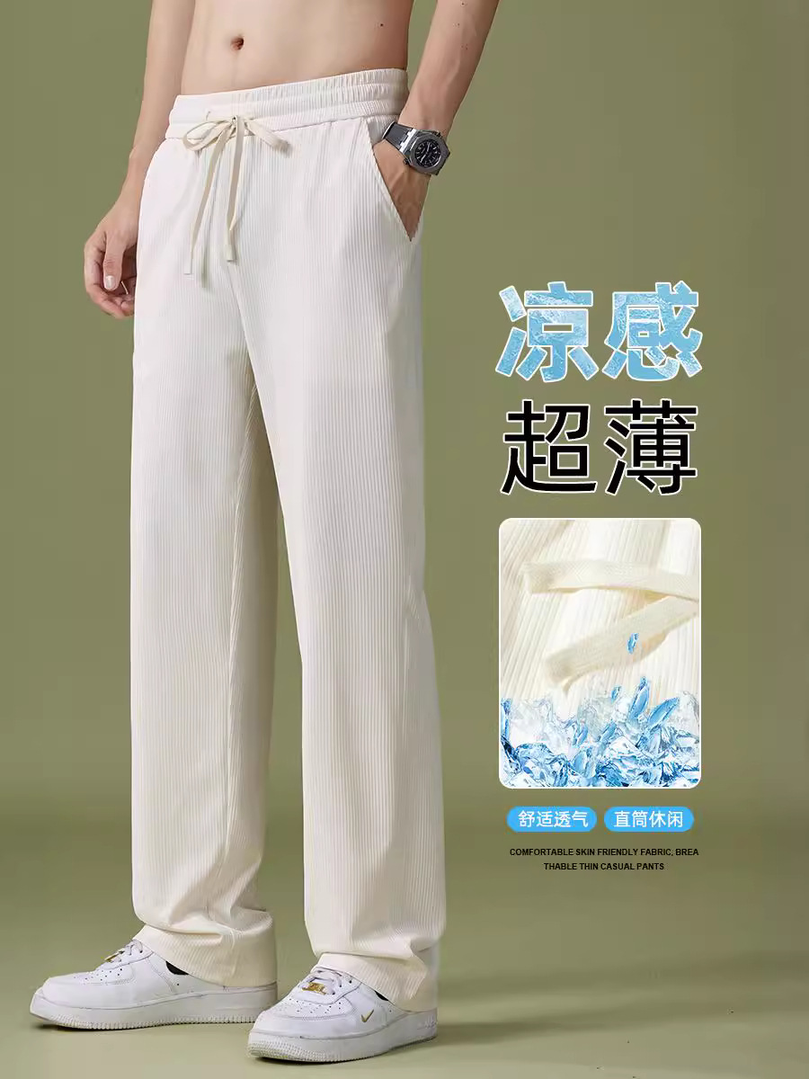 杏色冰丝超薄休闲裤男条纹夏季薄款免烫抗皱宽松直筒运动长裤裤子