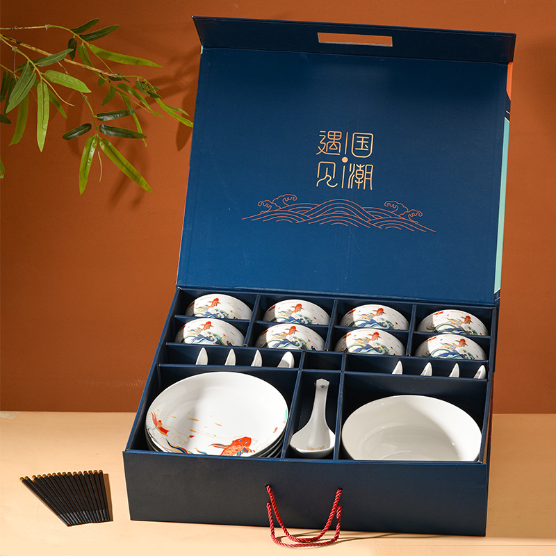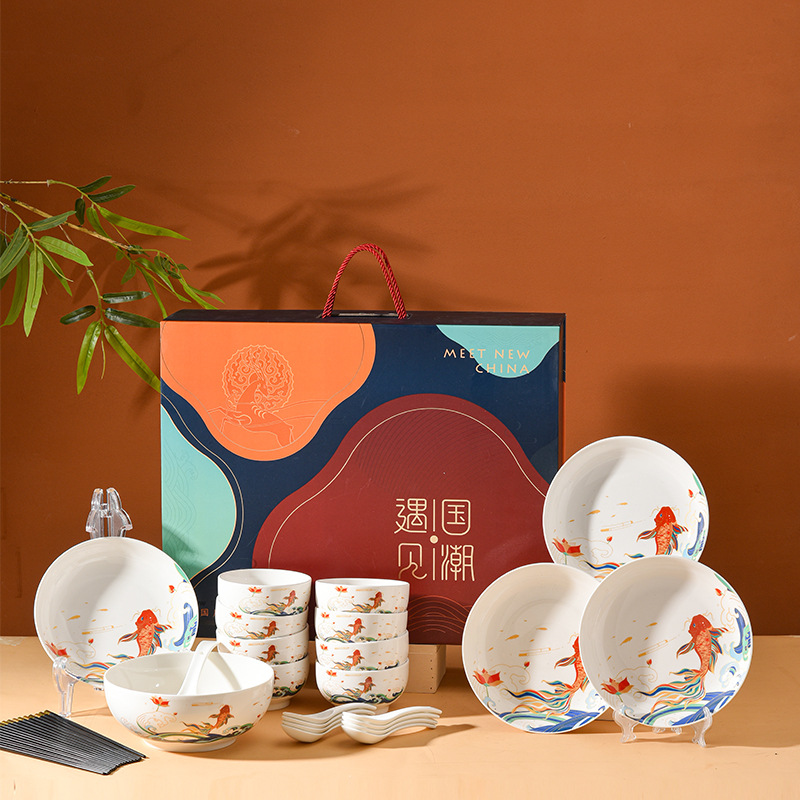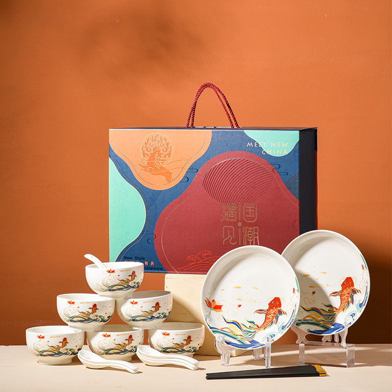 国潮陶瓷餐具碗碟盘套装 鱼跃龙门骨瓷碗筷礼盒装活动开业伴手礼
